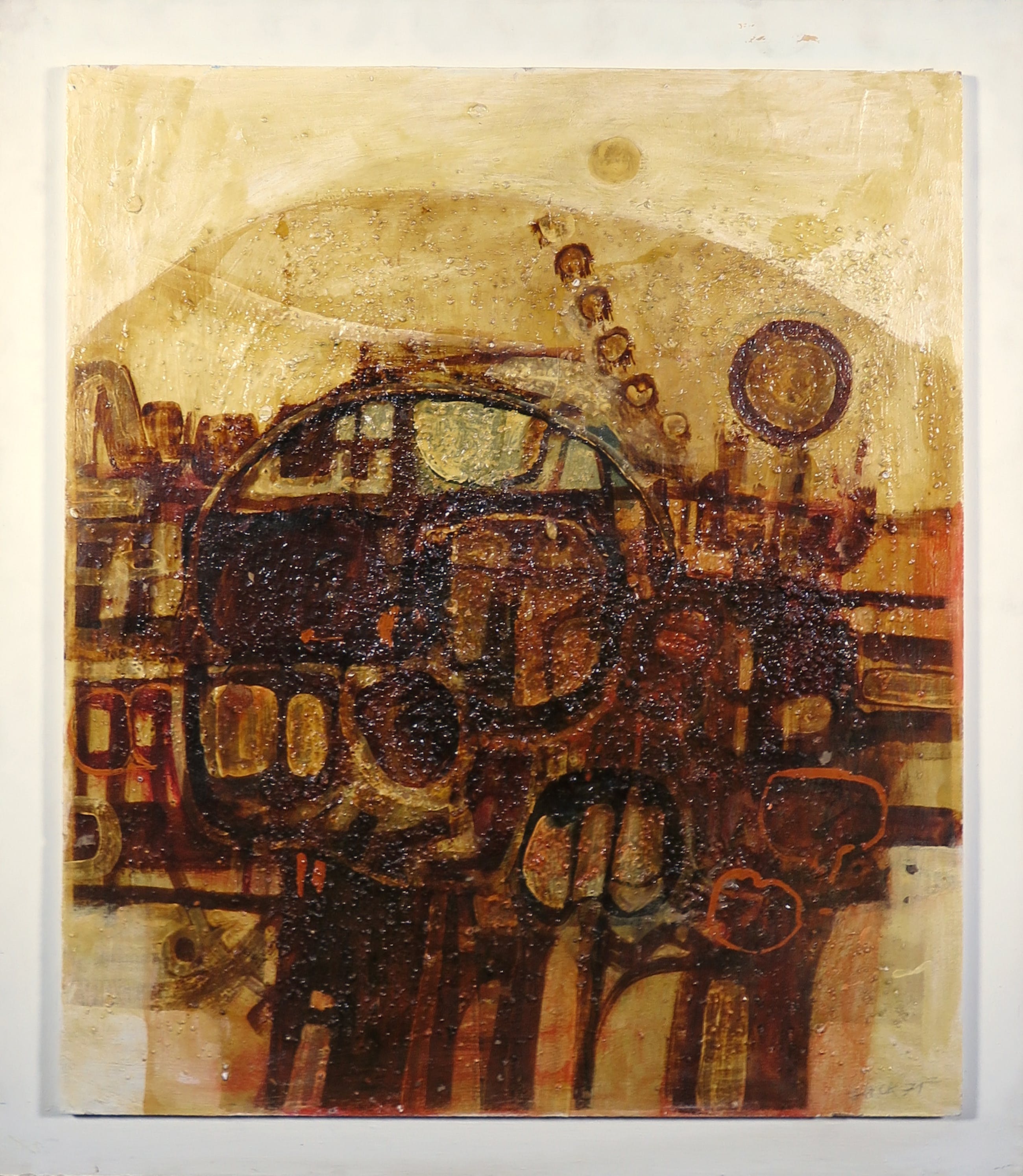 Dit kunstwerk bevat olieverf, acrylverf en cellulose. Dit geeft enige diepte in het kunstwerk. Aan de achterzijde van het werk is een tekst geschreven. Let op, dit werk is zwaar.