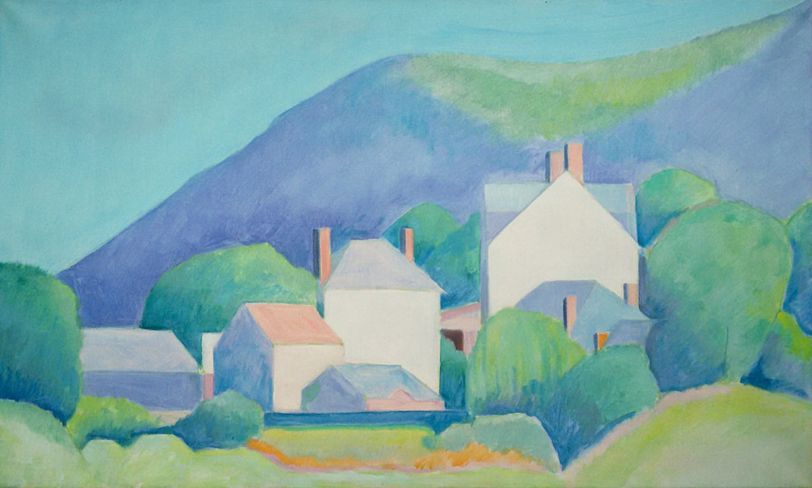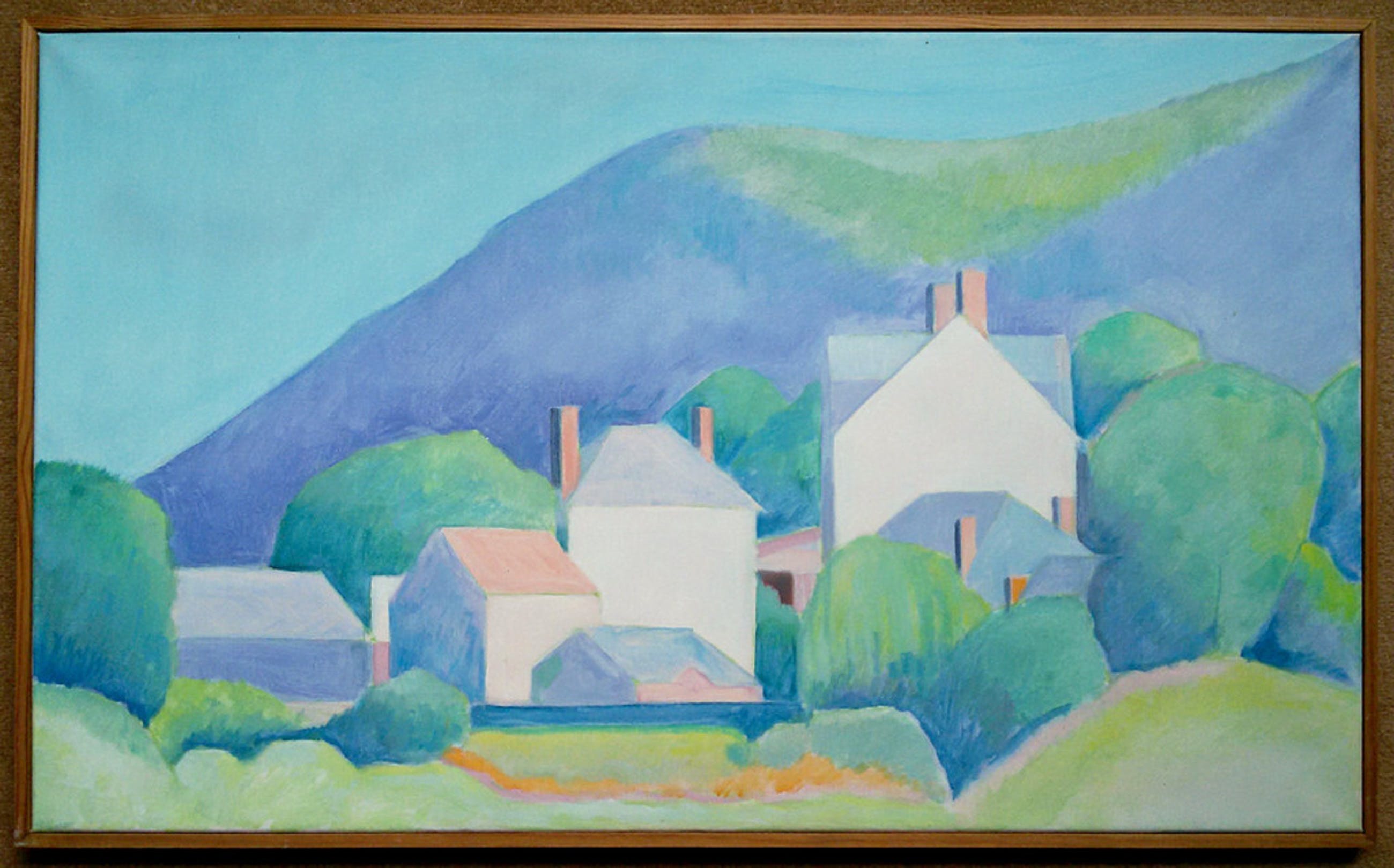 Kleurrijk landschap uit 1991 van Jack Hellinga. Olieverf op doek, niet gesigneerd maar wel met (door Hellinga zelf?) handgeschreven label in verso (zie foto), in eenvoudige lijst. Alles in zeer goede conditie.