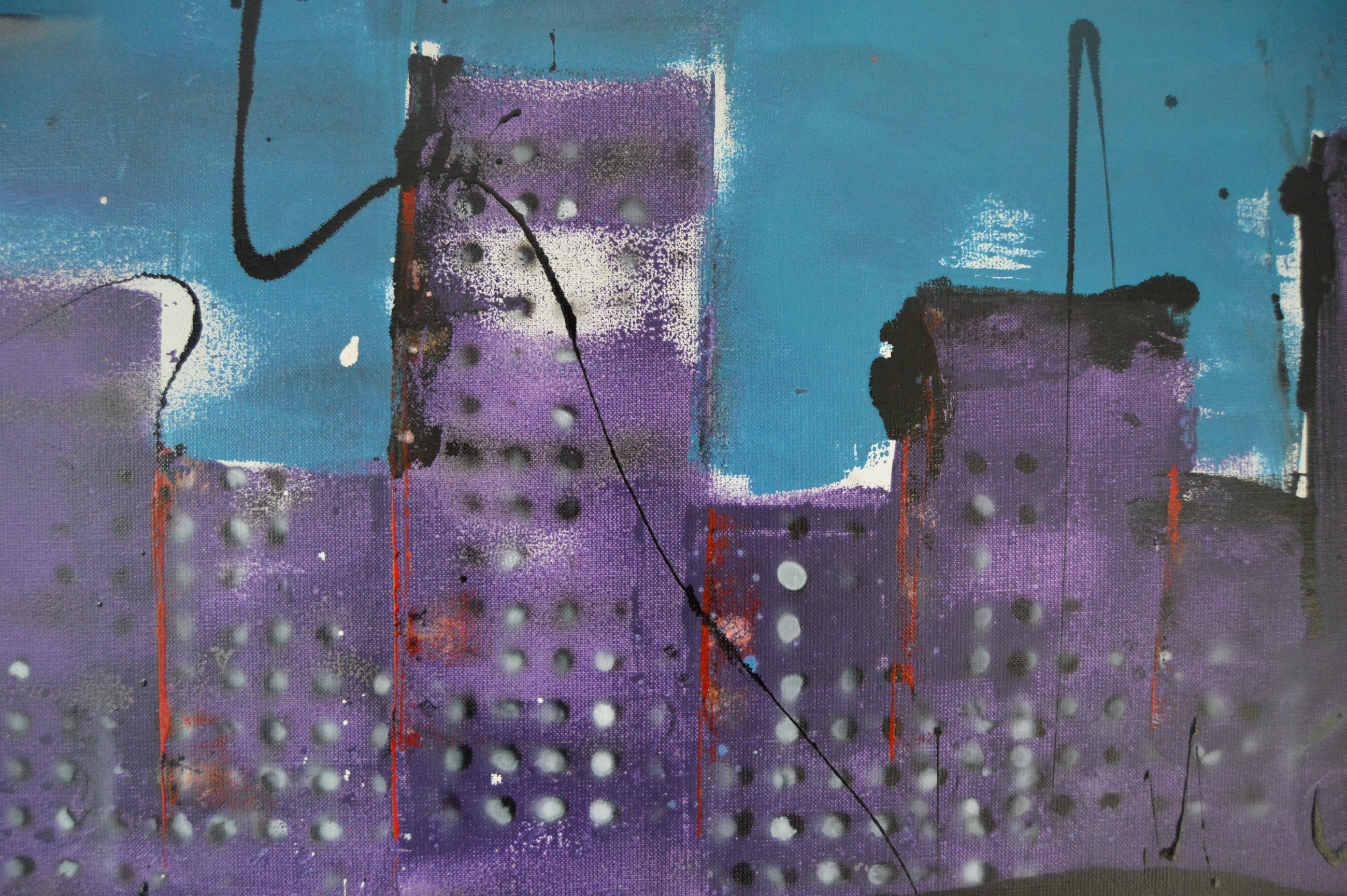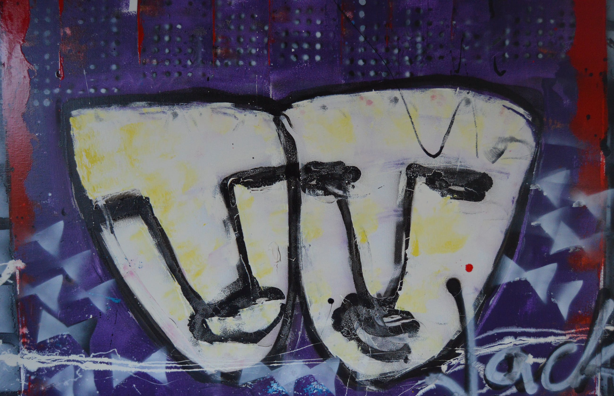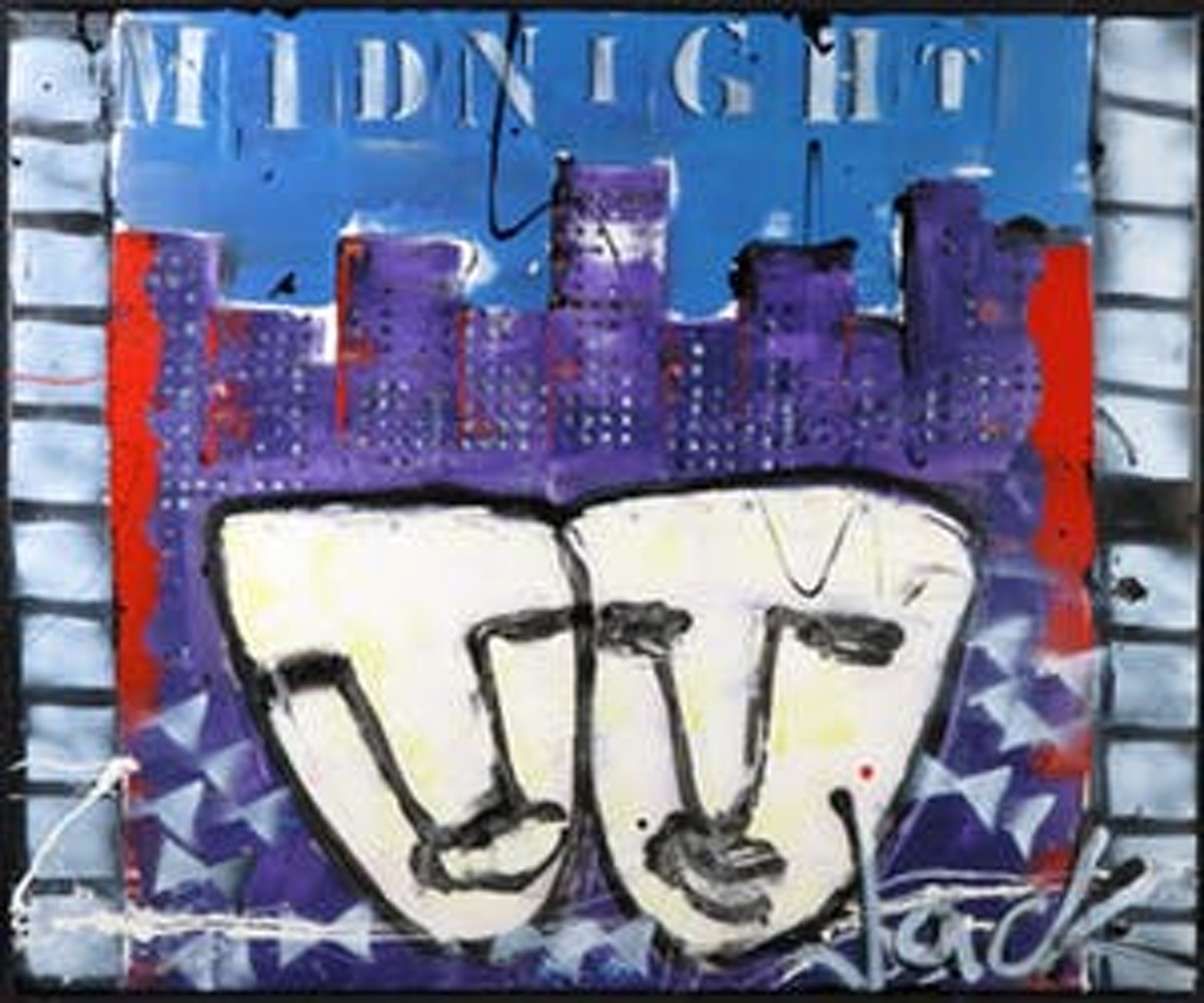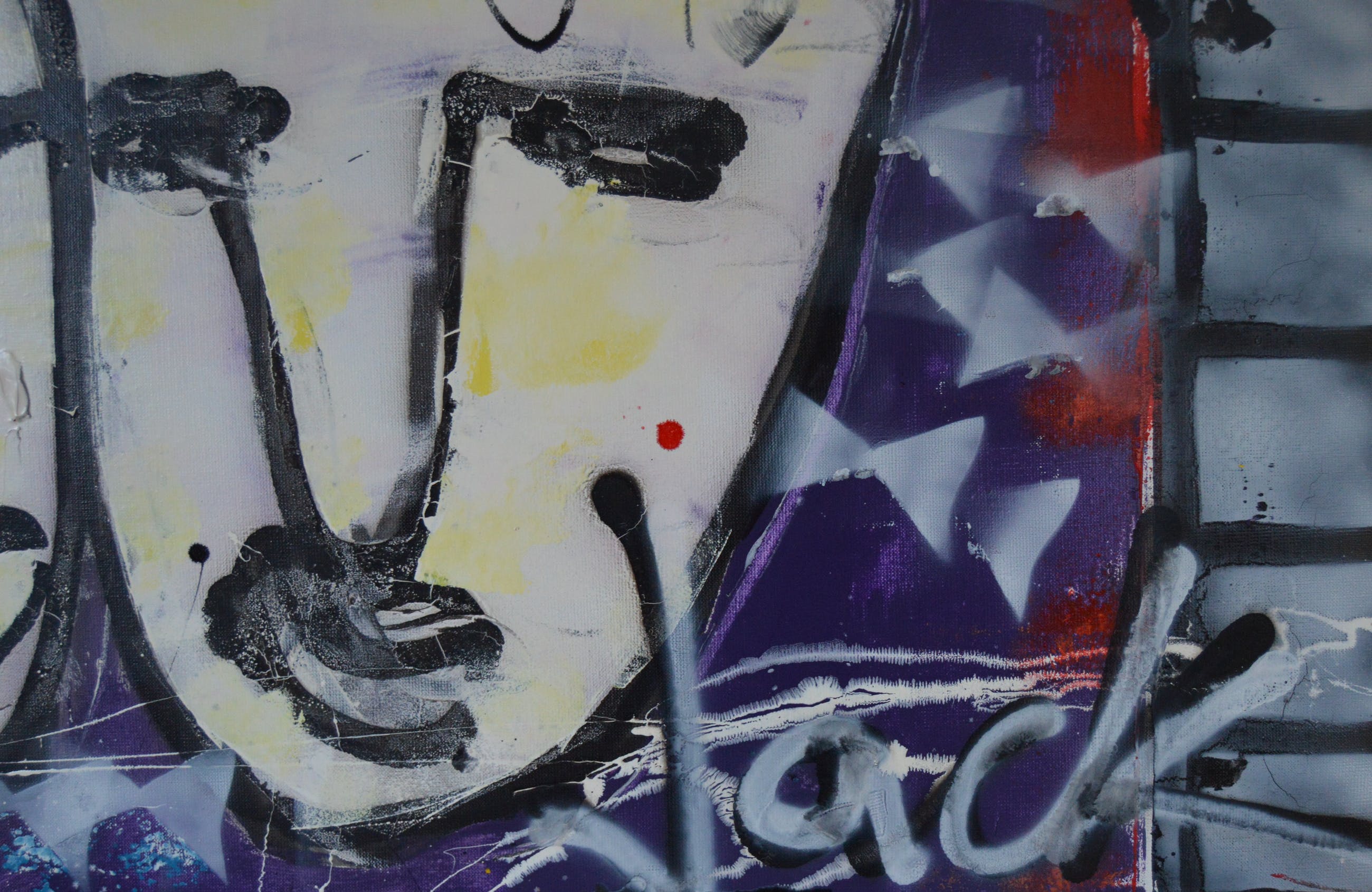 Mooi groot werk van Jack Liemburg. Hij gebruikt in dit werk acryl, spray en sjablonen. Opgespannen op een houten spieraam.