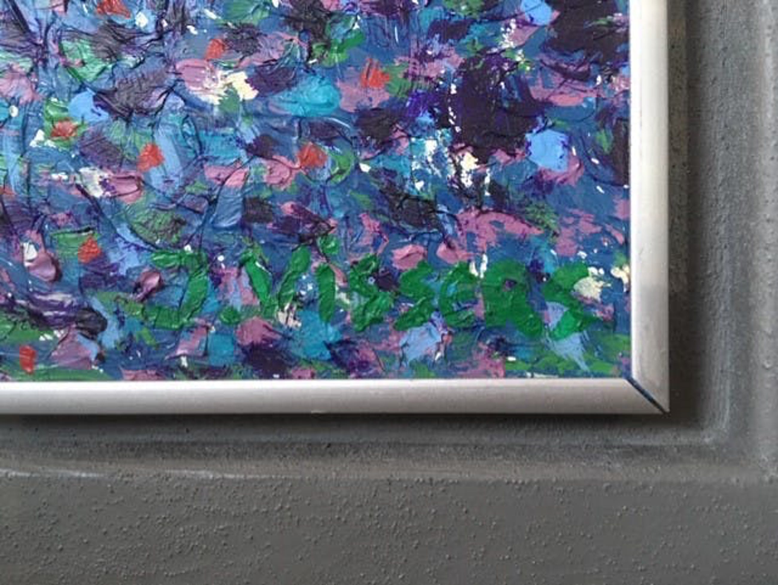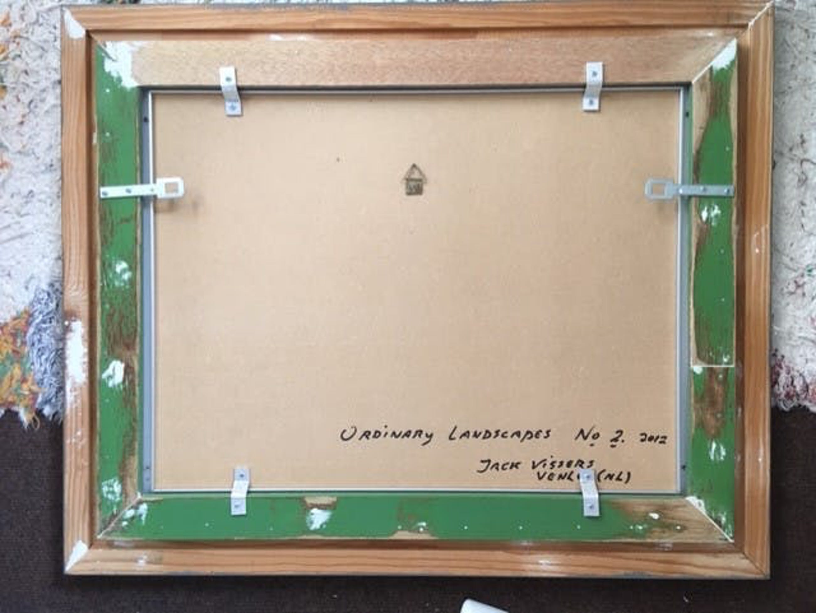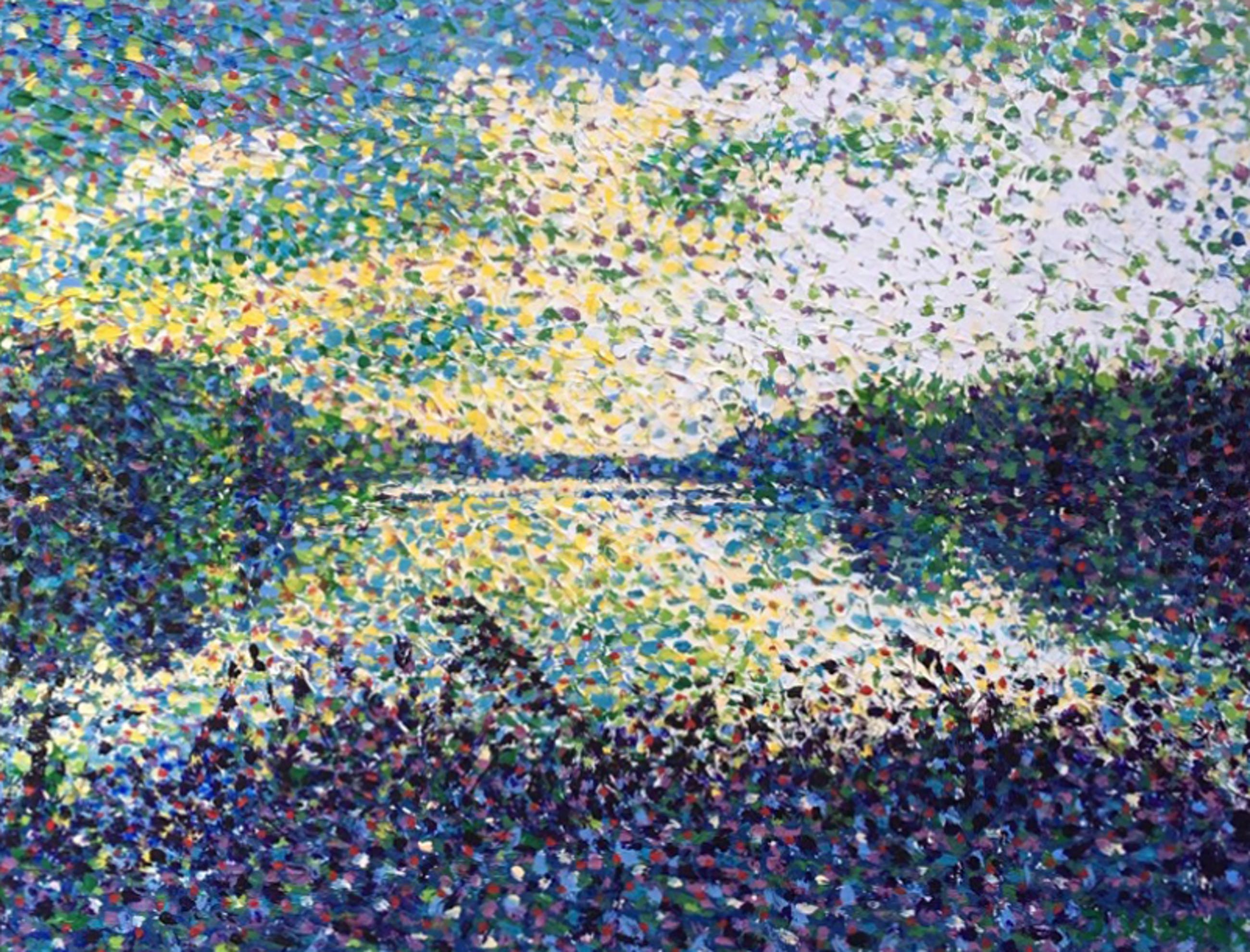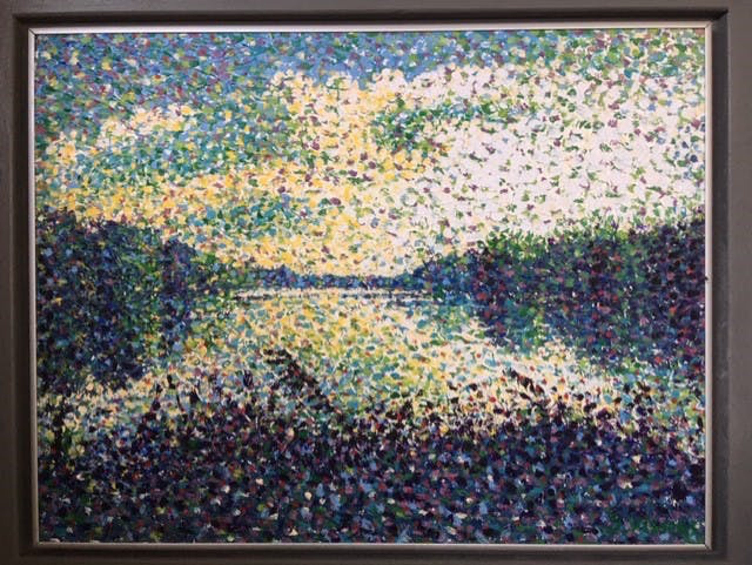 Uit de serie 'Ordinary Landscapes van Jack Vissers: Aan het meer. Acryl op geprepareerd paneel, in stevige aluminium en houten lijst. R.o. gesigneerd, 2012. Formaat incl. 58 x 71 cm.