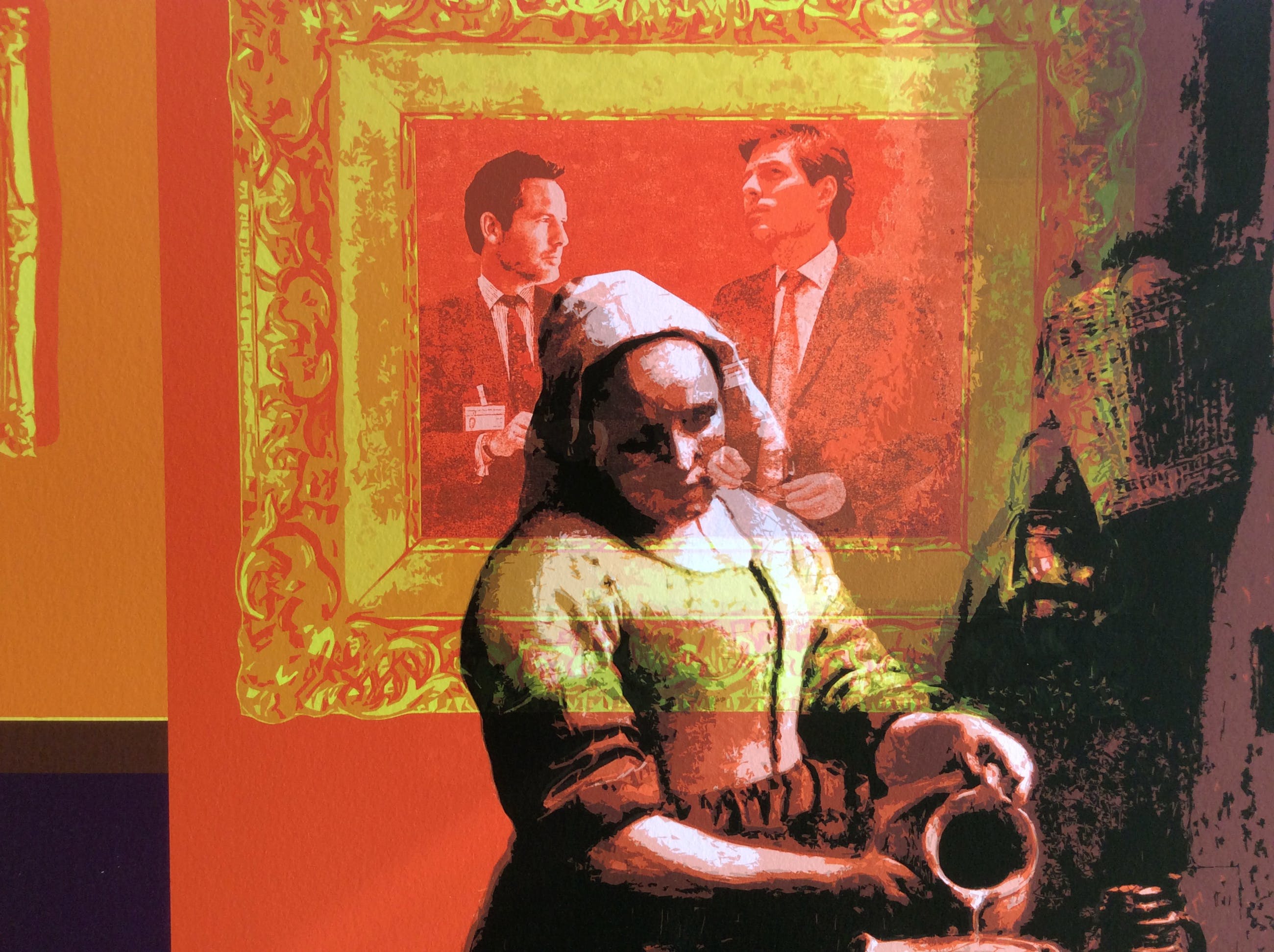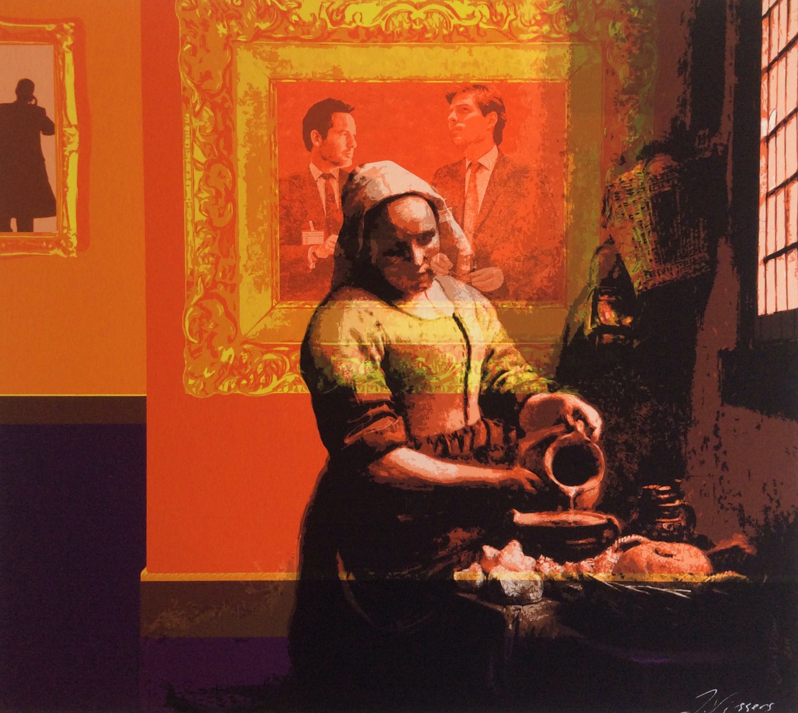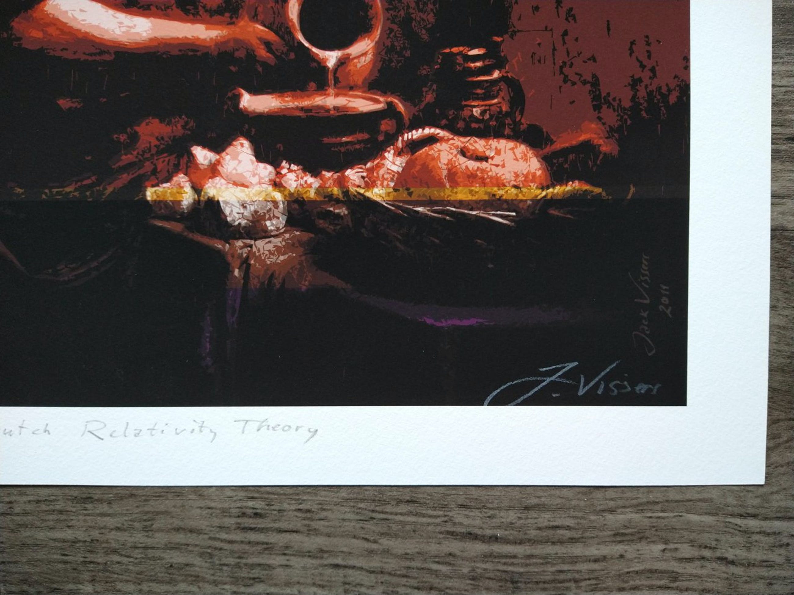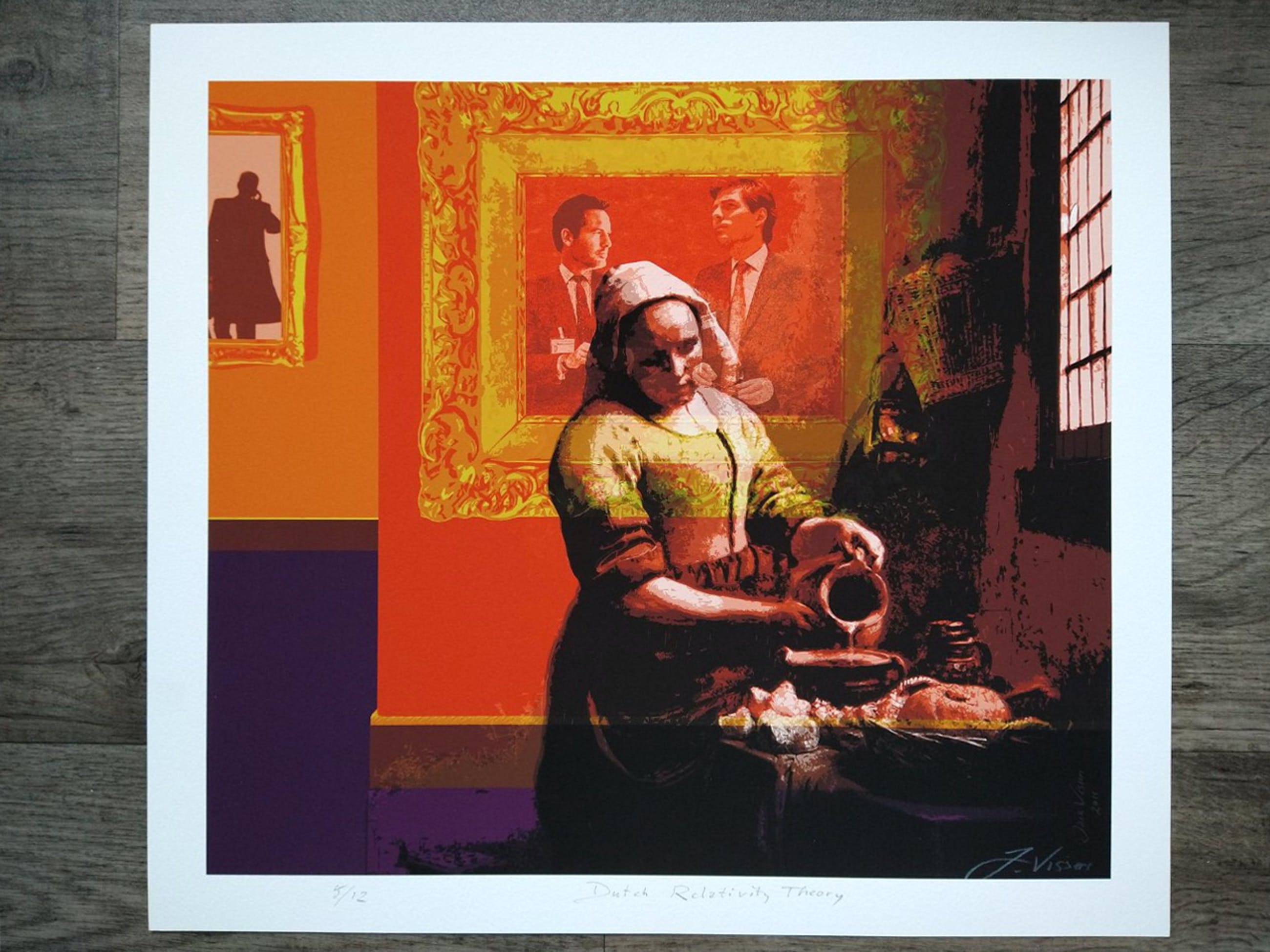 Fraaie giclée in kleine oplage van 12 : Dutch Relativity Theory. Verleden en heden in een omgekeerde, vervreemdende setting. Formaat incl. 45 x 50 cm, beeld grootte 39 x 44 cm. Stevig papier. Potlood gesigneerd en genummerd, tevens in de druk, 2011. Dit is nr. 5/12.