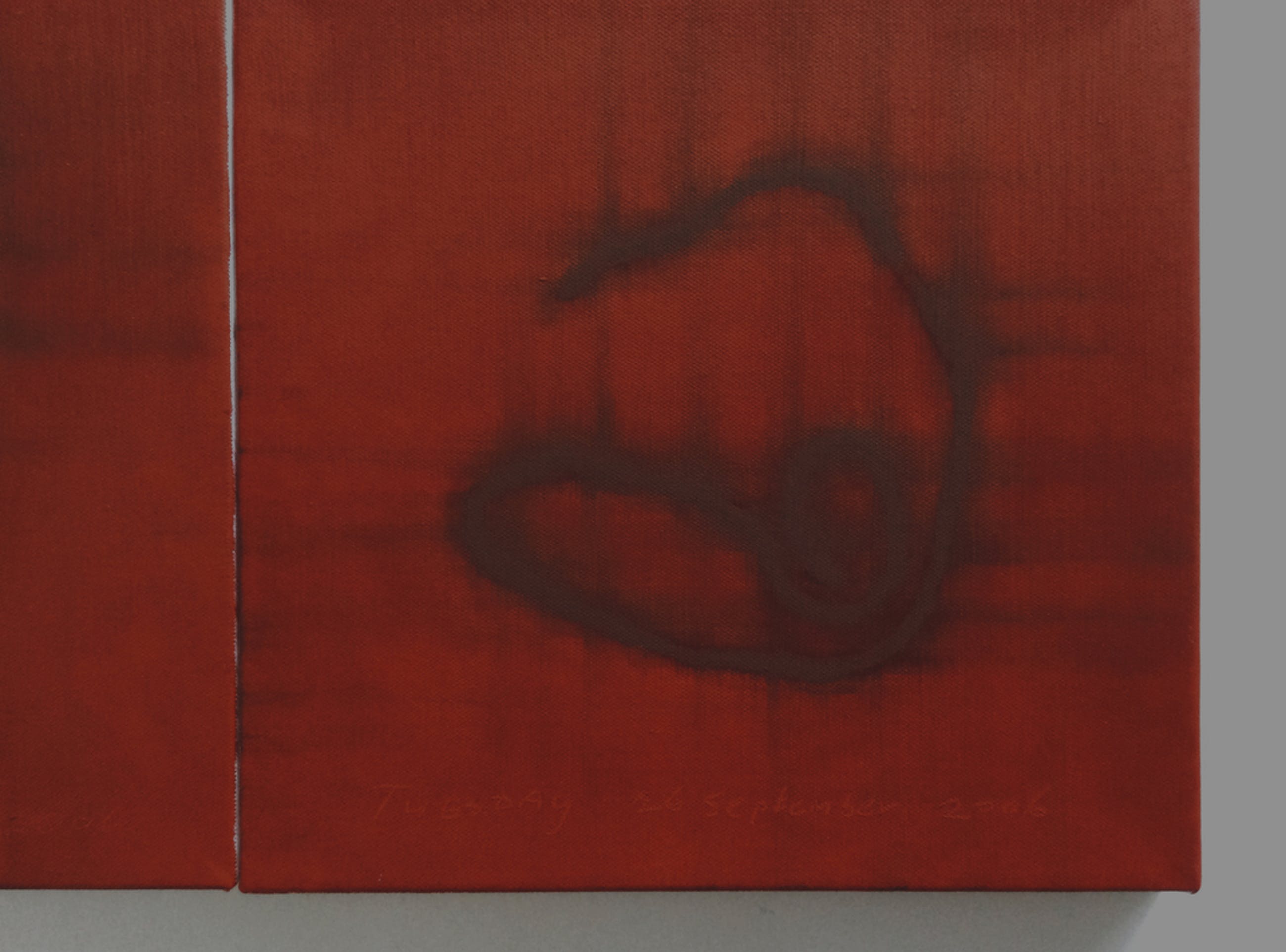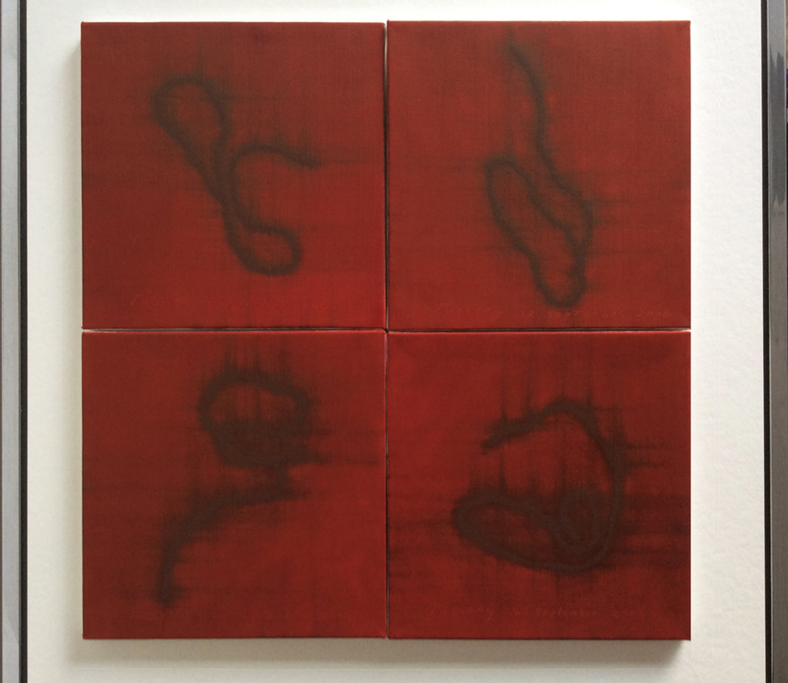 Tableau van 4 schilderijen uit het project "Day Threads" van Jack Vissers uit 2006, kleur rood.