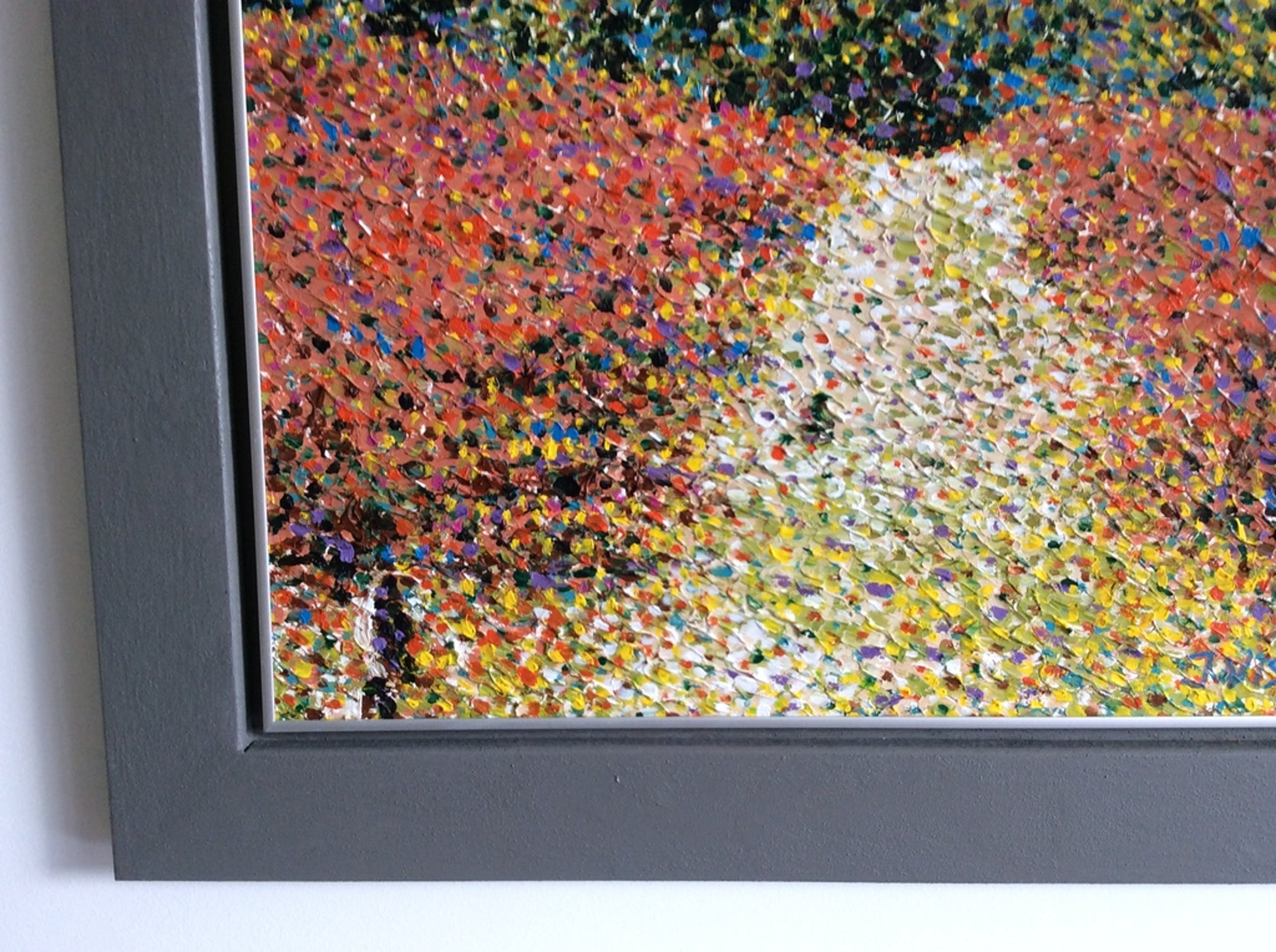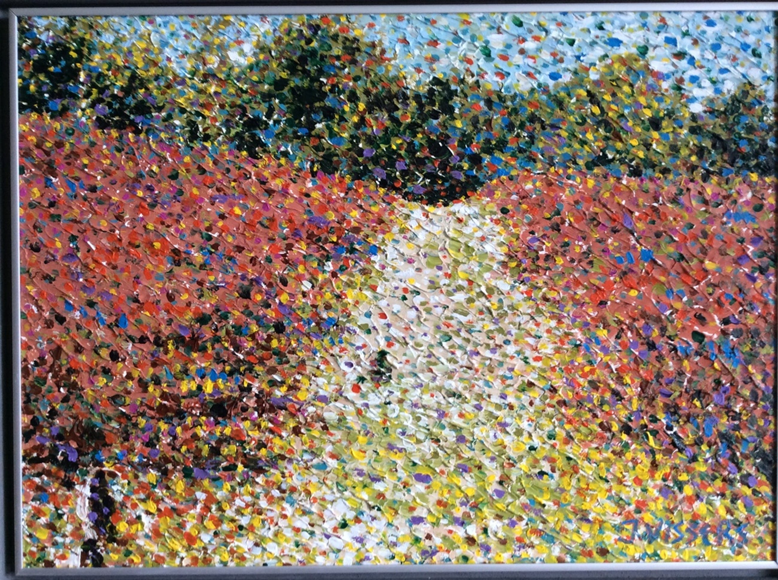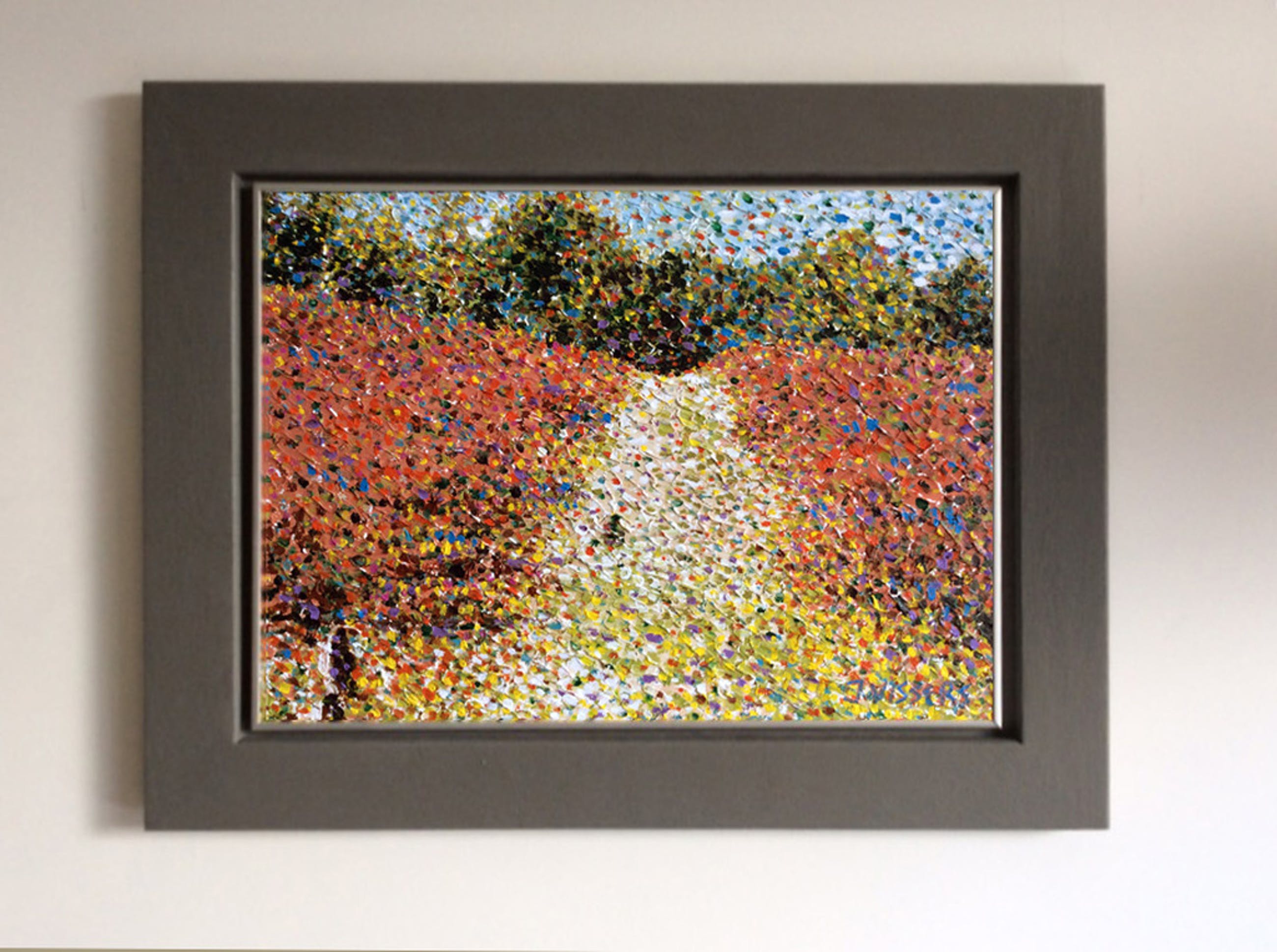 Van Jack Vissers: (bos en heide) landschap. Olieverf en acryl op paneel, met robuuste houten lijst. Uit de serie "Ordinary Landscapes is dit nr. 9, uit 2012. Formaat incl. 71 x 56 cm, afm. schilderij 55 x 41 cm. Rechtsonder gesigneerd, als ook achterop van info voorzien.