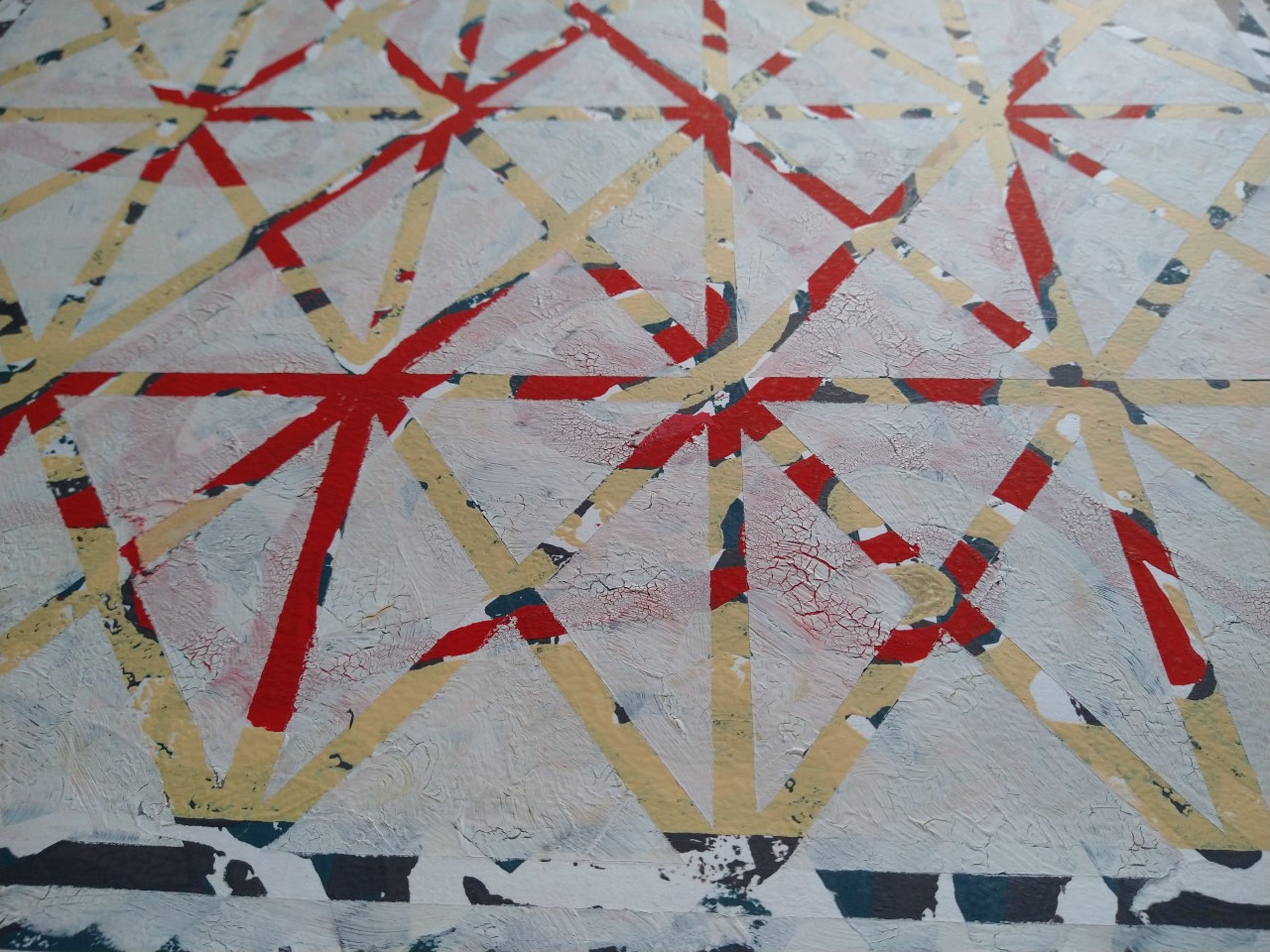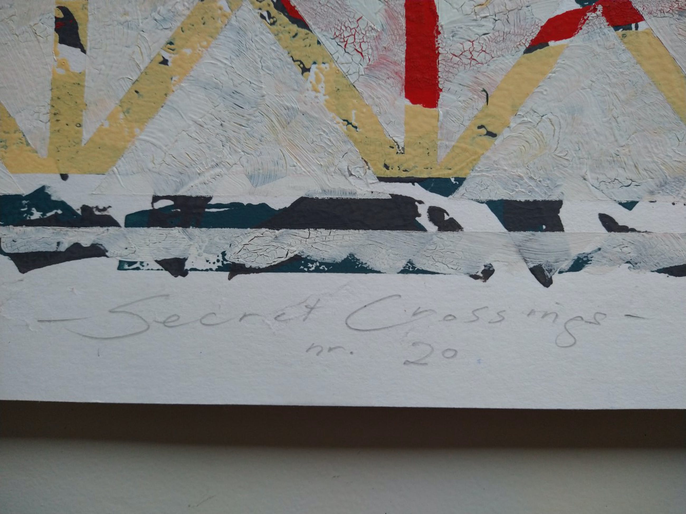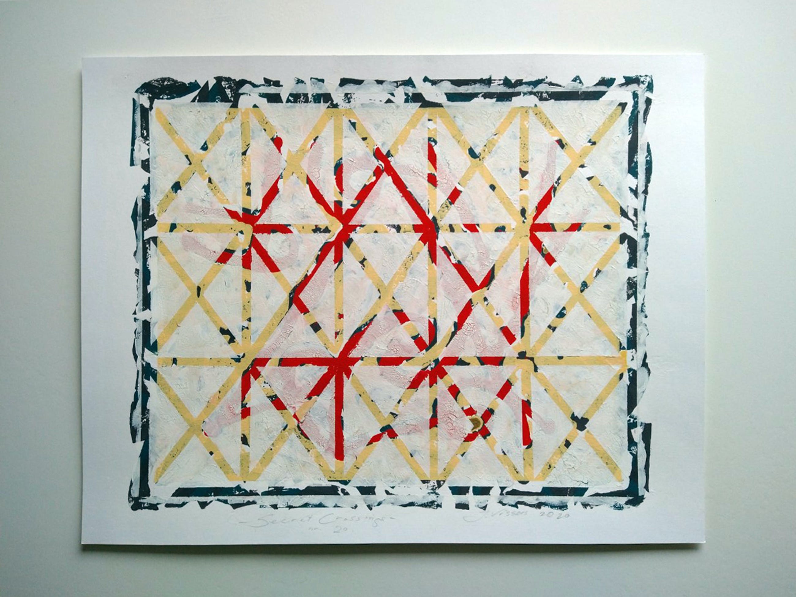 Geometrische compositie op stevig Canson papier/karton van Jack Vissers. Titel: Secret Crossings. Dit is nr. 20. Formaat incl. 50 x 65 cm. Onderin potlood gesigneerd en van titel voorzien, 2020.