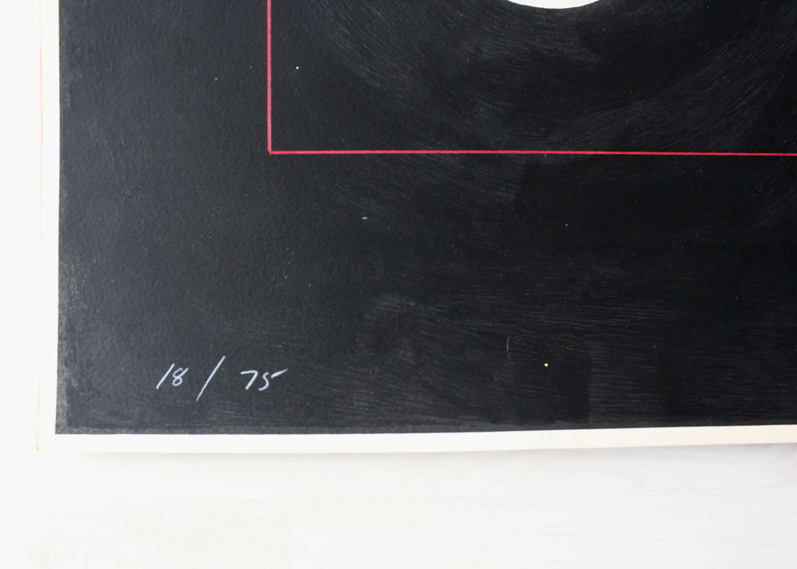 Jack Youngerman (1926-2020). Titel: "Mandala (zwart)" 1983 - uit de Yantra-serie. Techniek: Zeefdruk met pochoir en diepdruk op Arches-papier. Gelimiteerde oplage van 75 stuks. Met de hand gesigneerd, gedateerd en genummerd. Uitgegeven door Transworld Art, New York.