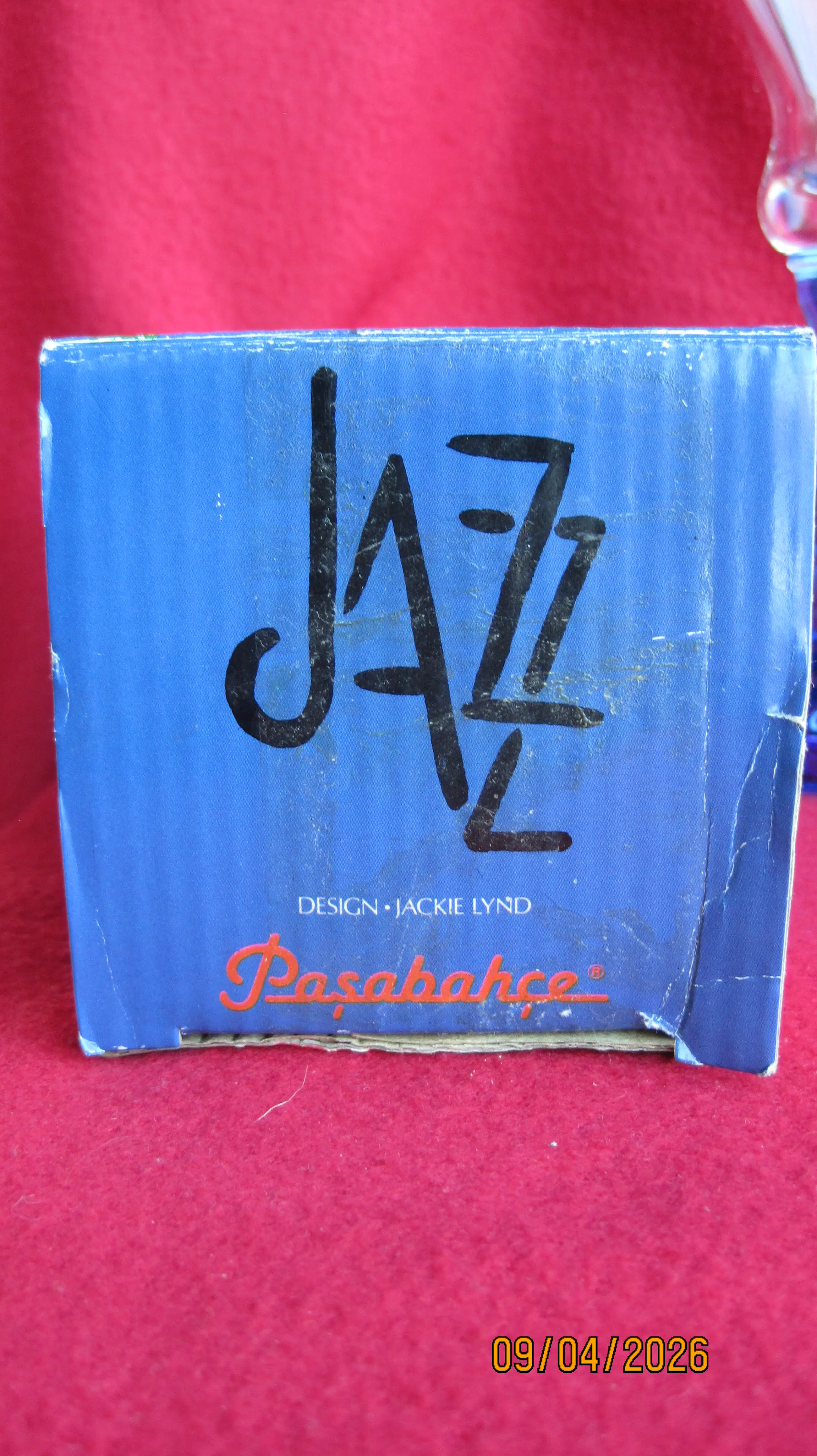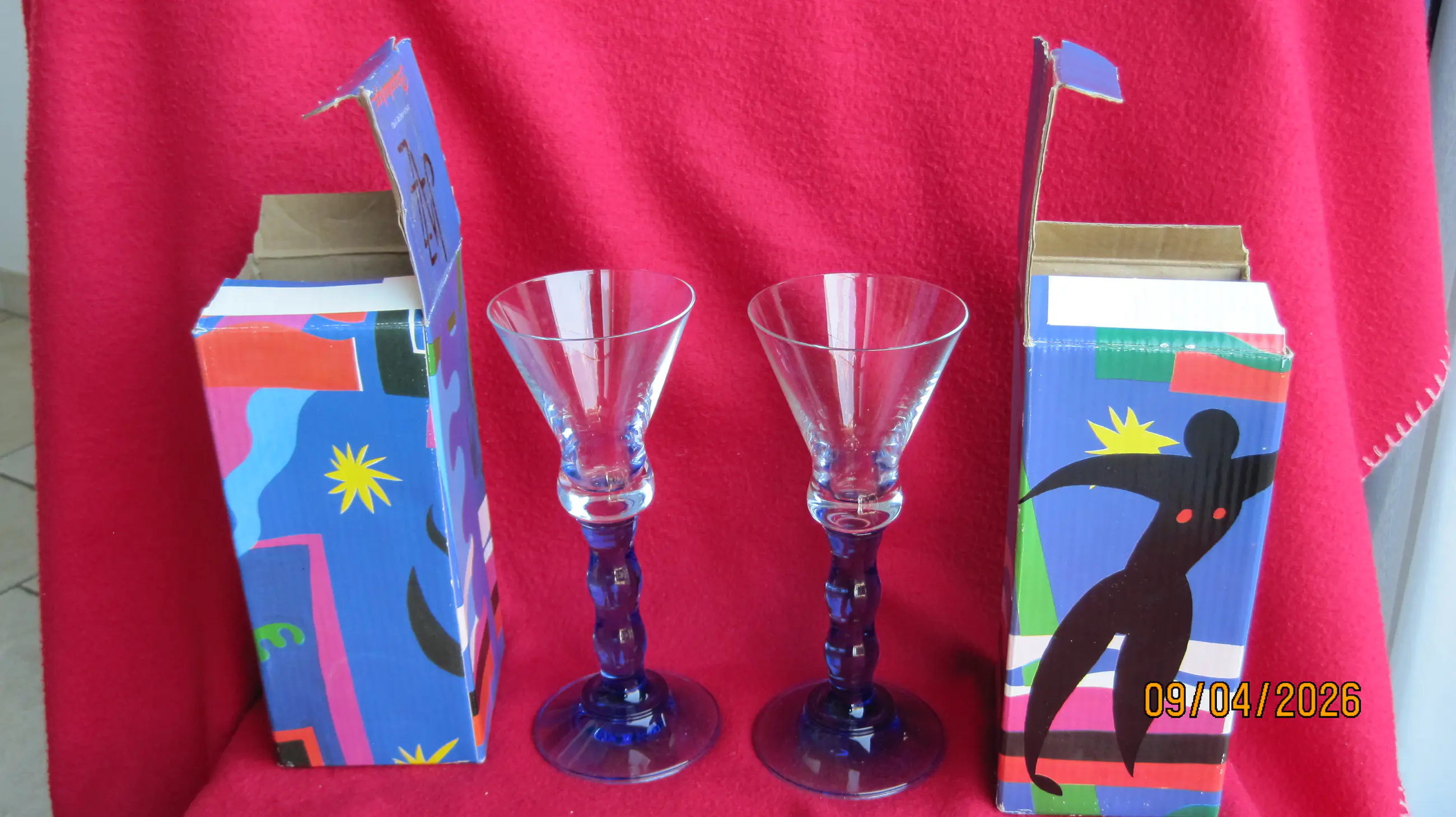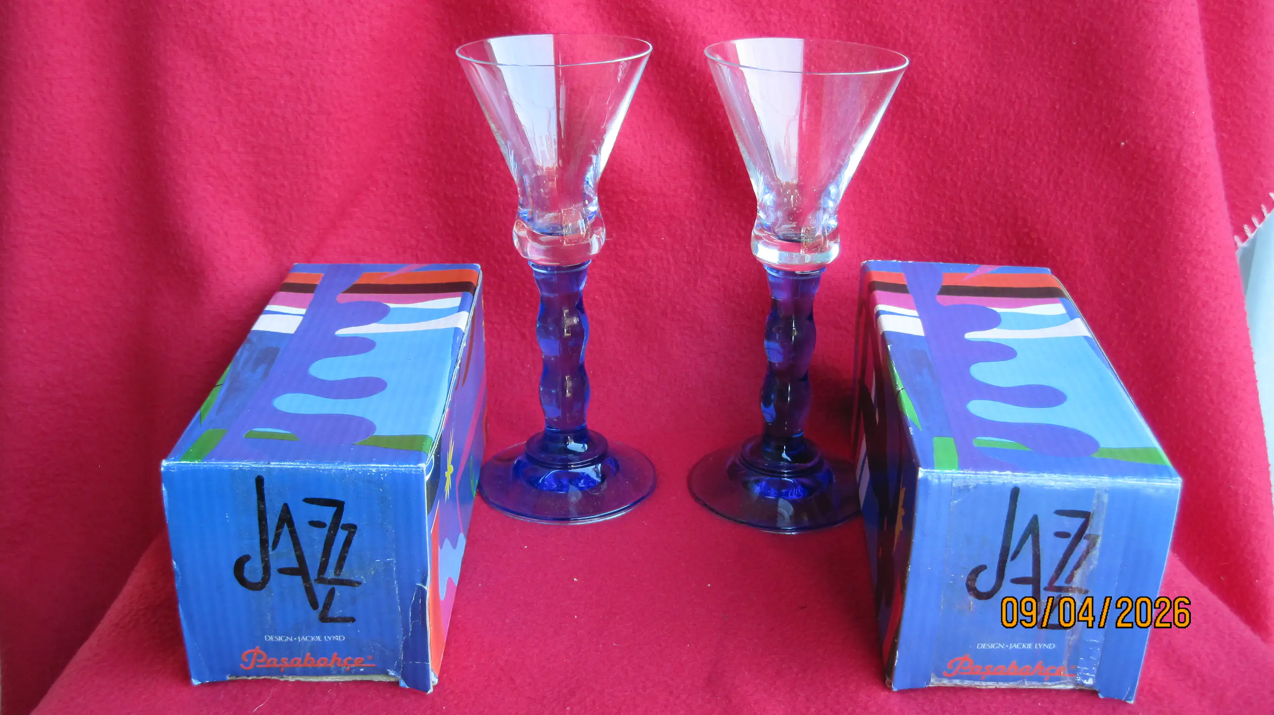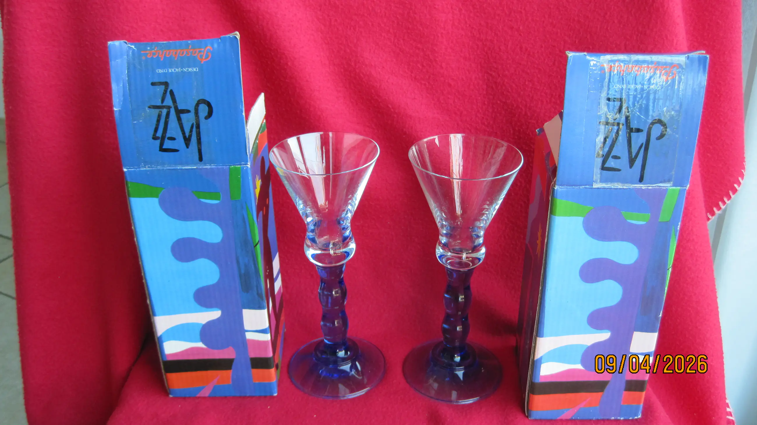2 fraaie glazen uit de Jazz serie in samenwerking met Pasabahce uit de jaren 90. Deze glazen vallen op door de kenmerkende blauwe voet. De glazen wegen 300 gram per stuk, verkeren in nieuwstaat en komen inclusief de originele verpakking.