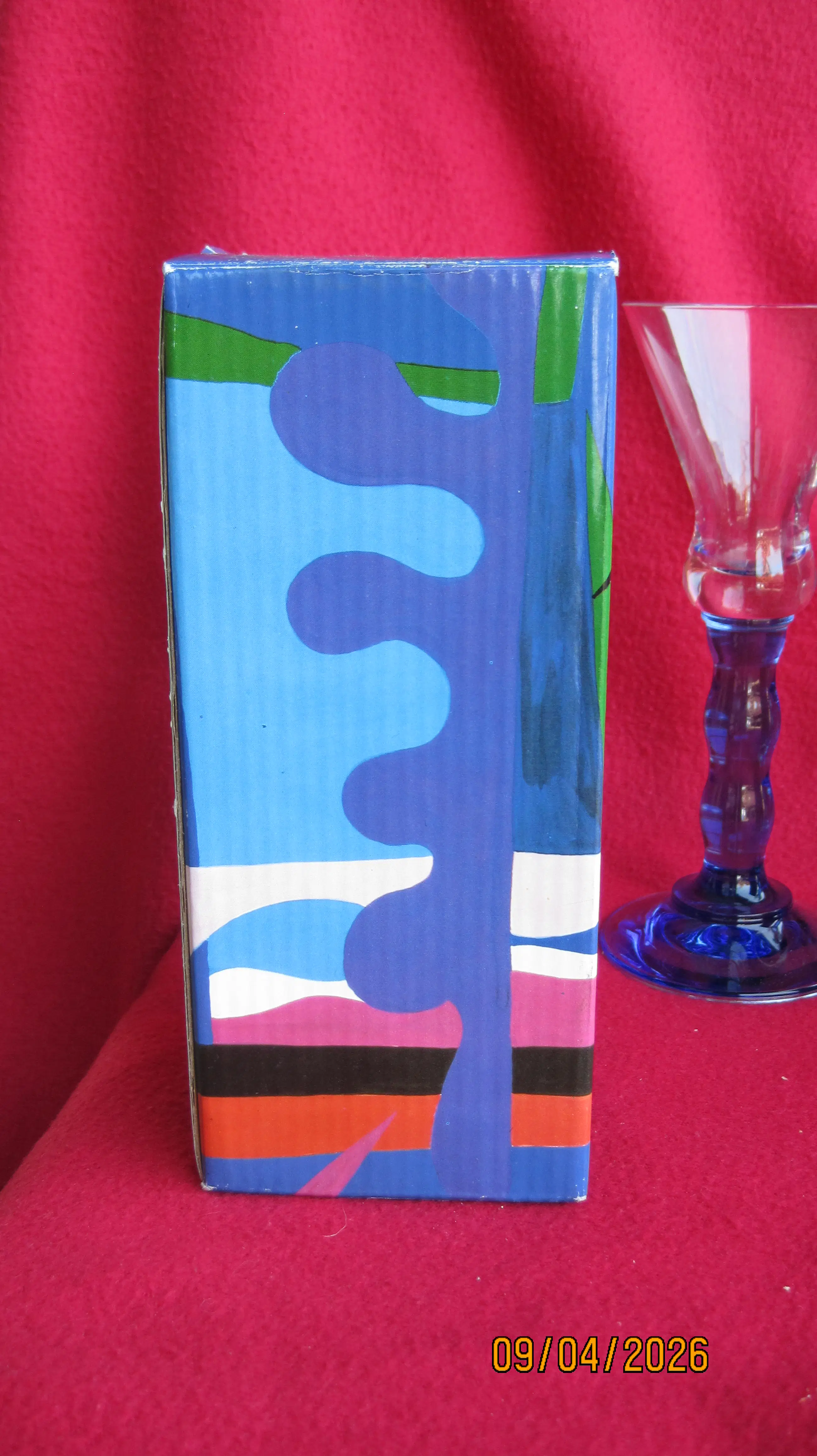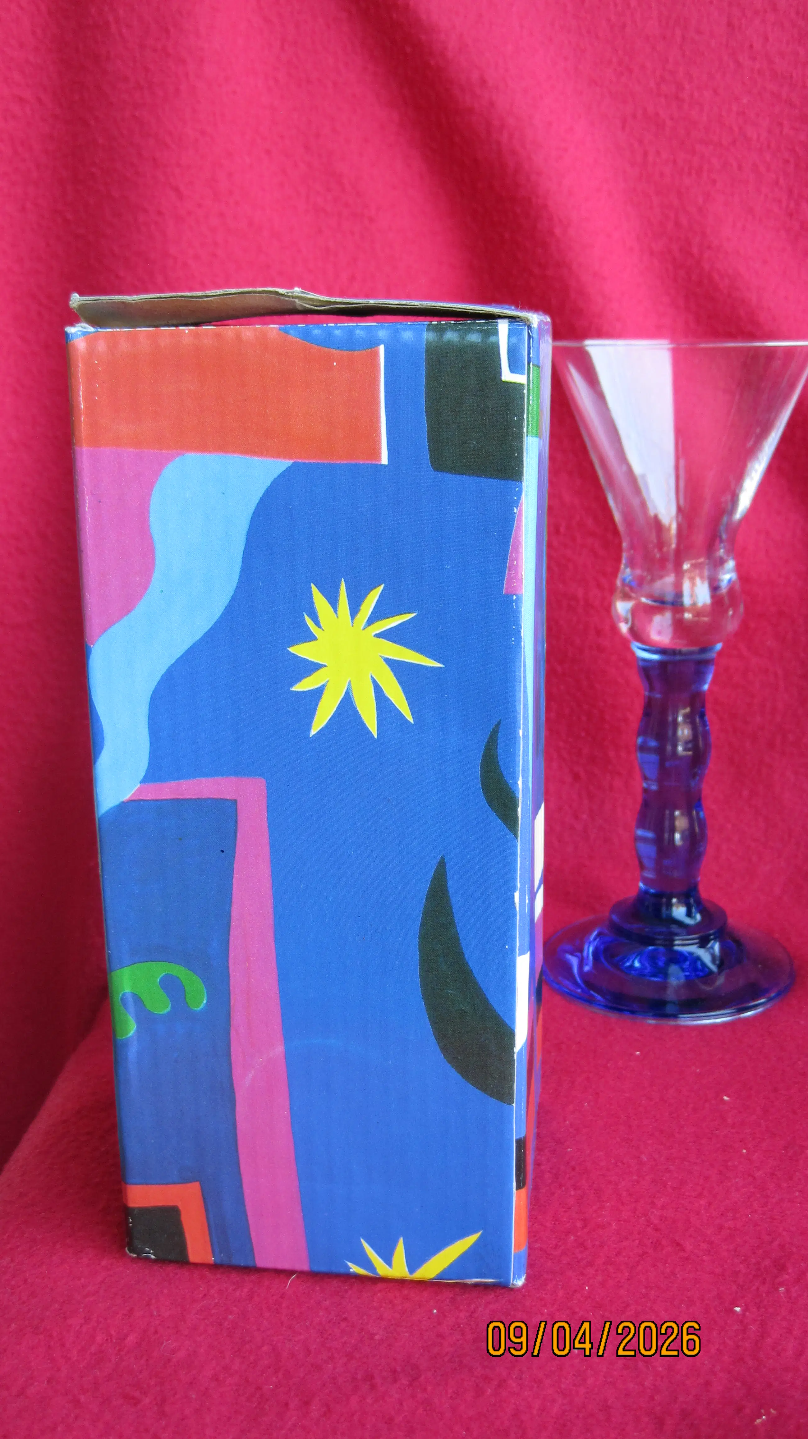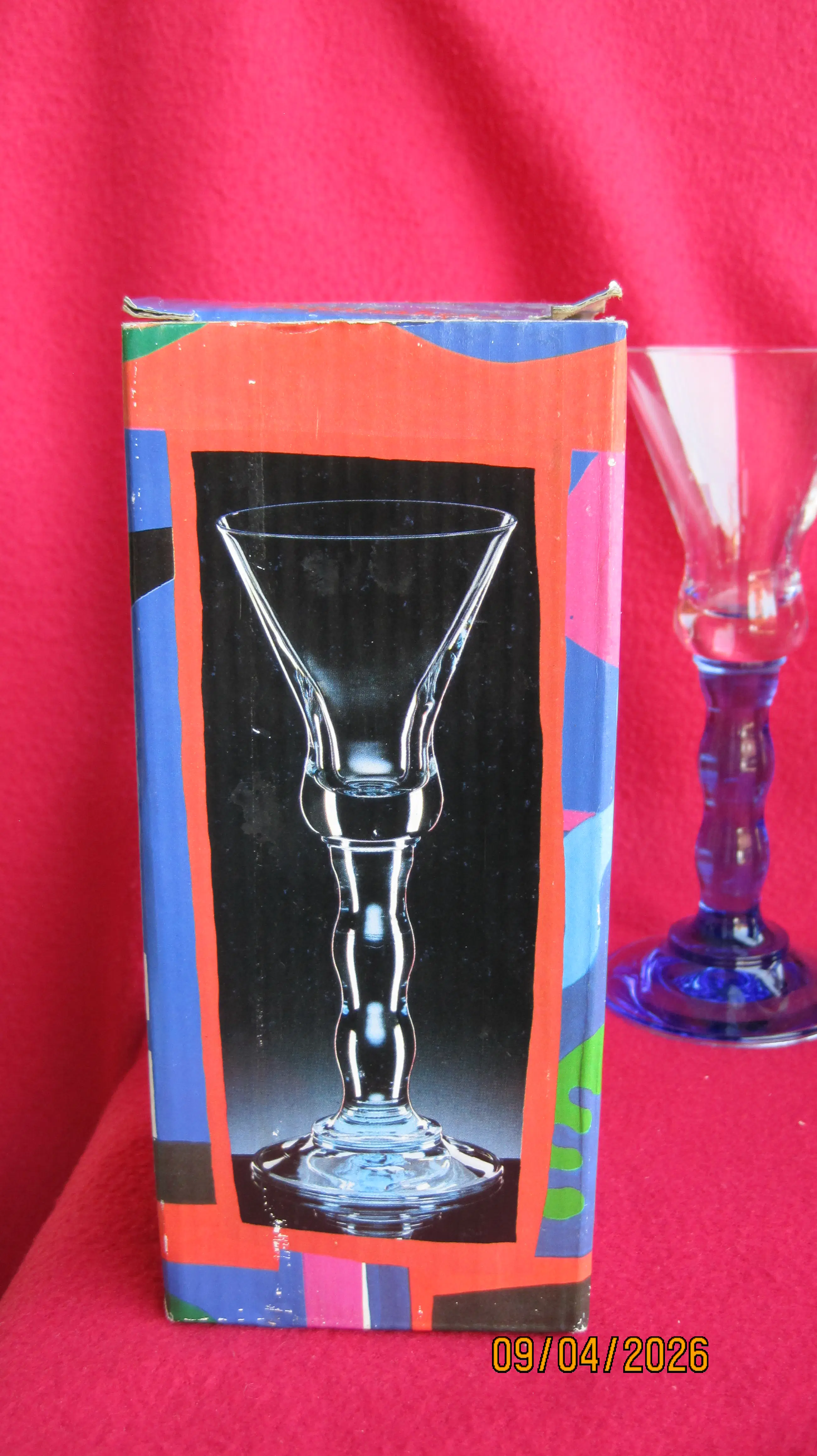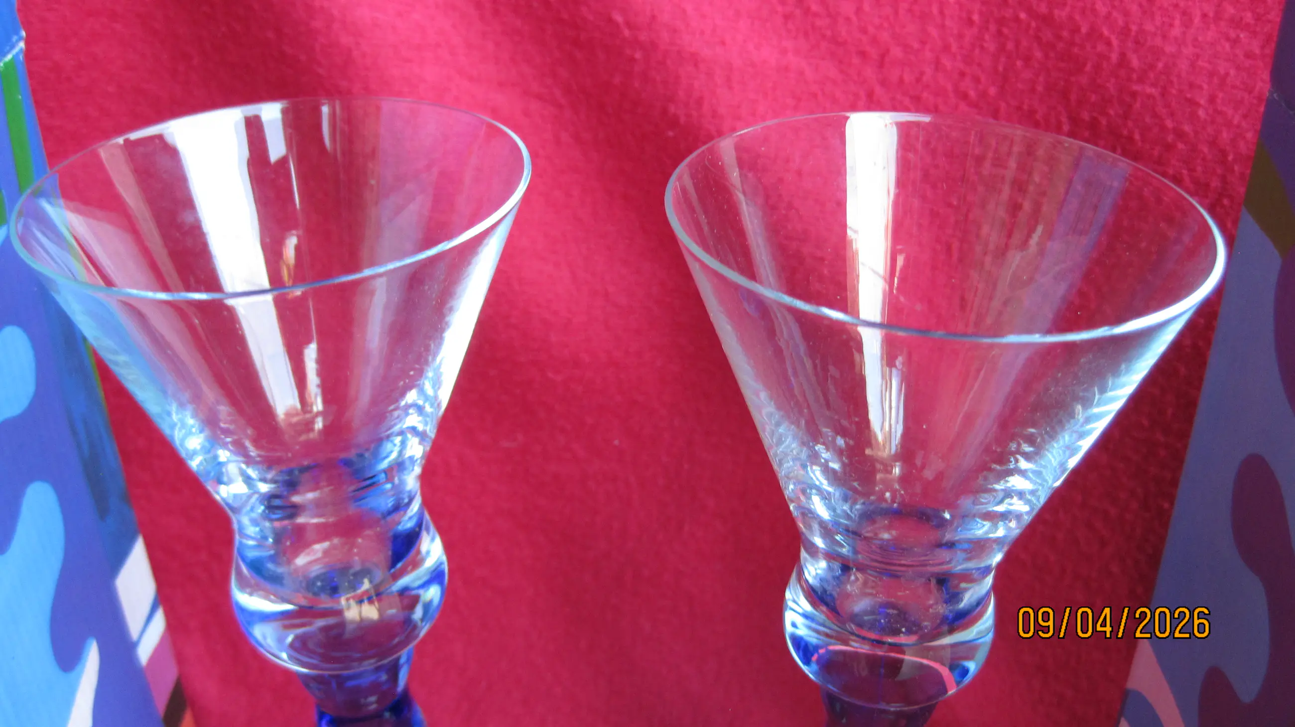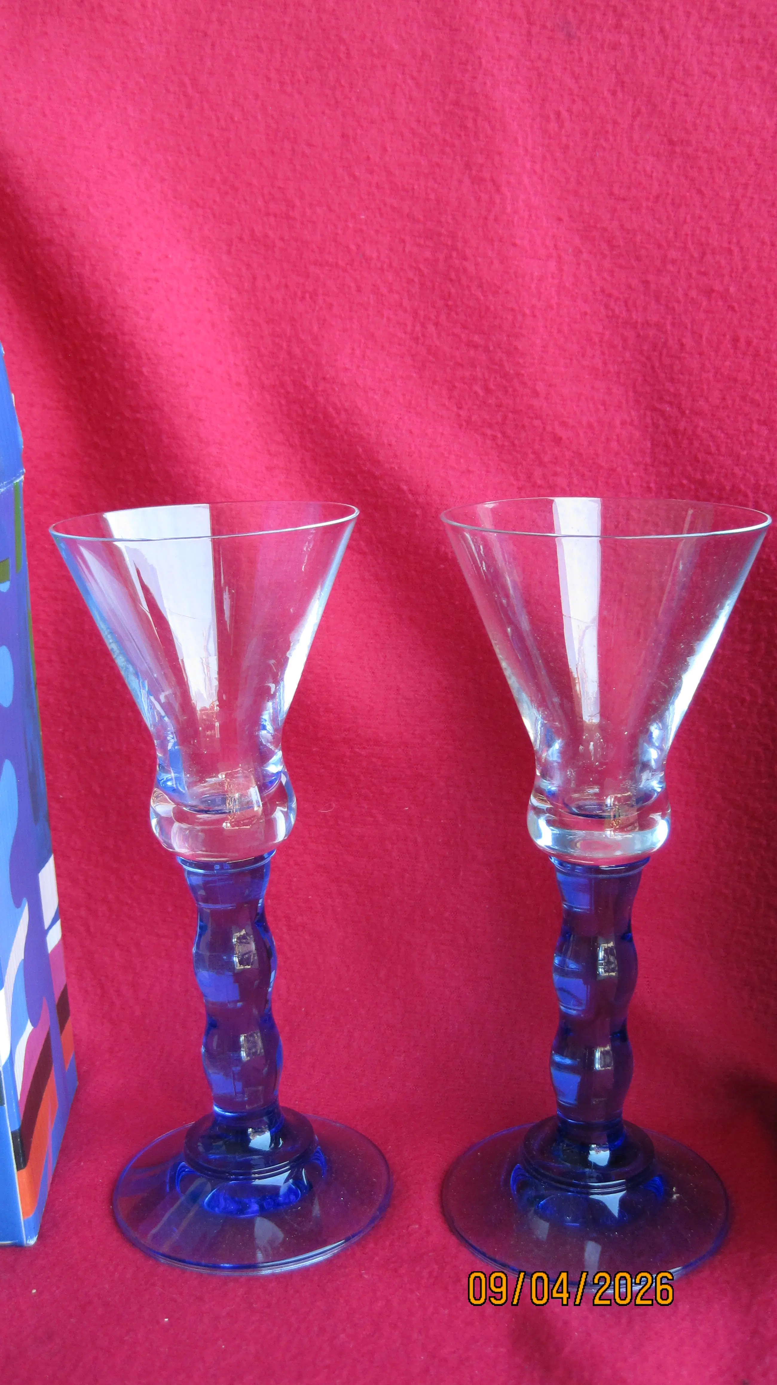 2 fraaie glazen uit de Jazz serie in samenwerking met Pasabahce uit de jaren 90. Deze glazen vallen op door de kenmerkende blauwe voet. De glazen wegen 300 gram per stuk, verkeren in nieuwstaat en komen inclusief de originele verpakking.