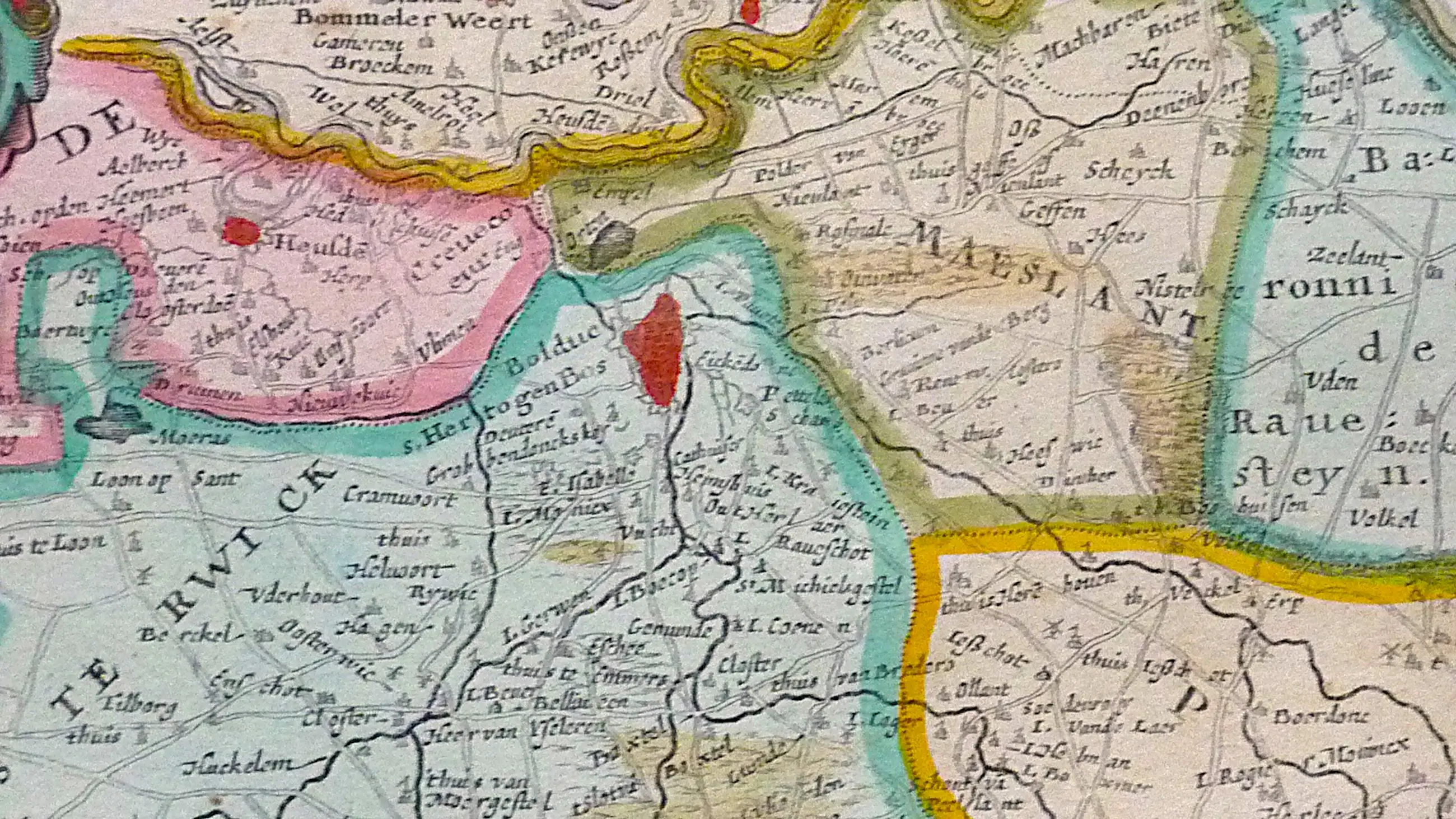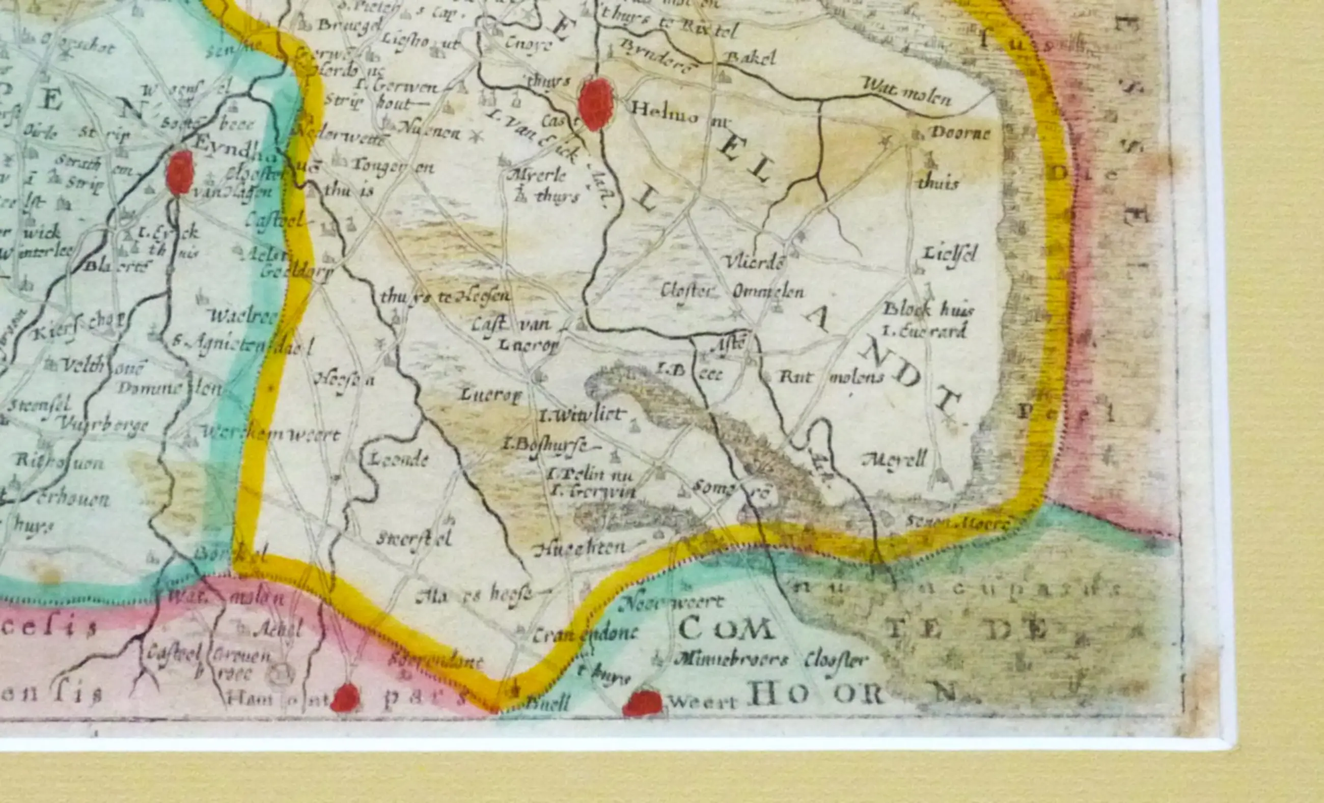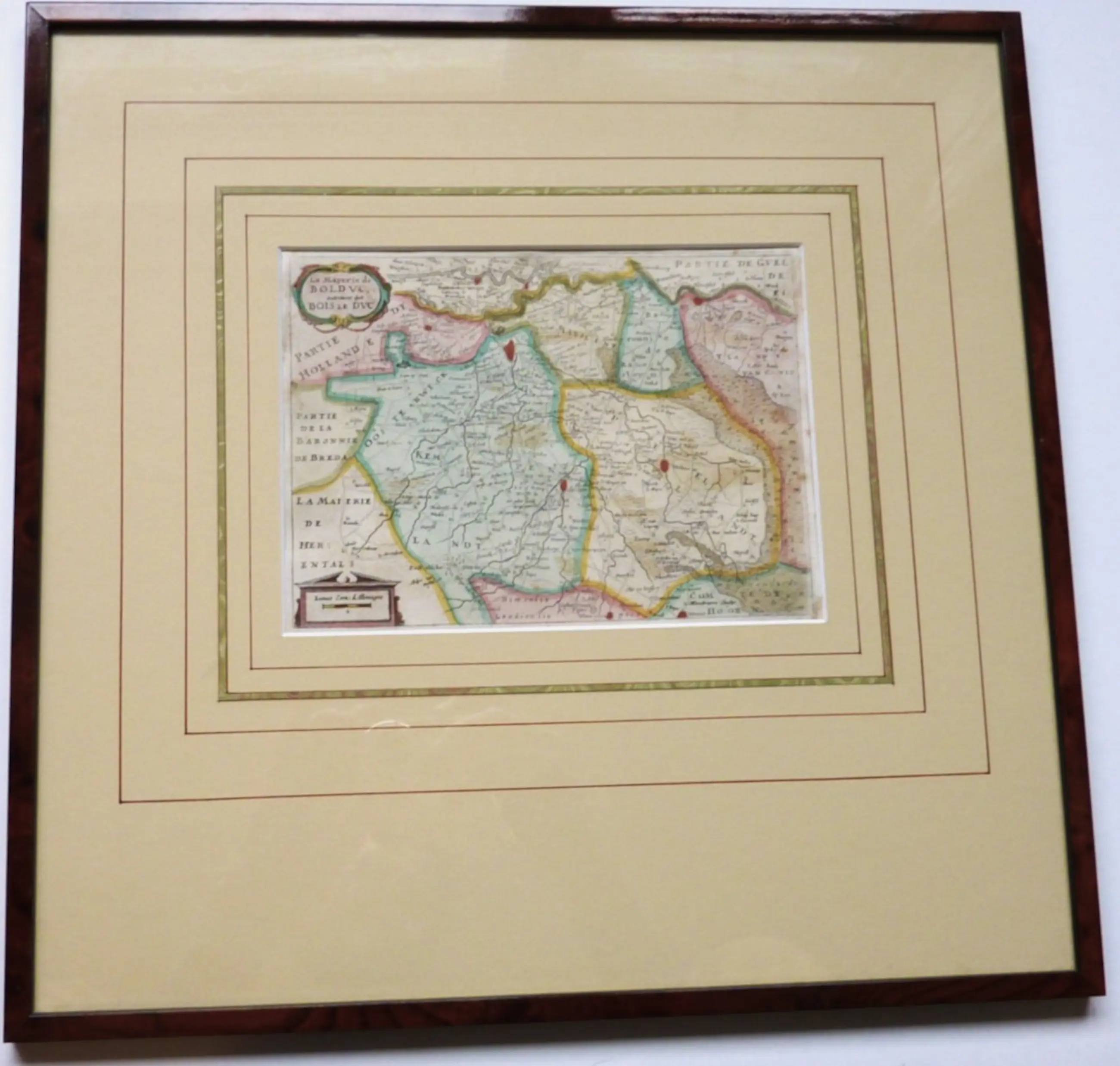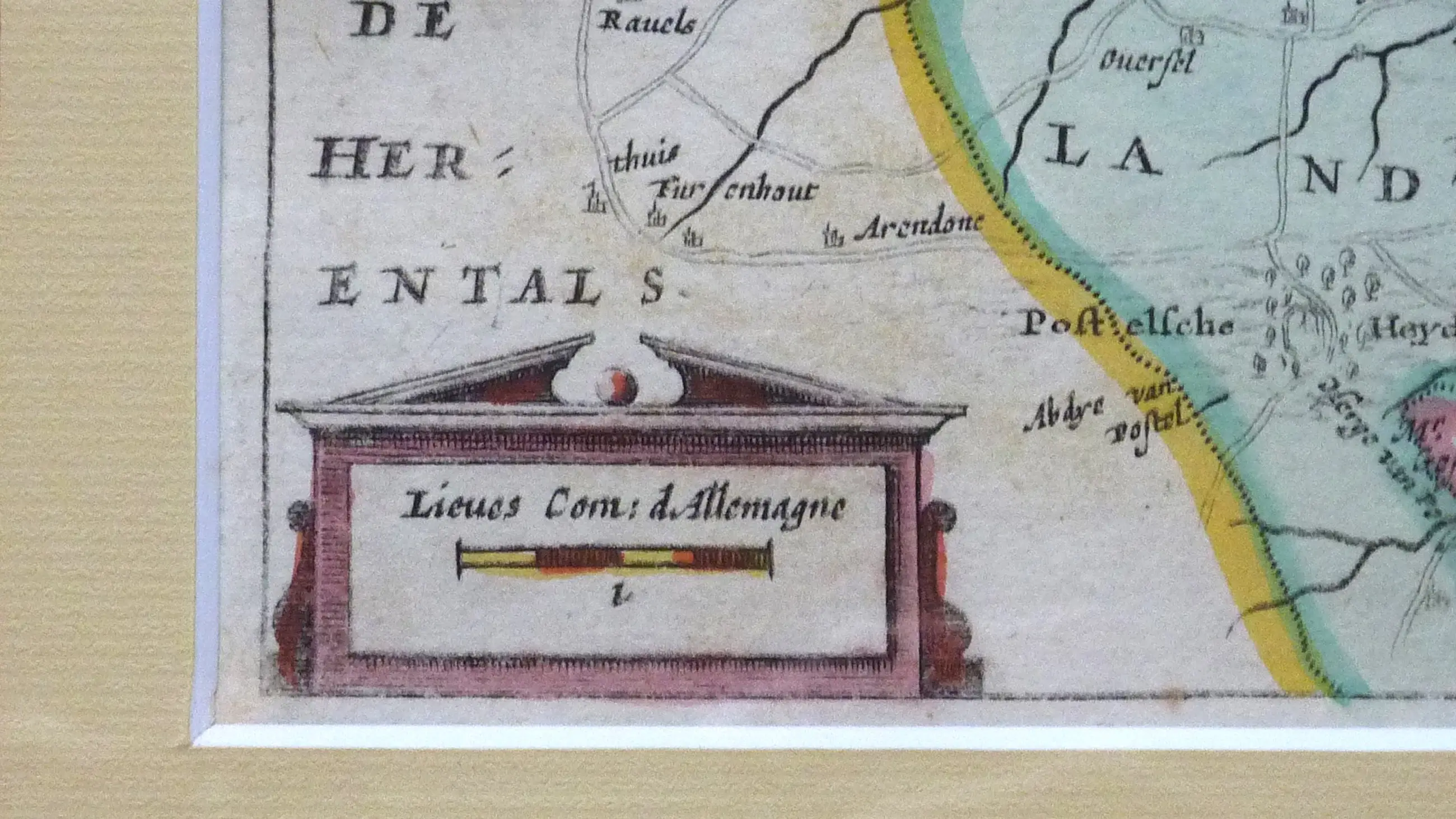 Oud ingekleurde gravure in beige passepartout met rijke belijning. Met name aan de rechterzijde minimale foxing.