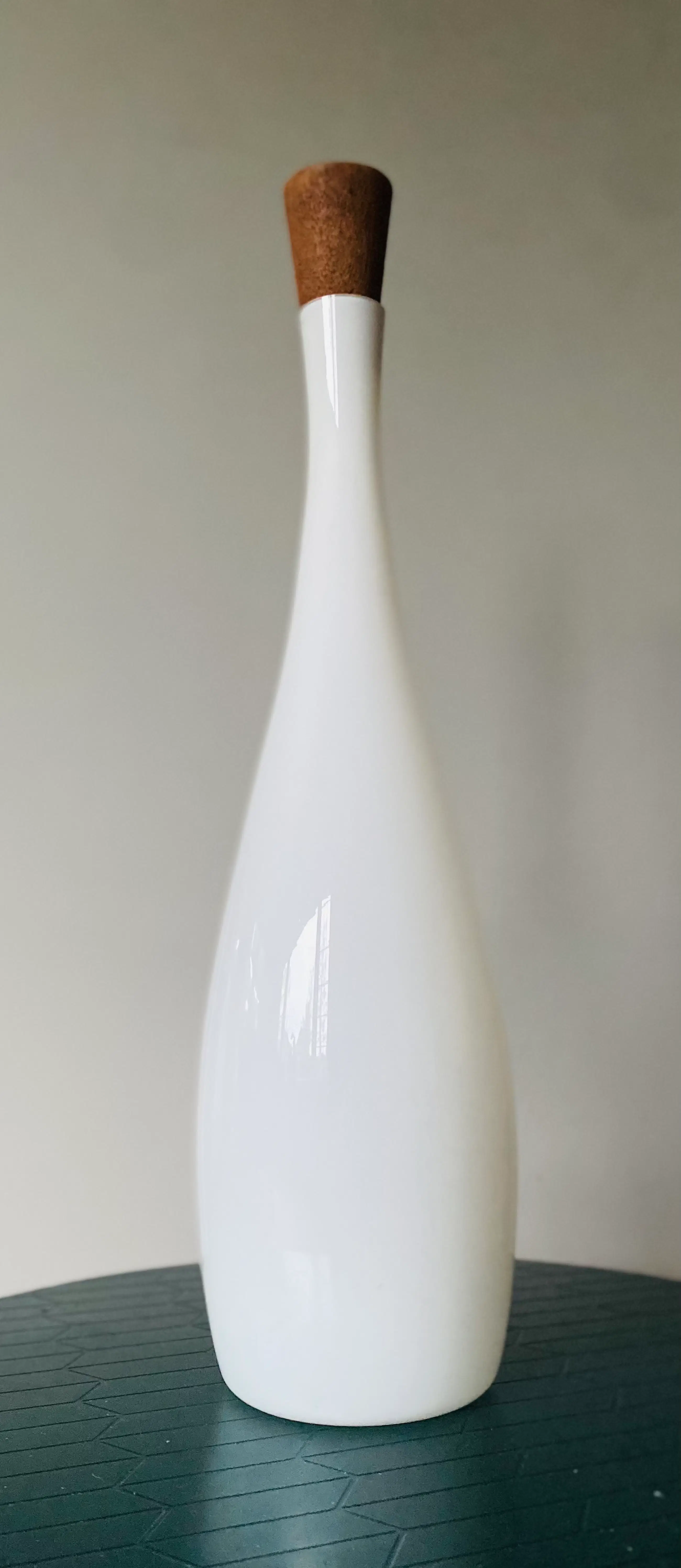 De fles is voorzien van een teakhouten stop, wat een warm contrast vormt met het opaline glas.