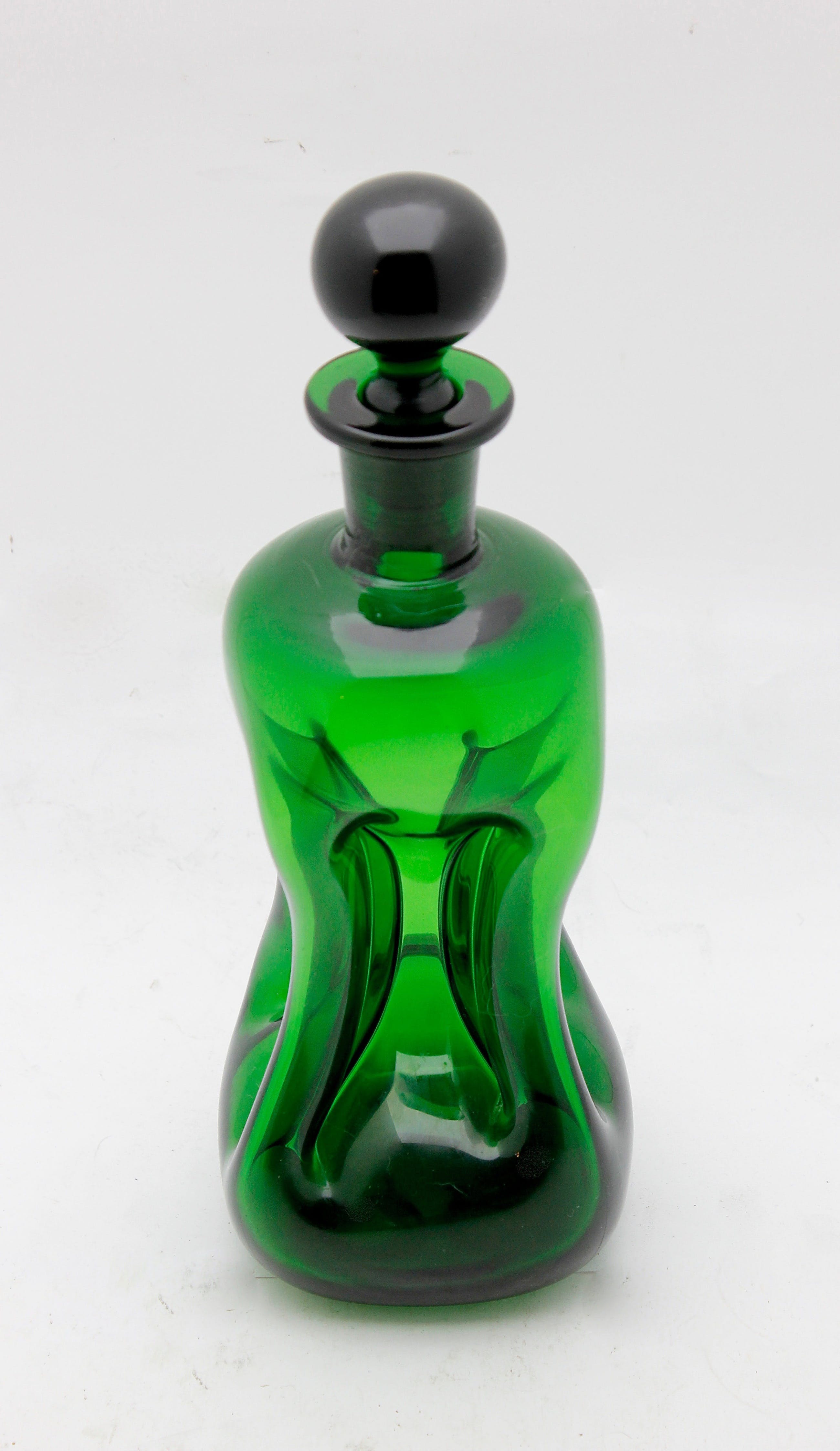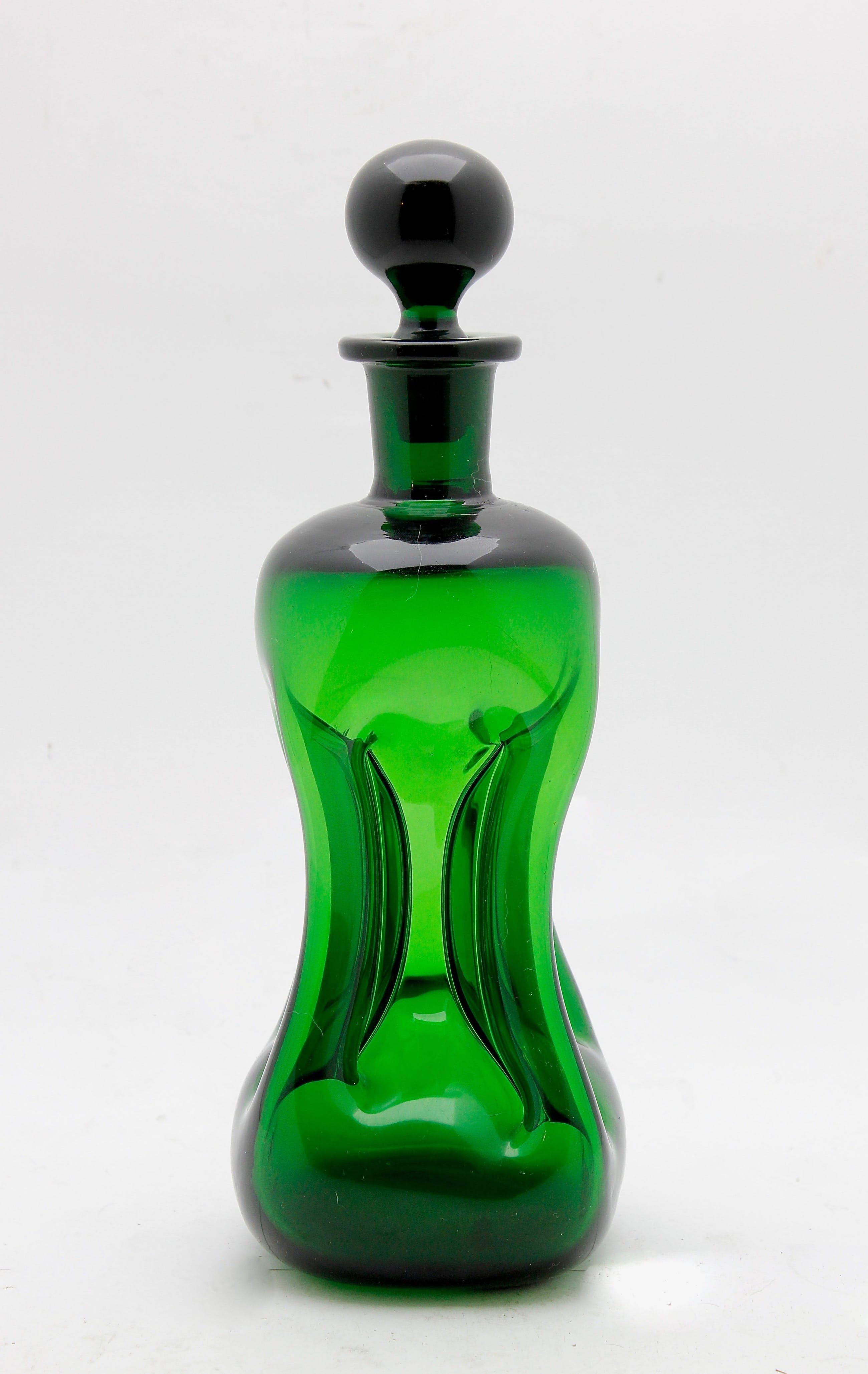 Midden 20e eeuw, Kastrup Denemarken. Deze karaf is voor het eerst opgenomen in de catalogus van 1950. De karaf wordt vandaag de dag nog steeds geproduceerd maar alleen in helder glas. Het glasobject is geïnspireerd op de klassieke stijlvorm rond 1880. Met stolp is de karaf 28 centimeter hoog.De breedte bedraagt ca. 9 centimeter. De karaf is in uitstekende conditie