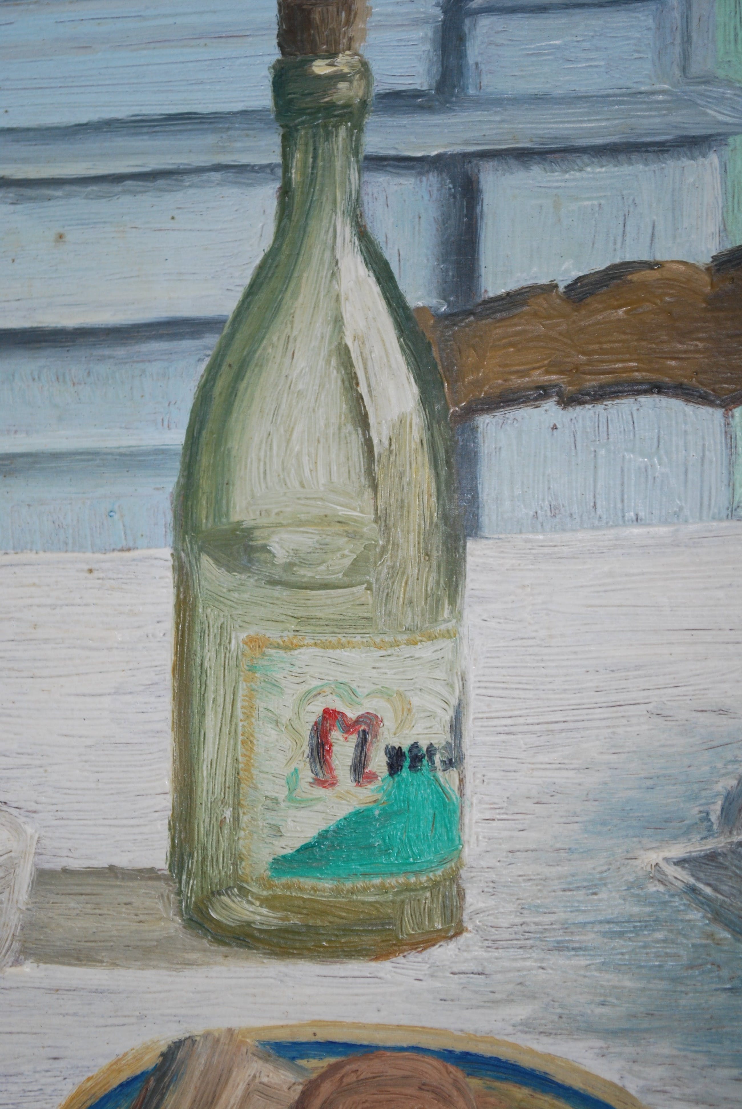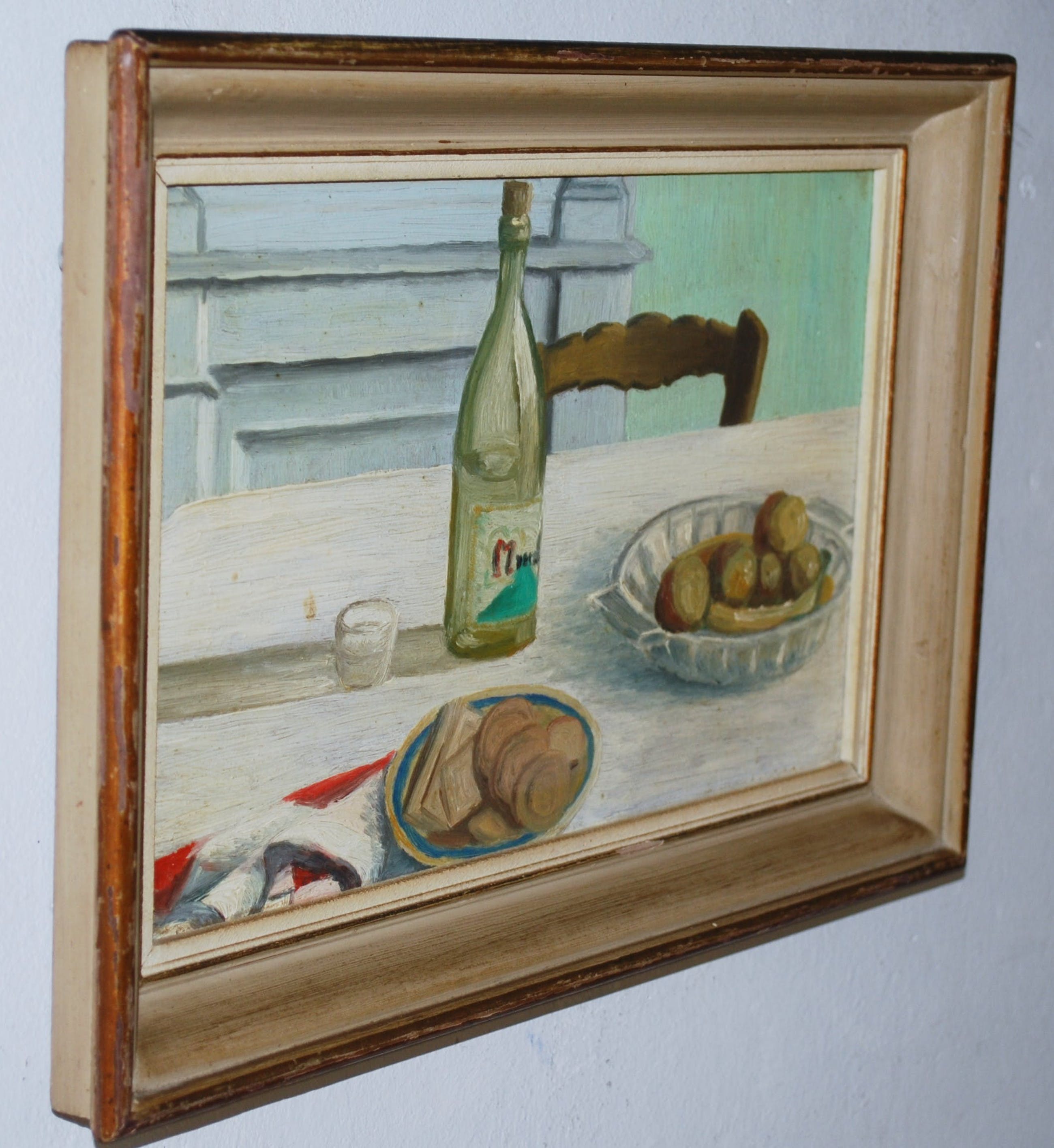 Onbekend gesigneerd: Stilleven met een (champagnefles) op tafel. Olieverf op paneel uit 1965, onbekend gesigneerd aan de achterzijde. In de originele lijst met lichte schade. 20x33 cm paneel en 27x39 cm lijst.
