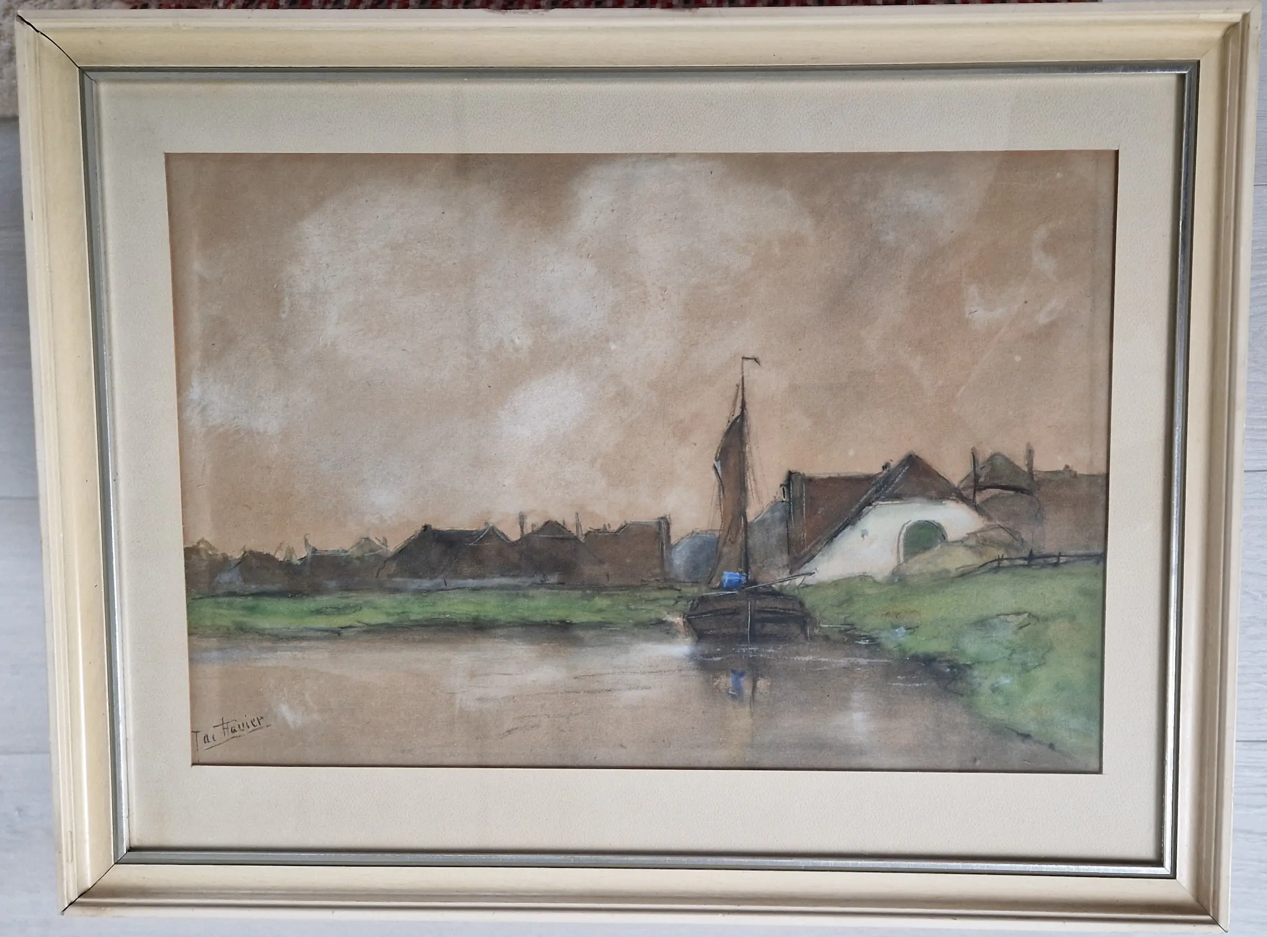 Zeilbootje bij dorpje. Schilderij is voorzien van glasplaat. Jac Favier was lid van Arti et Amicitiae te Amsterdam. Van deze schilder is nog een bijpassend schilderij te koop (2 bomen in laantje in de herfst).