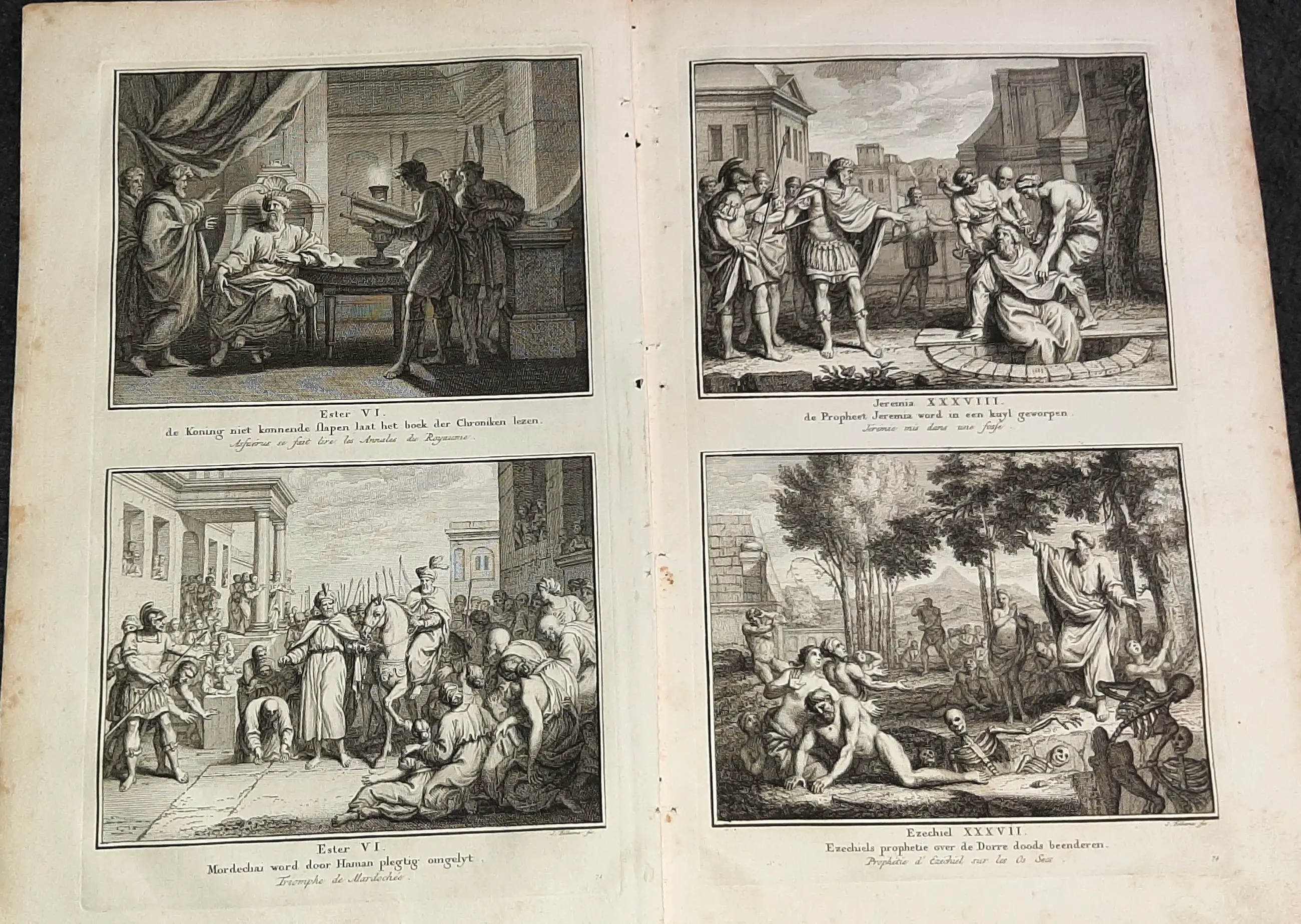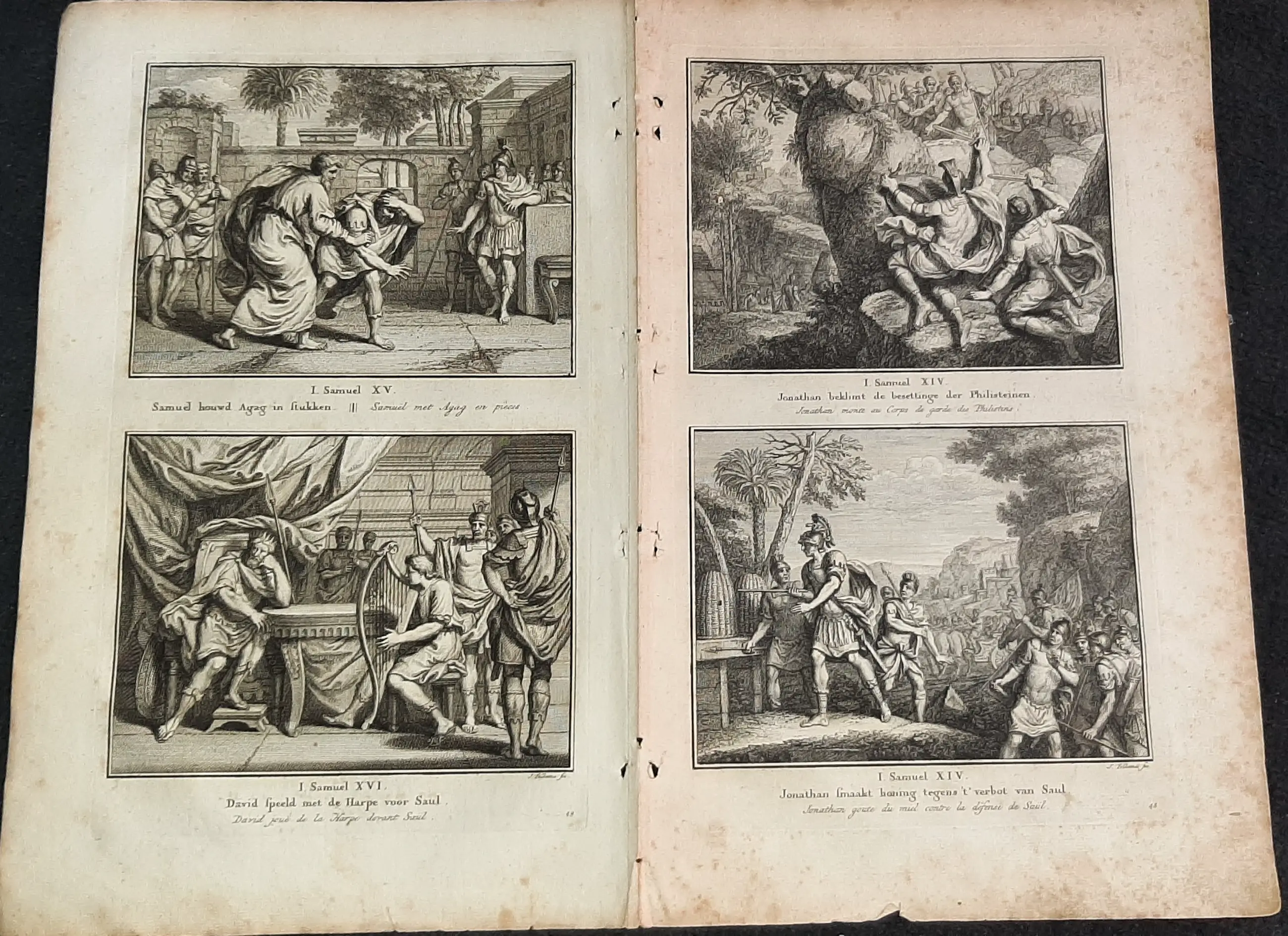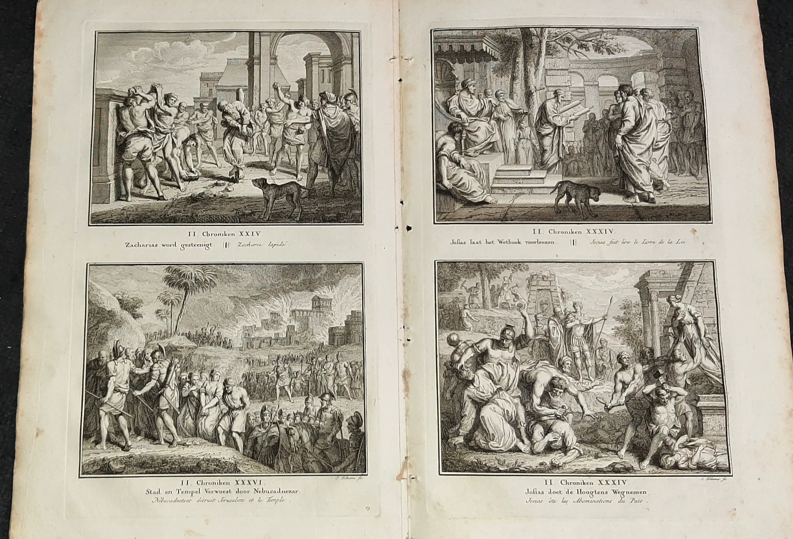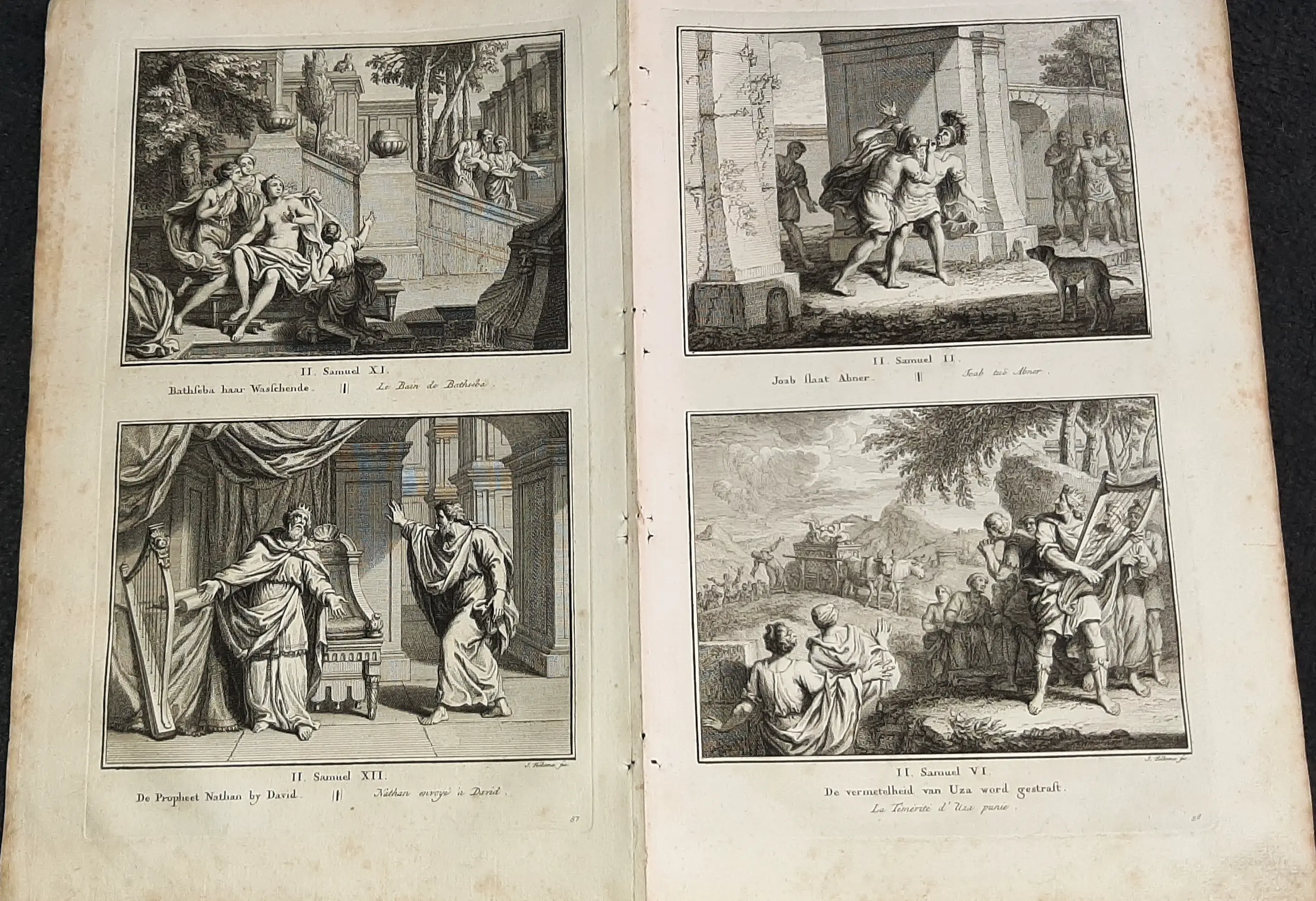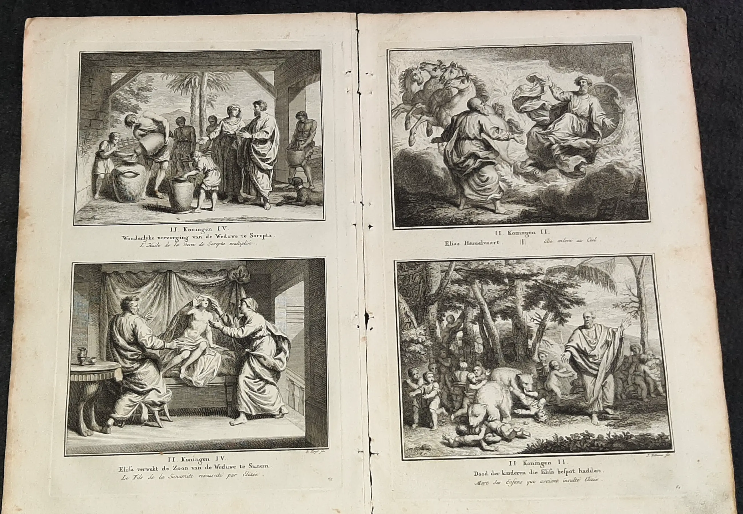 22 vellen met gravures dus 44 gravures met Bijbelse voorstellingen zijn waarschijnlijk uit een staten bijbel gehaald maat 28,5 x 25 cm