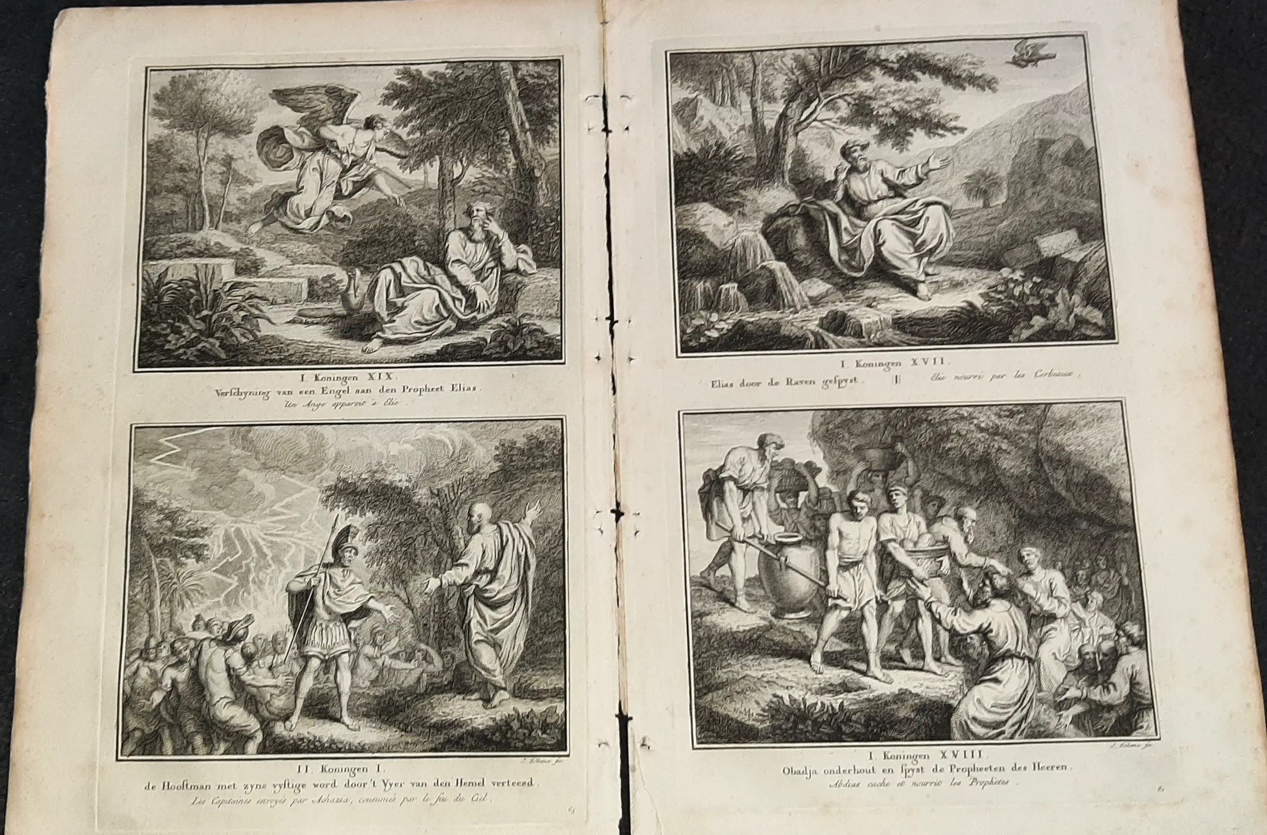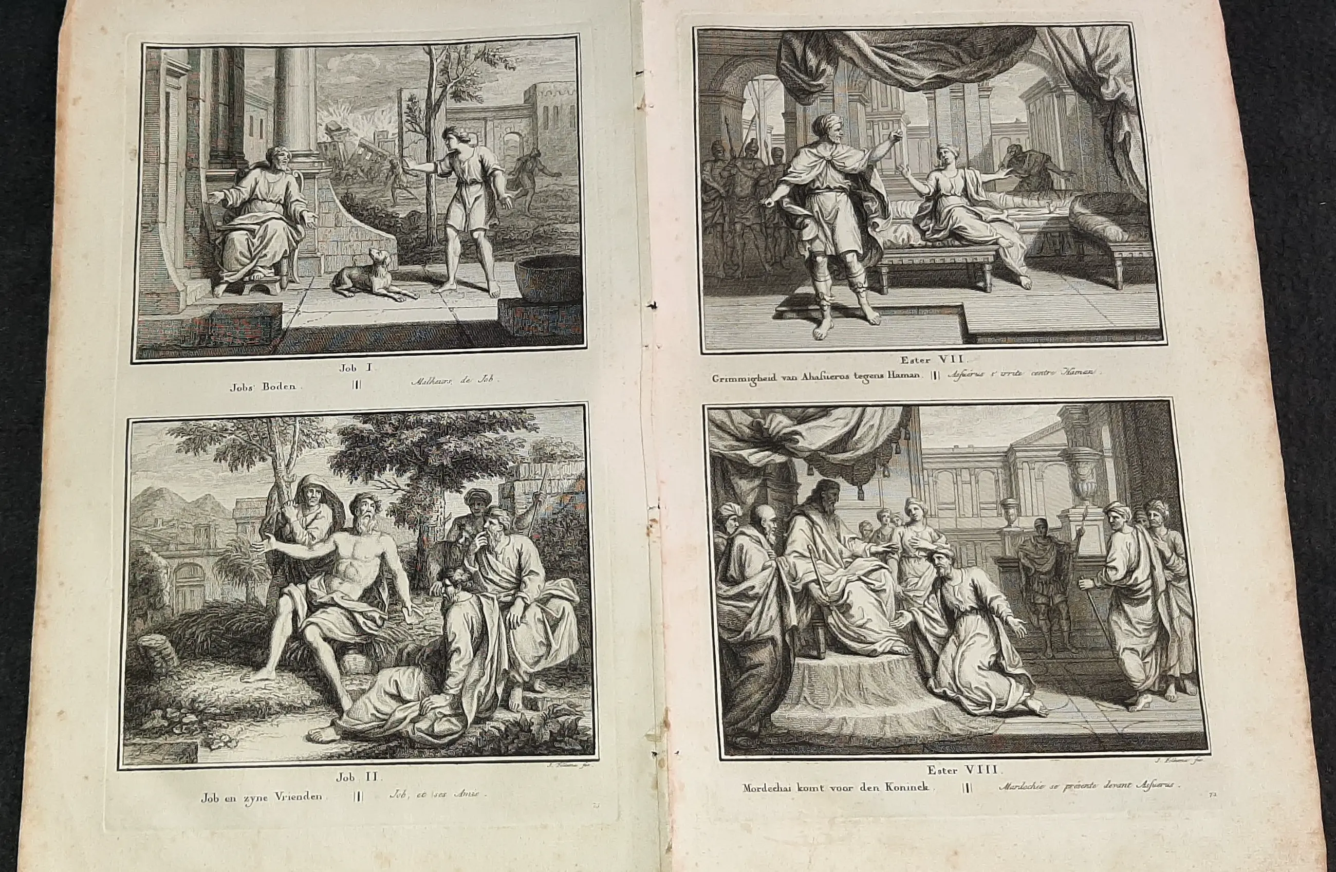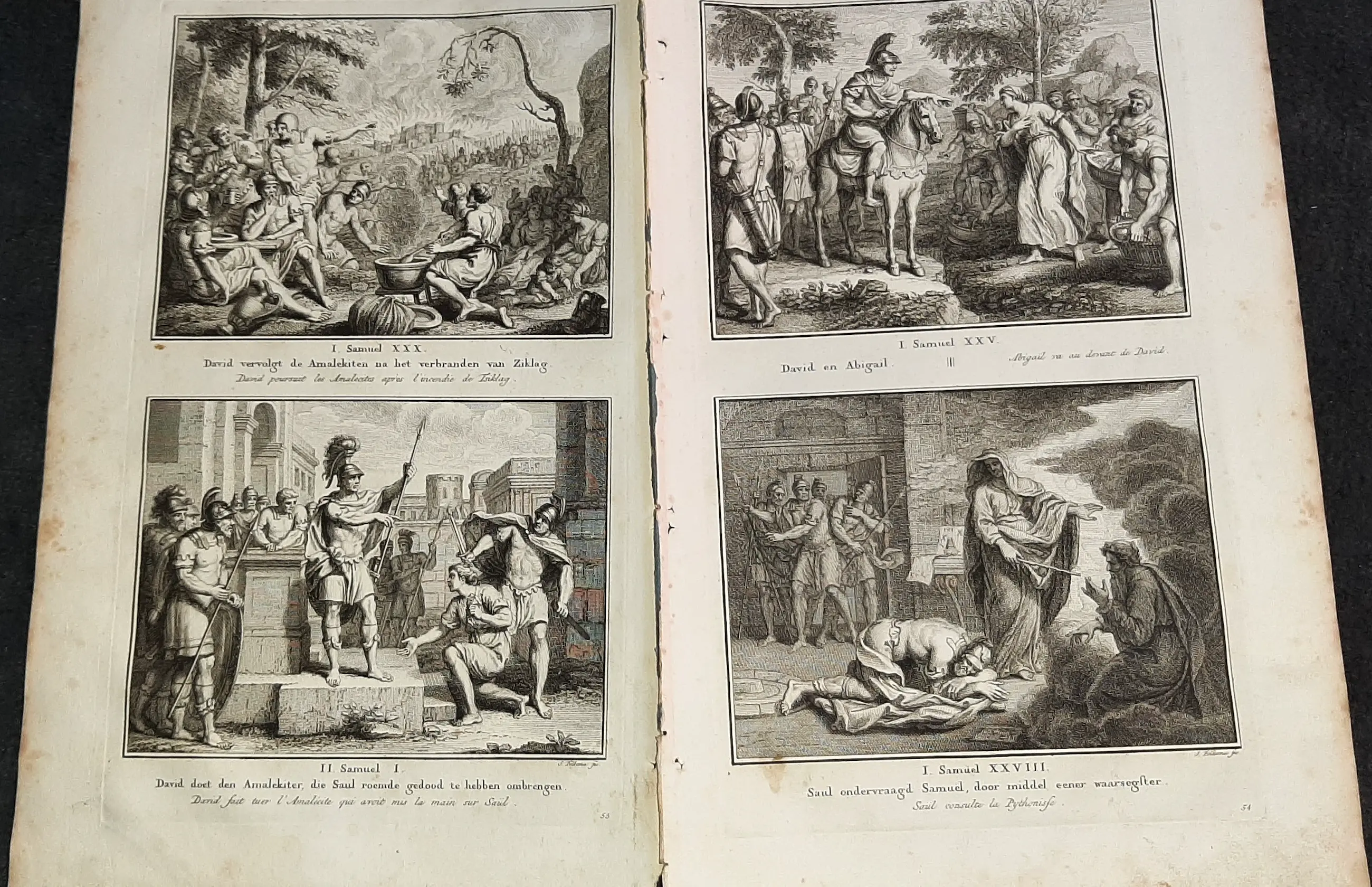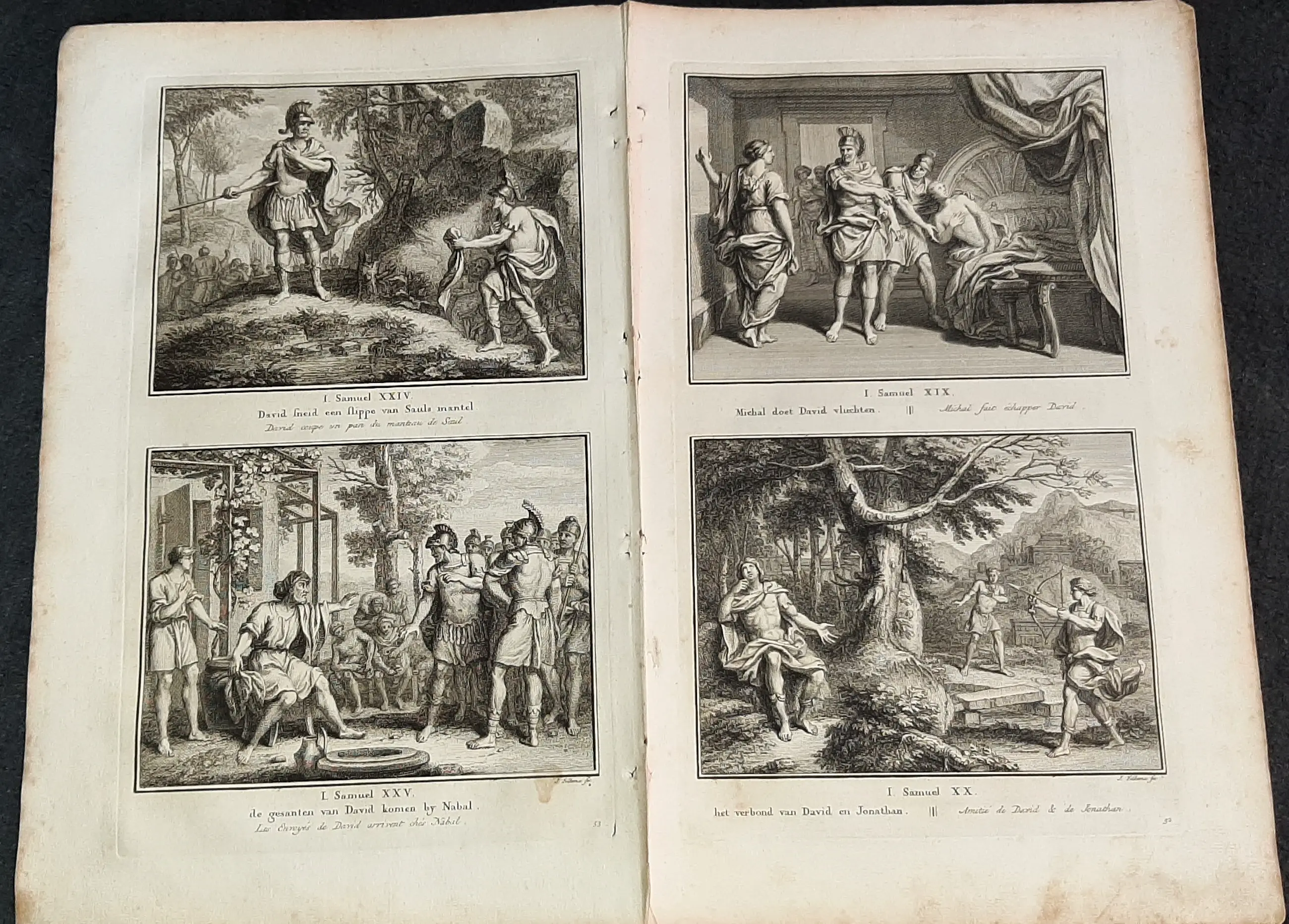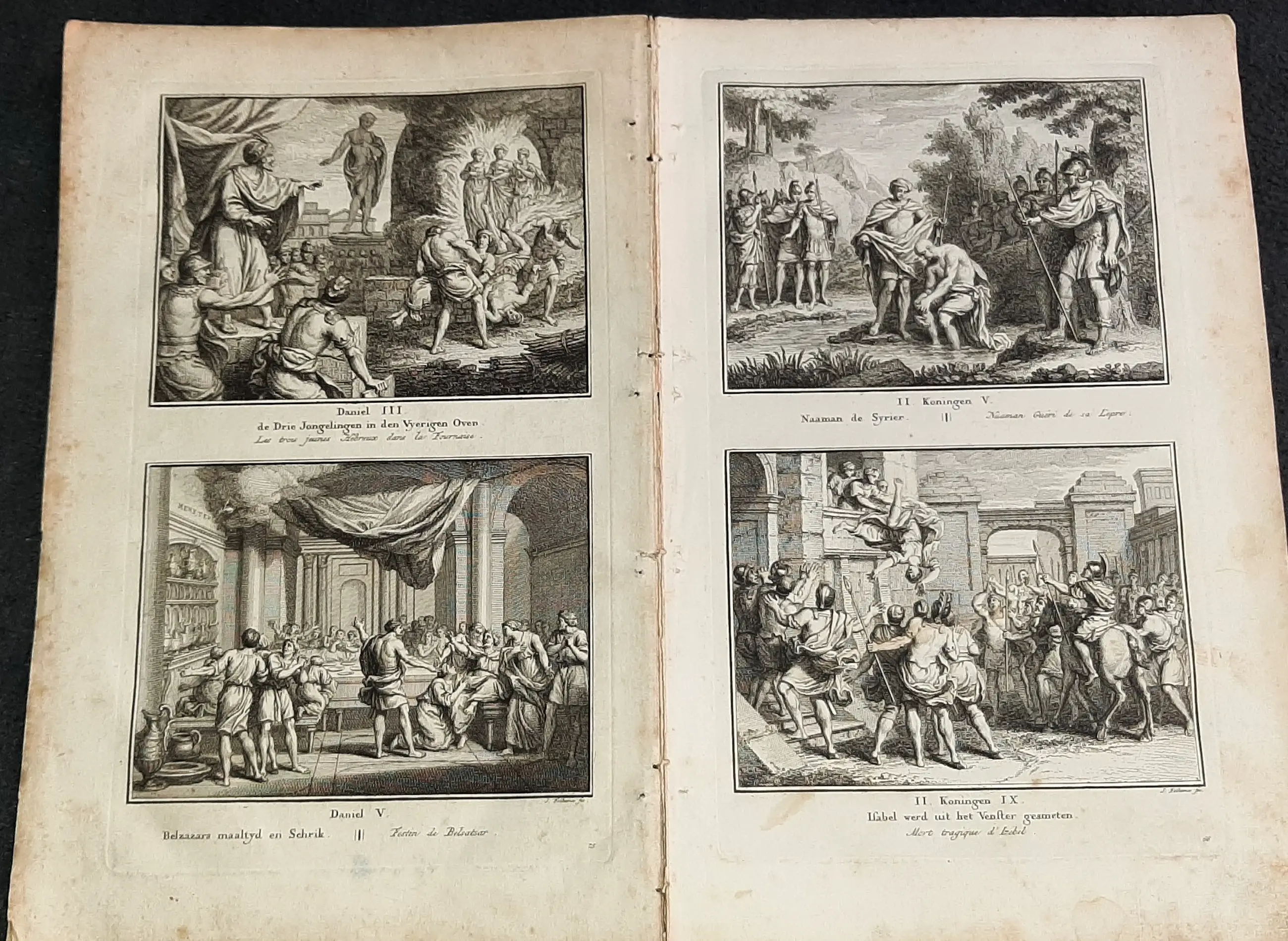 22 vellen met gravures dus 44 gravures met Bijbelse voorstellingen zijn waarschijnlijk uit een staten bijbel gehaald maat 28,5 x 25 cm