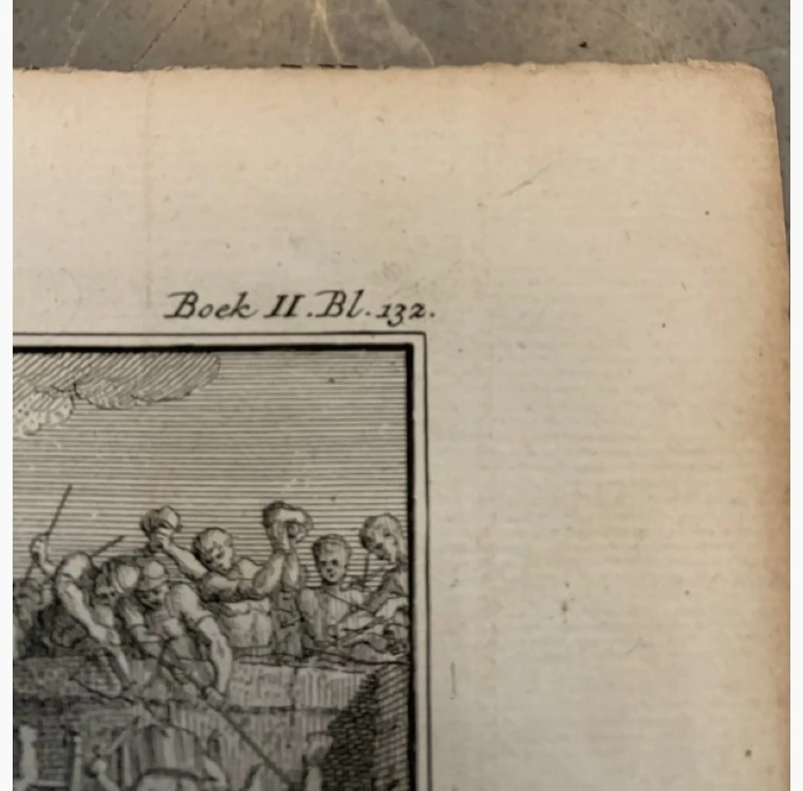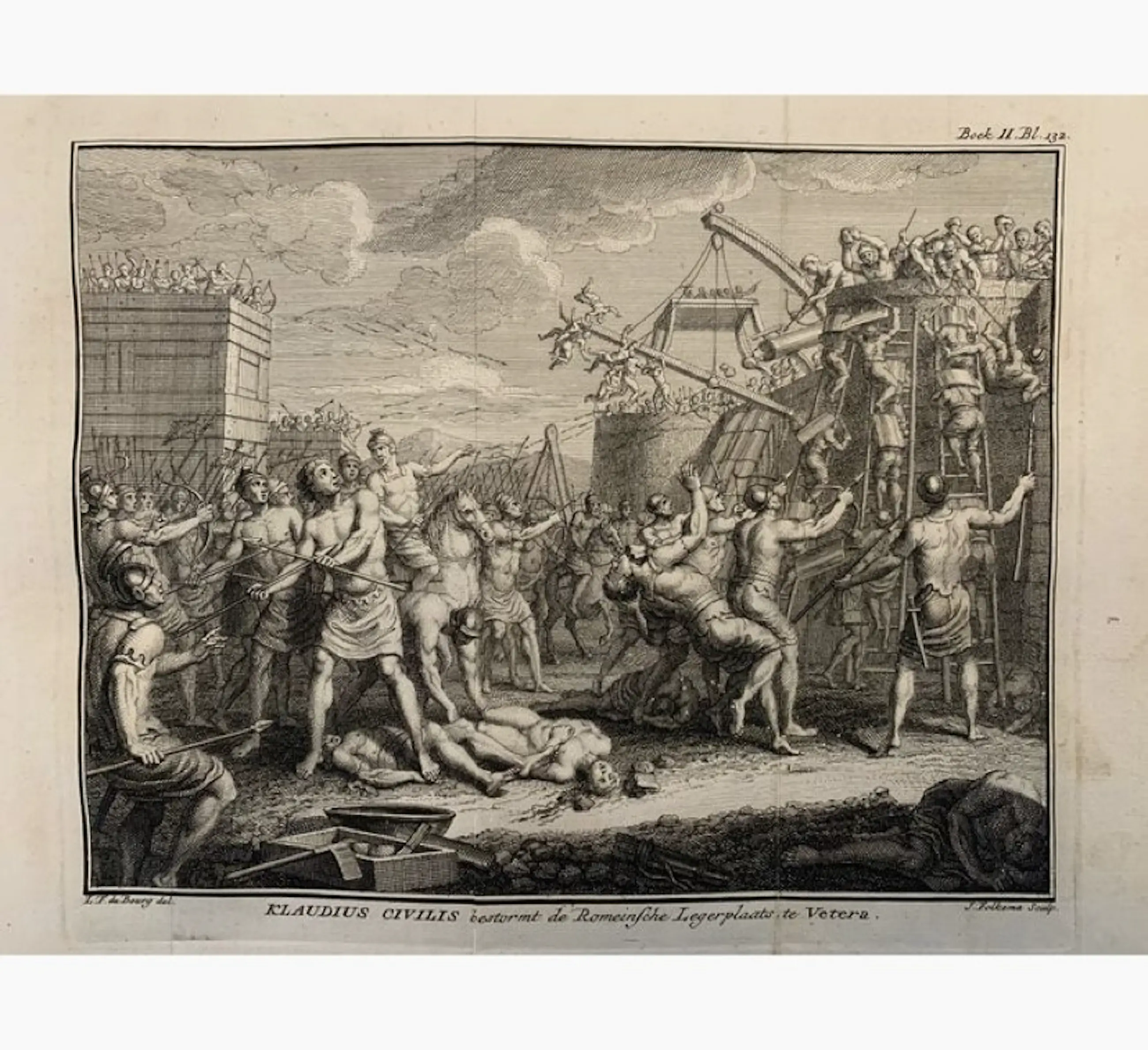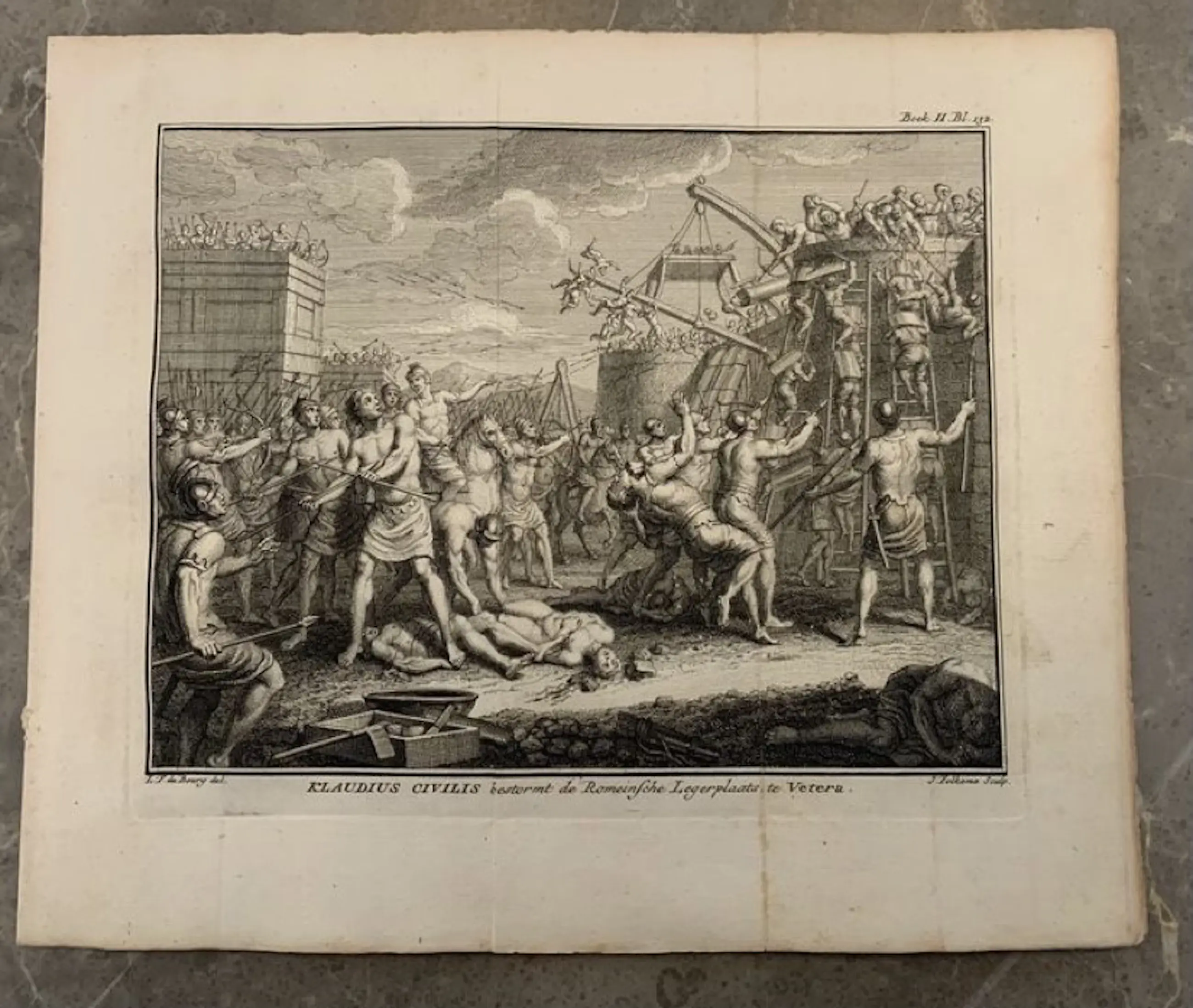 Mooie intrigerende prent afkomstig uit boek II, bladzijde 132 van de hand van Jacob Folkema (1692-1767) en Louis Fabricus Dubourg (1693-1775). Bestorming van de Romeinse legerplaats te Vetera door Germaanse stammen. Afmetingen object circa 25 x 21 cm, tekening 19,5 bij 15 cm. Kleine vouw in het midden zoals zichtbaar op foto's.