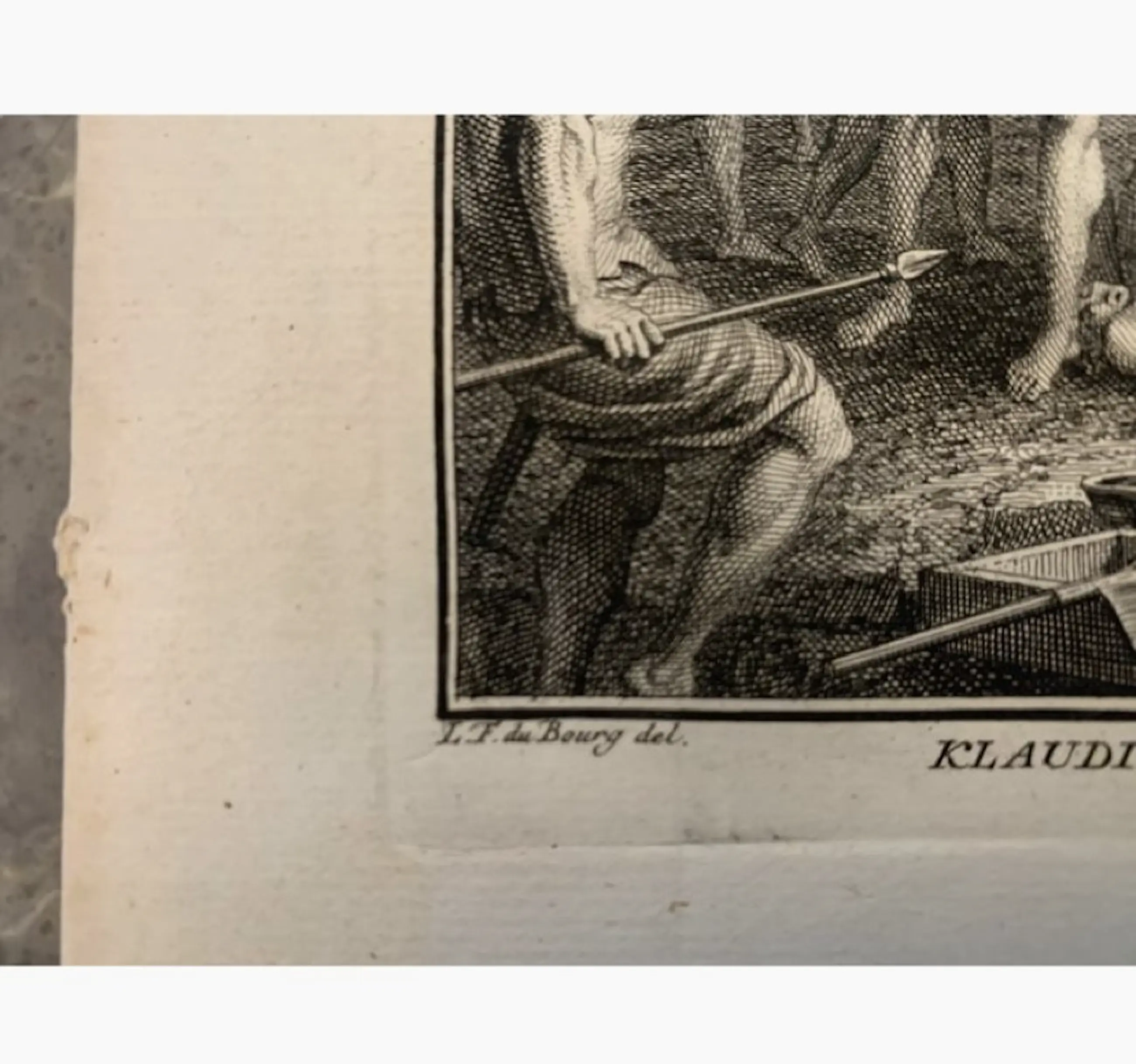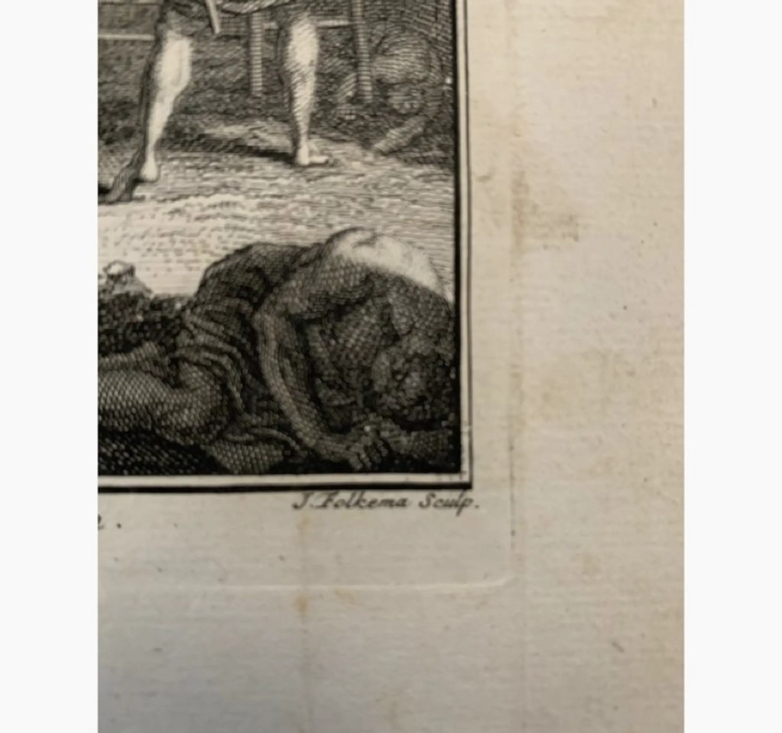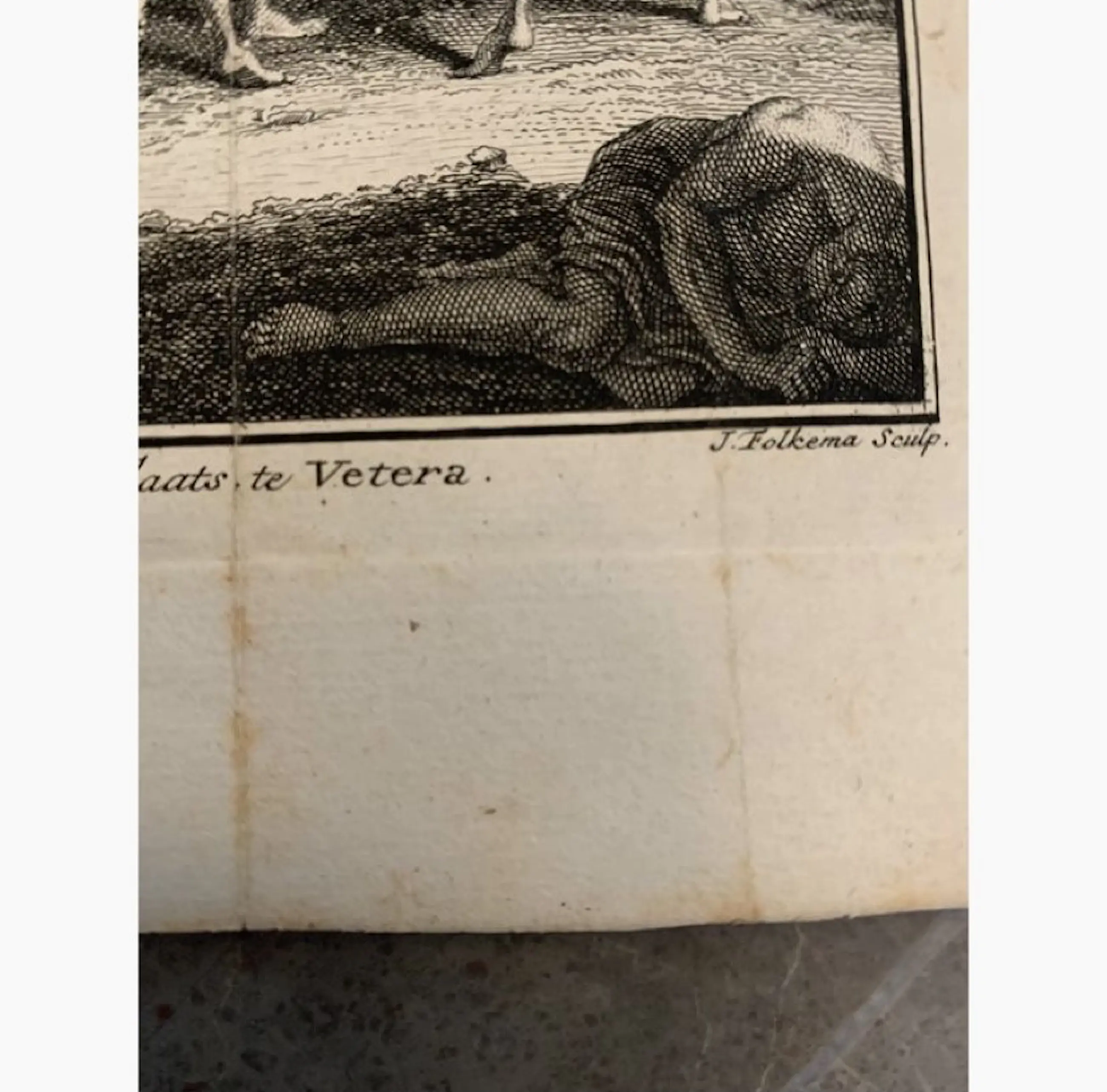 Mooie intrigerende prent afkomstig uit boek II, bladzijde 132 van de hand van Jacob Folkema (1692-1767) en Louis Fabricus Dubourg (1693-1775). Bestorming van de Romeinse legerplaats te Vetera door Germaanse stammen. Afmetingen object circa 25 x 21 cm, tekening 19,5 bij 15 cm. Kleine vouw in het midden zoals zichtbaar op foto's.