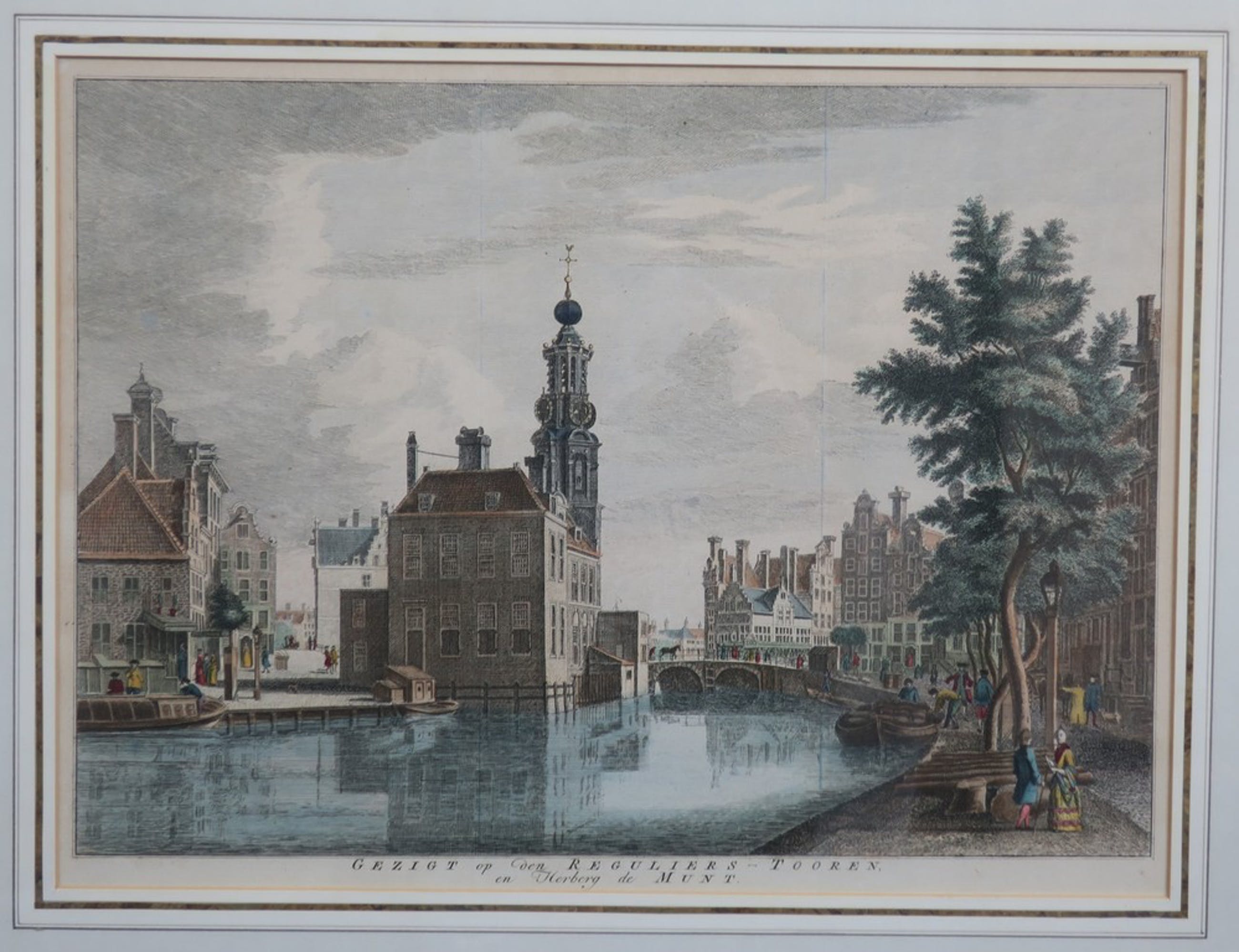 Handgekleurde Kopergravure van de Regulierstoren en herberg de Munt te Amsterdam, gegraveerd door Jacob Folkema.