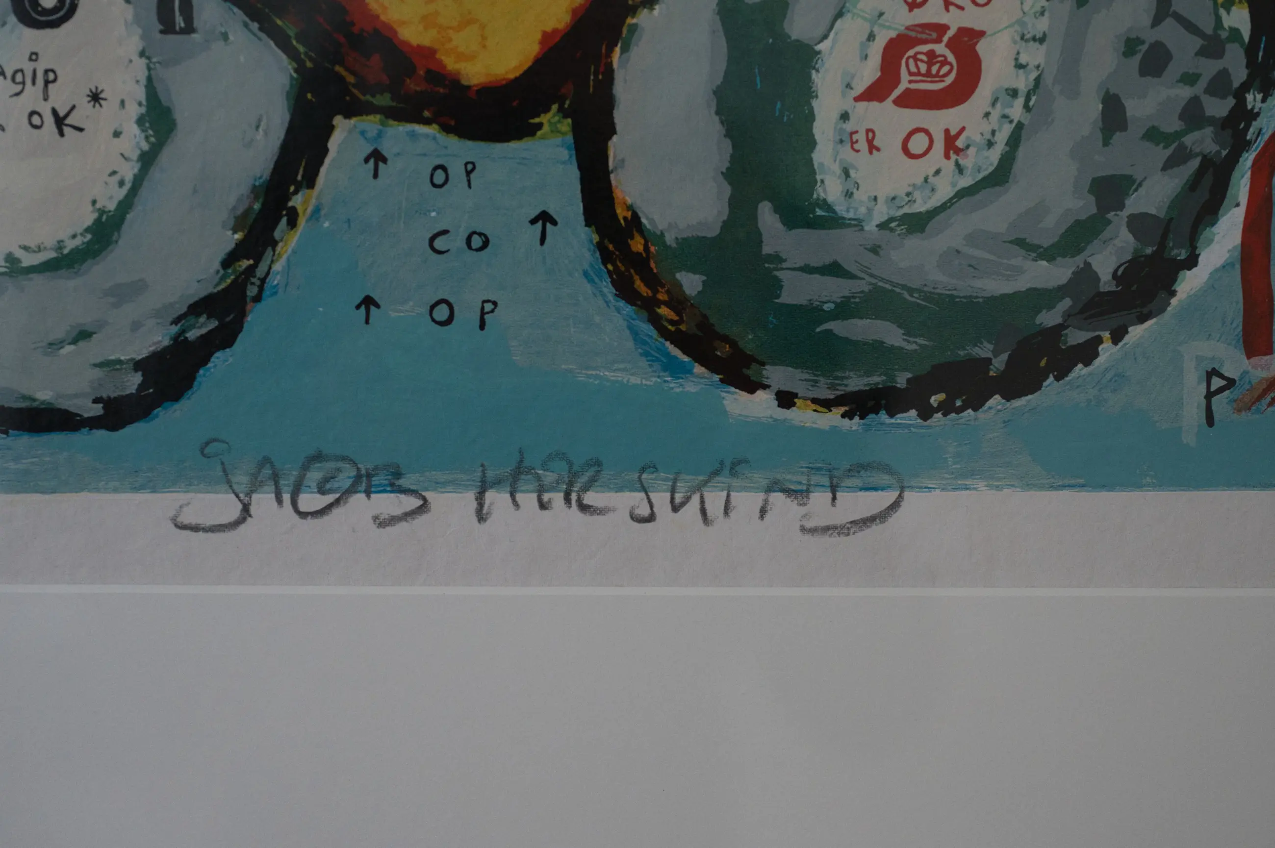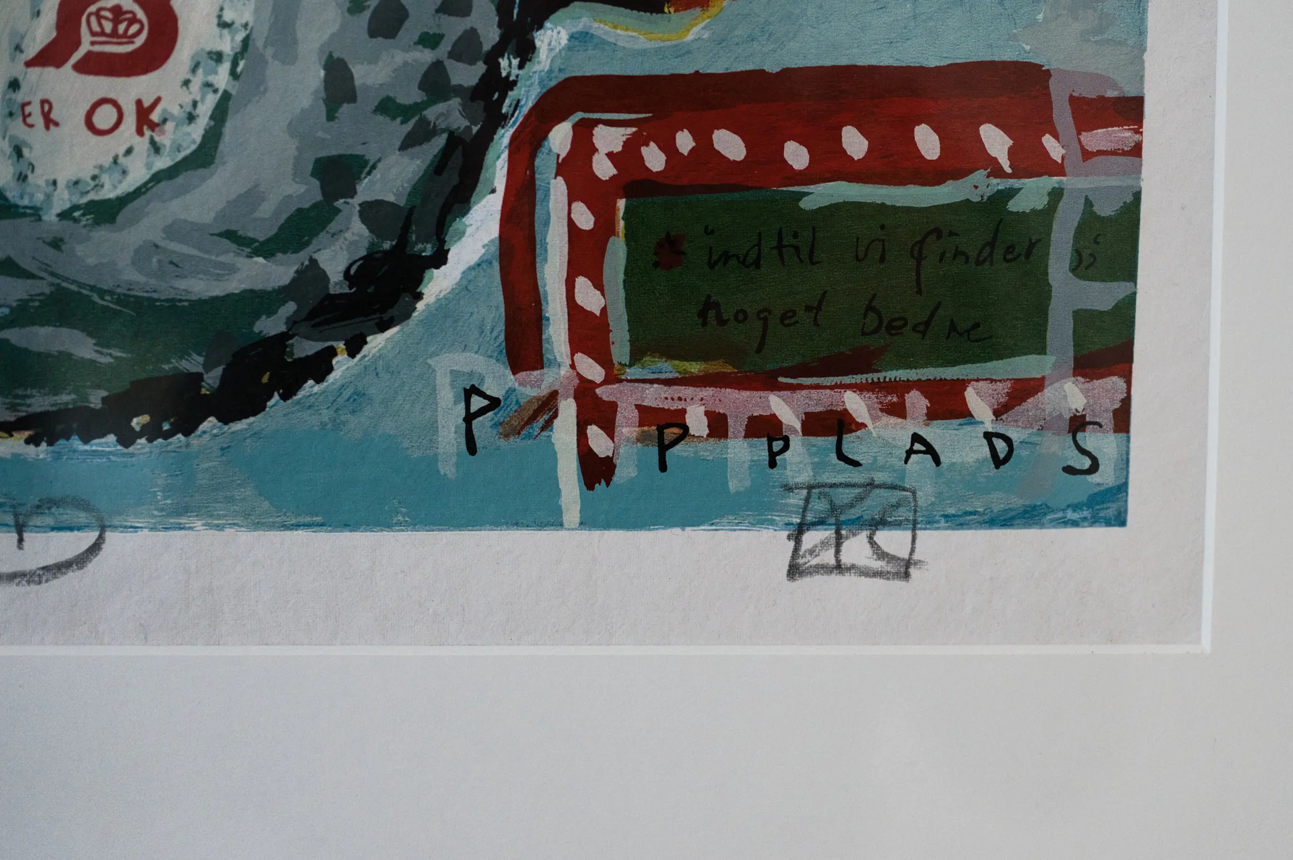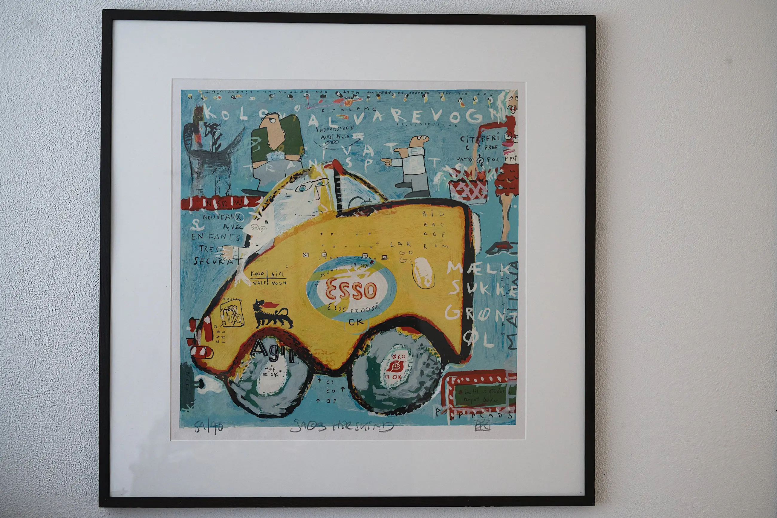 Grafisch werk van Herskind met een combinatie van figuratieve elementen, tekst en kleur. De voorstelling verwijst naar reclame en infrastructuur en past binnen de conceptueel-moderne beeldtaal van de kunstenaar.
