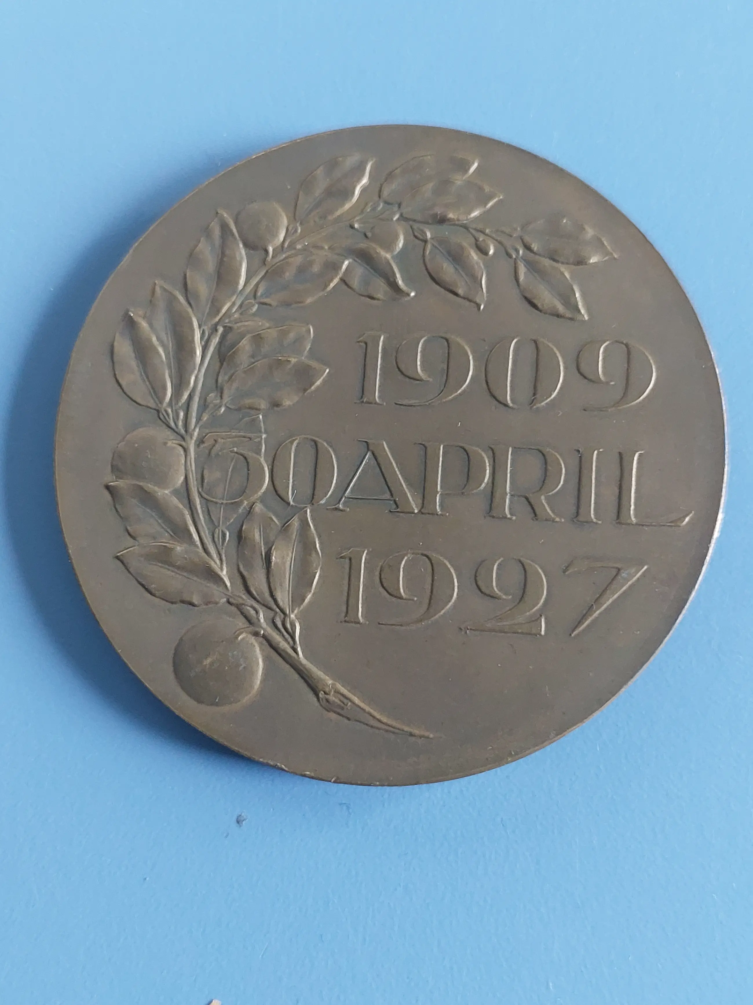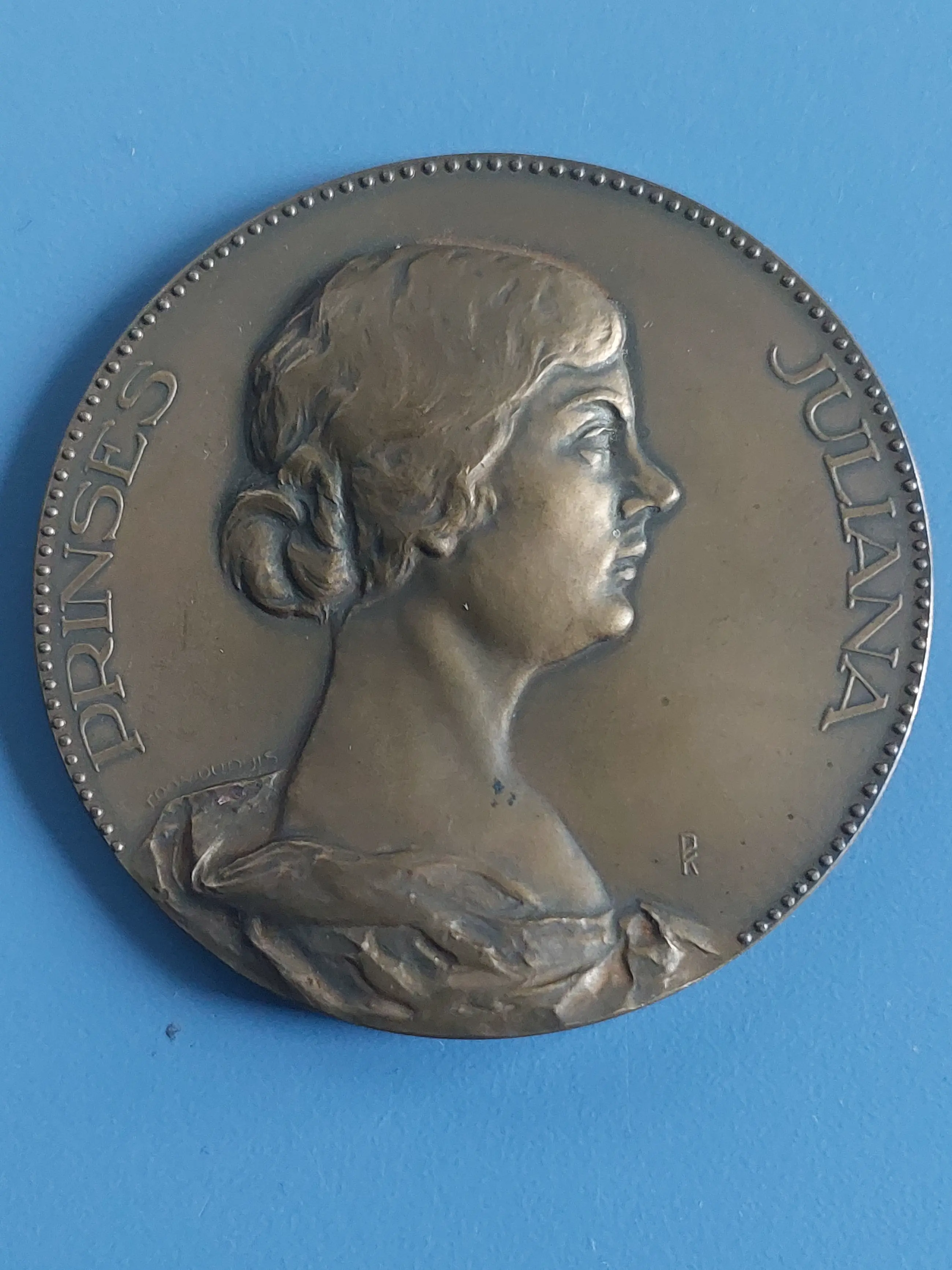 Prinses Juliana kwam al voor op de eerste penning van de Vereniging, en hier opnieuw ter gelegenheid van haar achttiende de verjaardag. 'Zij heeft welwillend enige keren voor den kunstenaar in het Paleis Noordeinde geposeerd' schrijft het jaarverslag. Het is een conventioneel, naar rechts gewend borstbeeld met een ruim fond en en bescheiden belettering. Waarschijnlijk geen uitdaging voor Dupuis. De keerzijde geeft in een fraaie kromming een bloeiende oranjetak met sinaasappels en in heldere typografie de jaartallen.