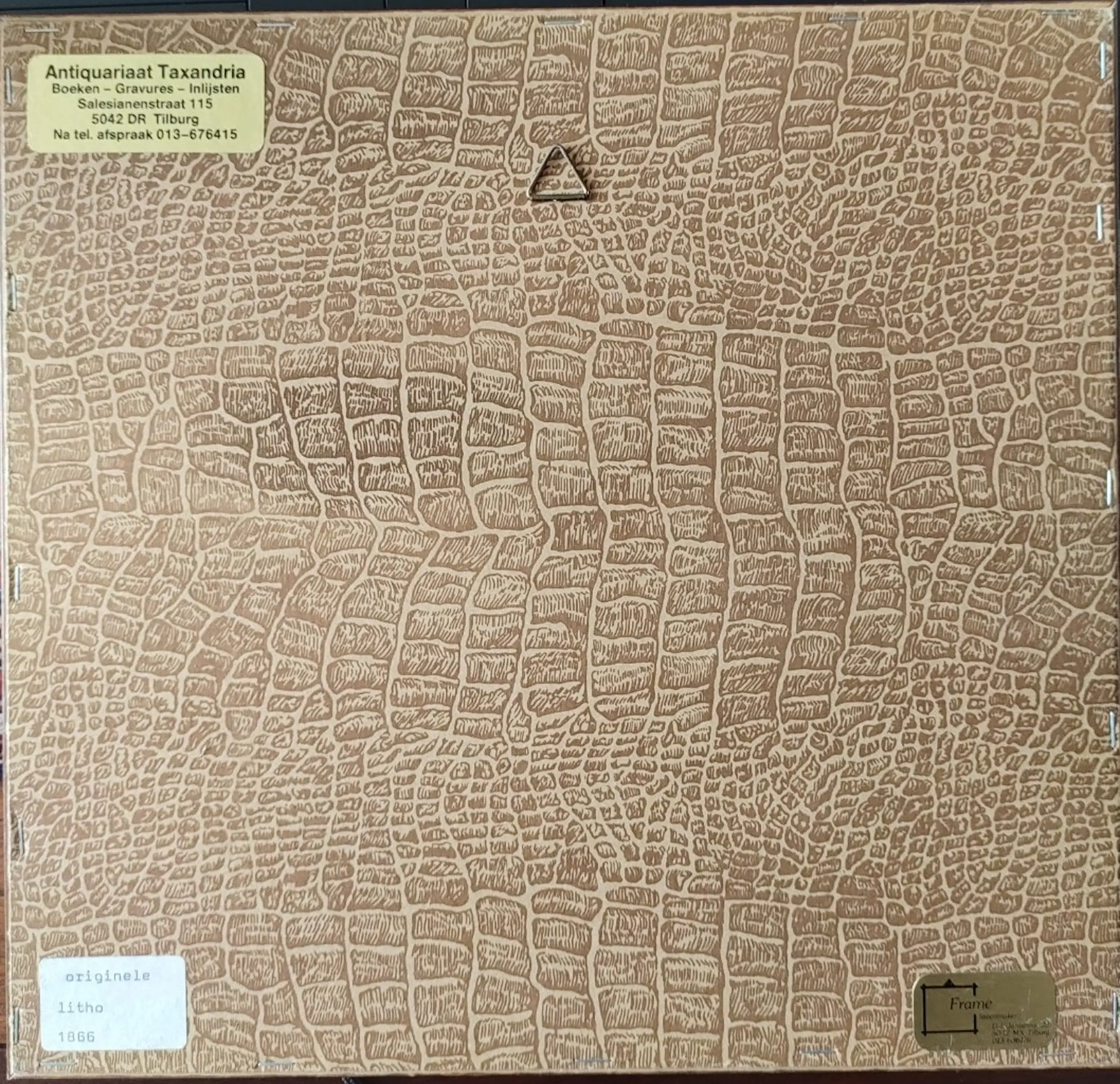 Alleen de lijst vertoont wat kleine gebruikssporen. De litho is door een gerenommeerde antiquariaat Taxandria in Tilburg ingelijst en sindsdien nooit meer opnieuw ingelijst. De eigenaren van Antiquariaat Taxandria in Tilburg waren Jan en Marie van den Broek.