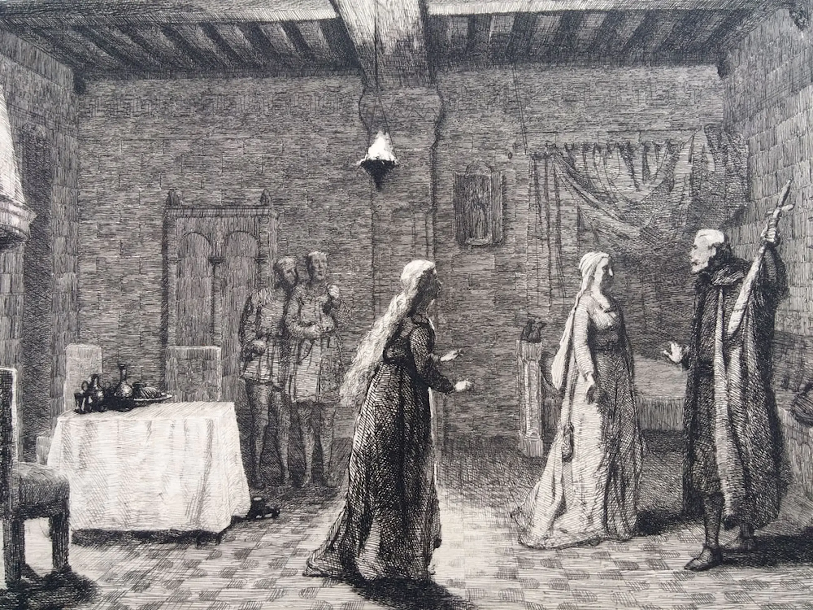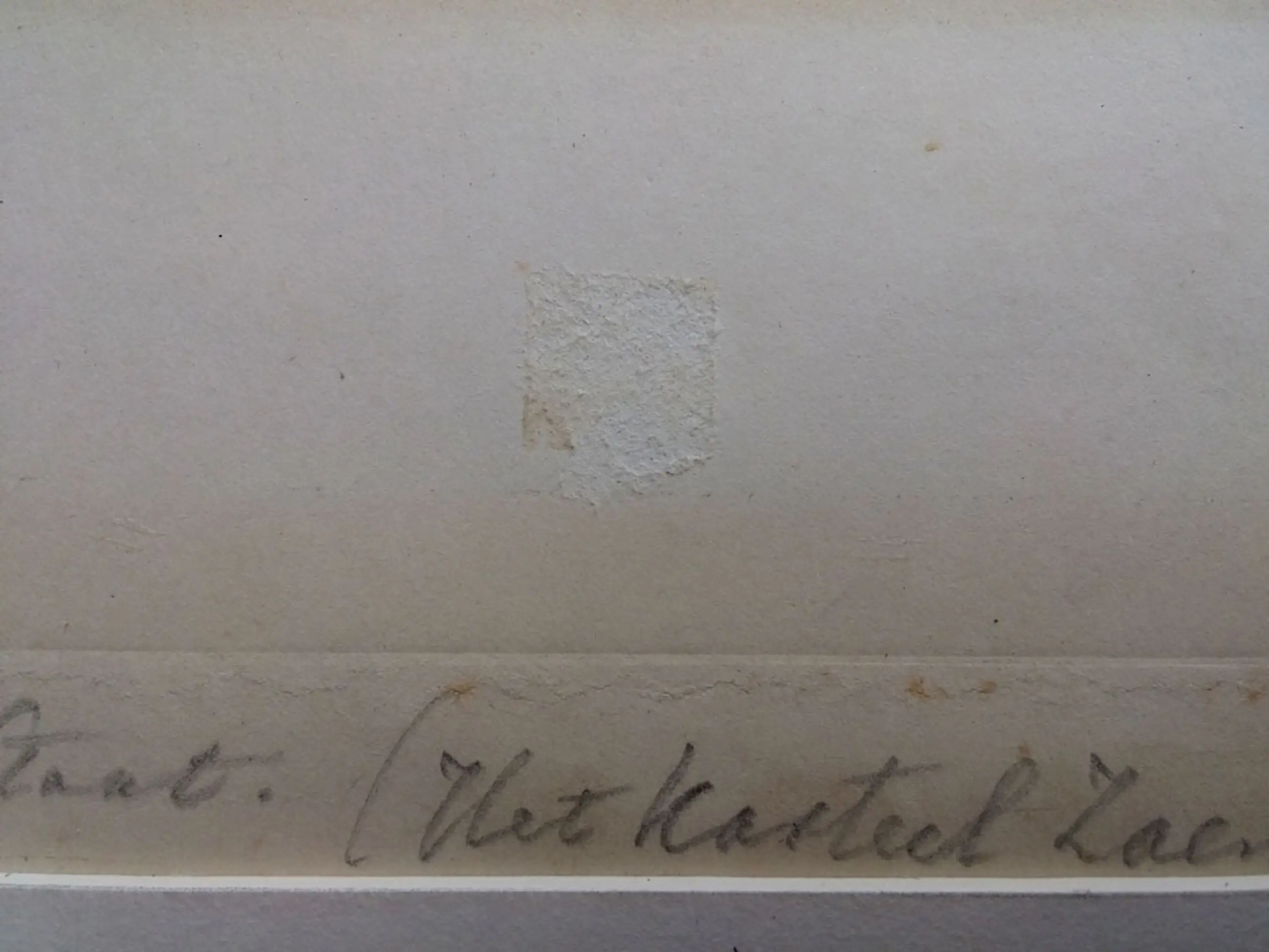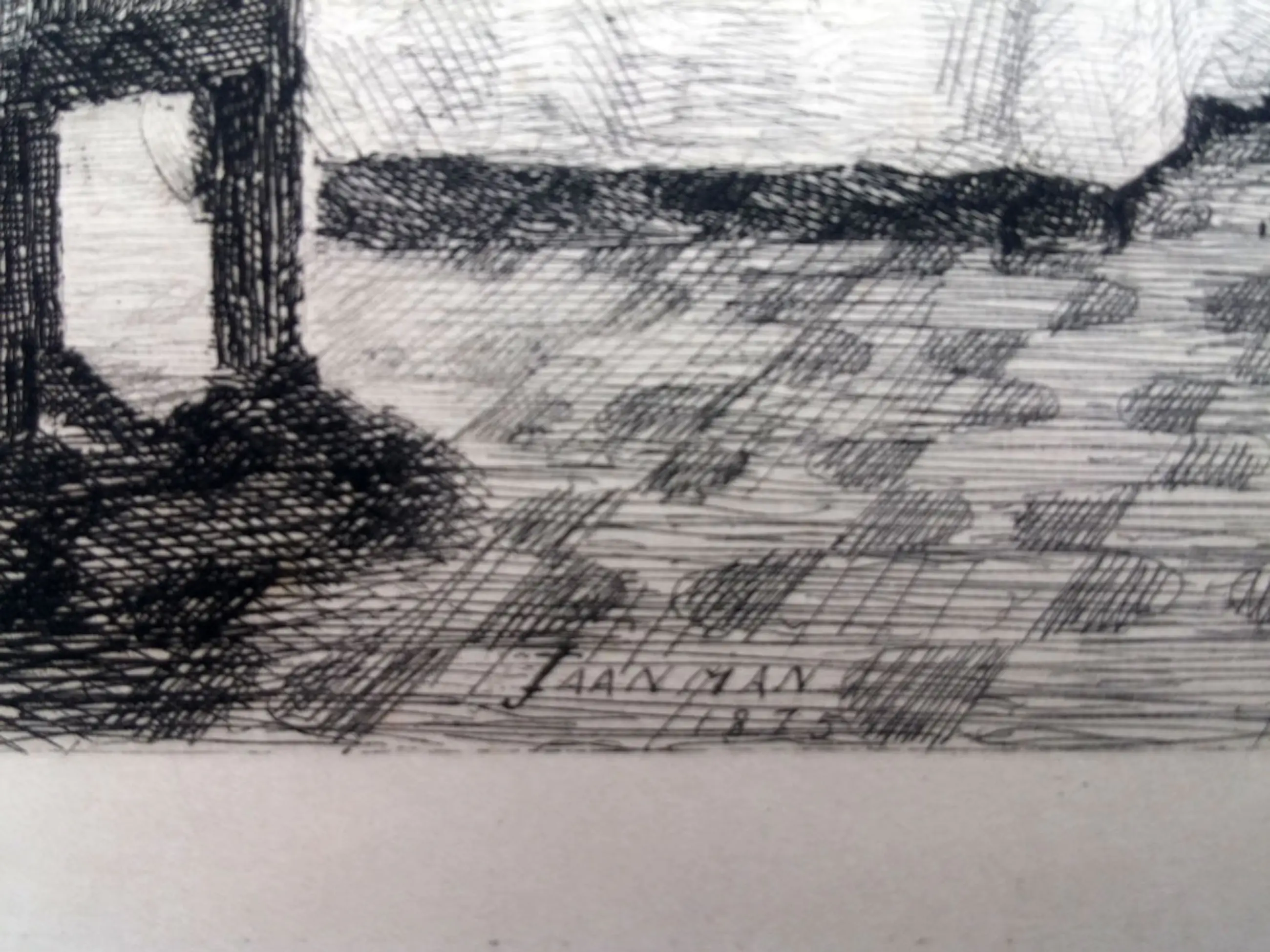 Onbewerkte staat. Ets uit 1875. Tussen beeld en signatuur is het papier iets beschadigd door het vastplakken van een oud passe-partout. (zie foto). Gesigneerd op de etsplaat én onder de afdruk met potlood. Wordt verzonden in een stevige kartonnen koker.