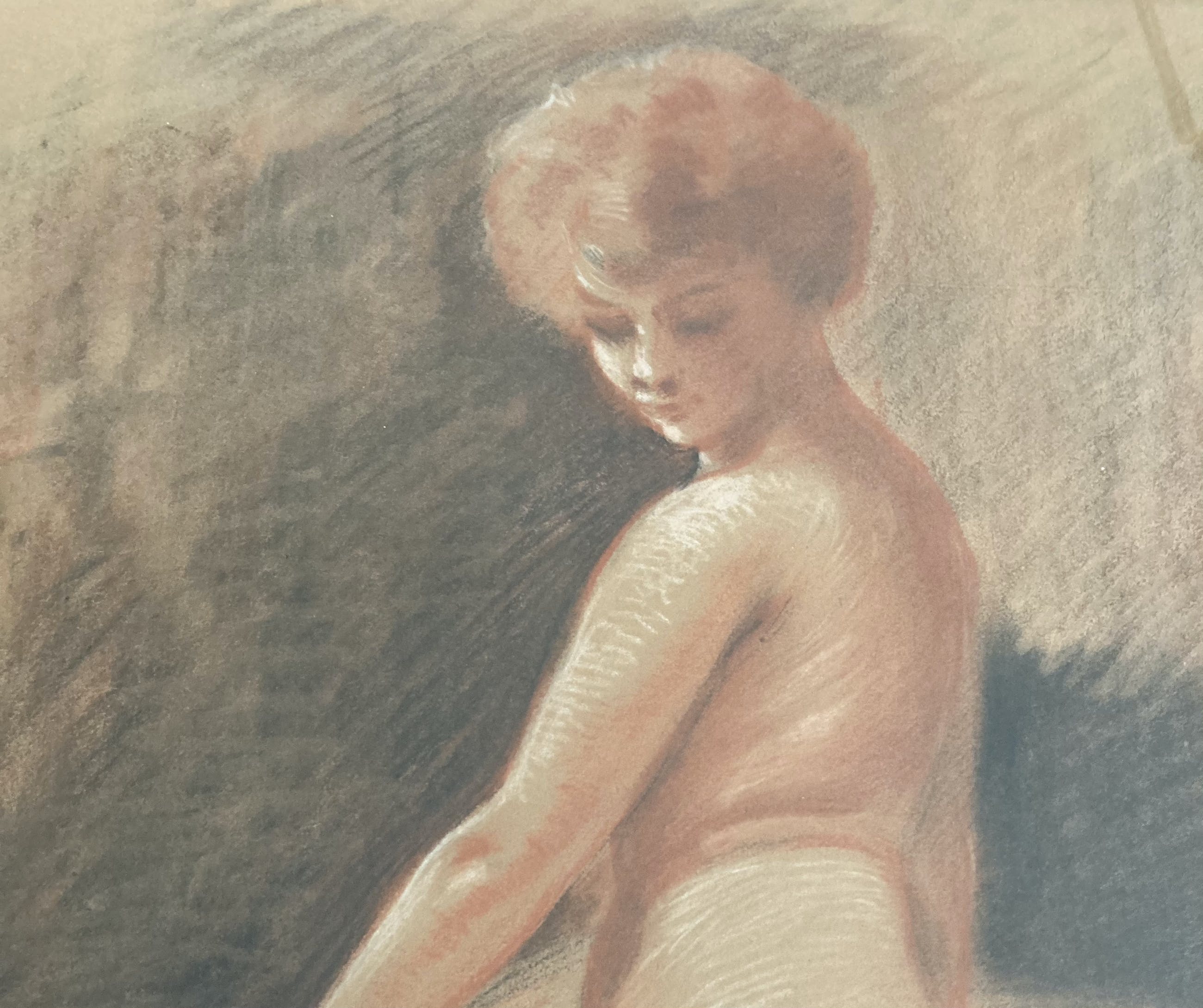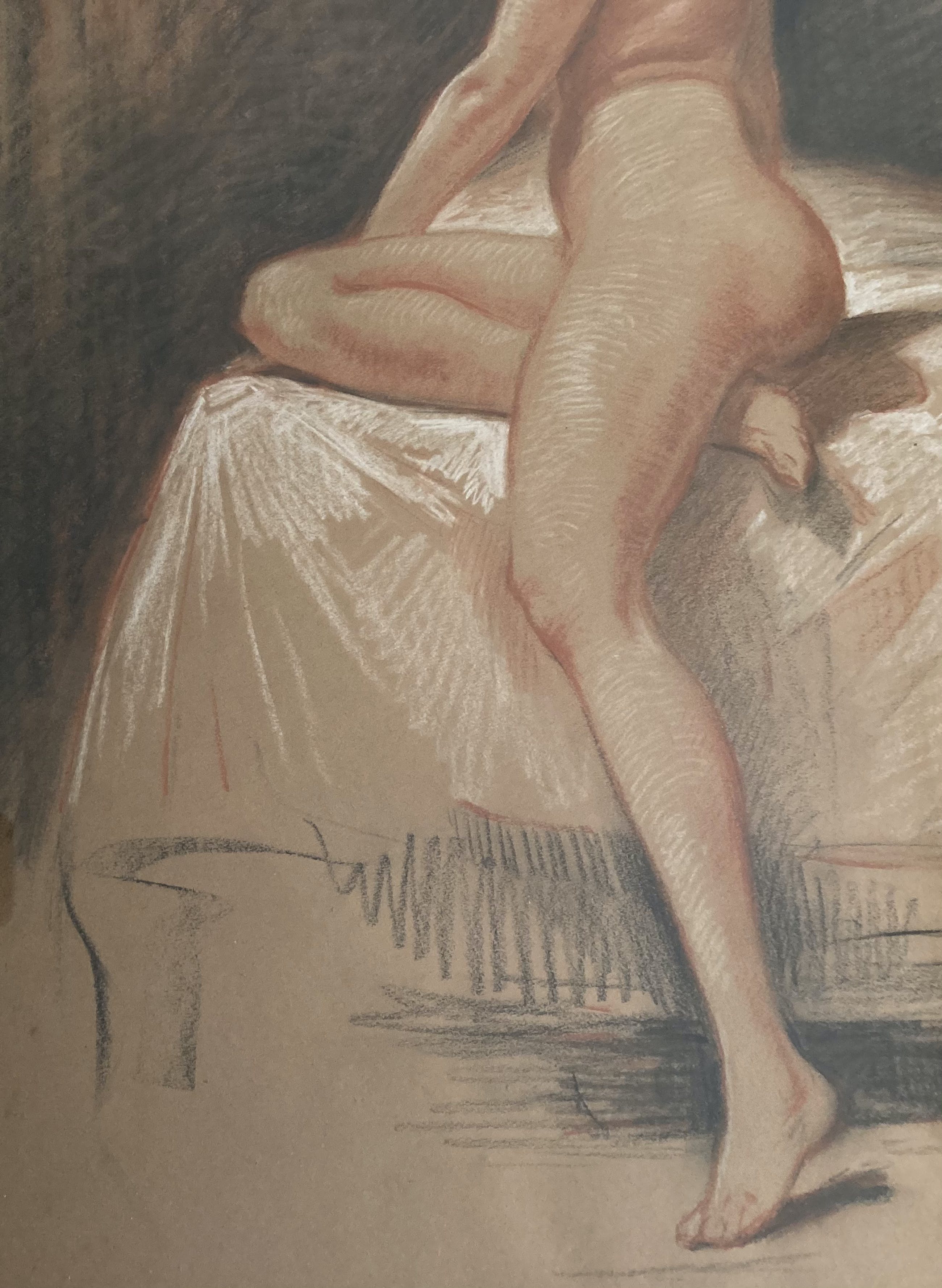 Vrouwelijk naakt op bed: 61,5 x 41,5 cm. (68 x 48). Vrouwelijk naakt voor gordijn: 64 x 38,5 cm. (71 x 45).
