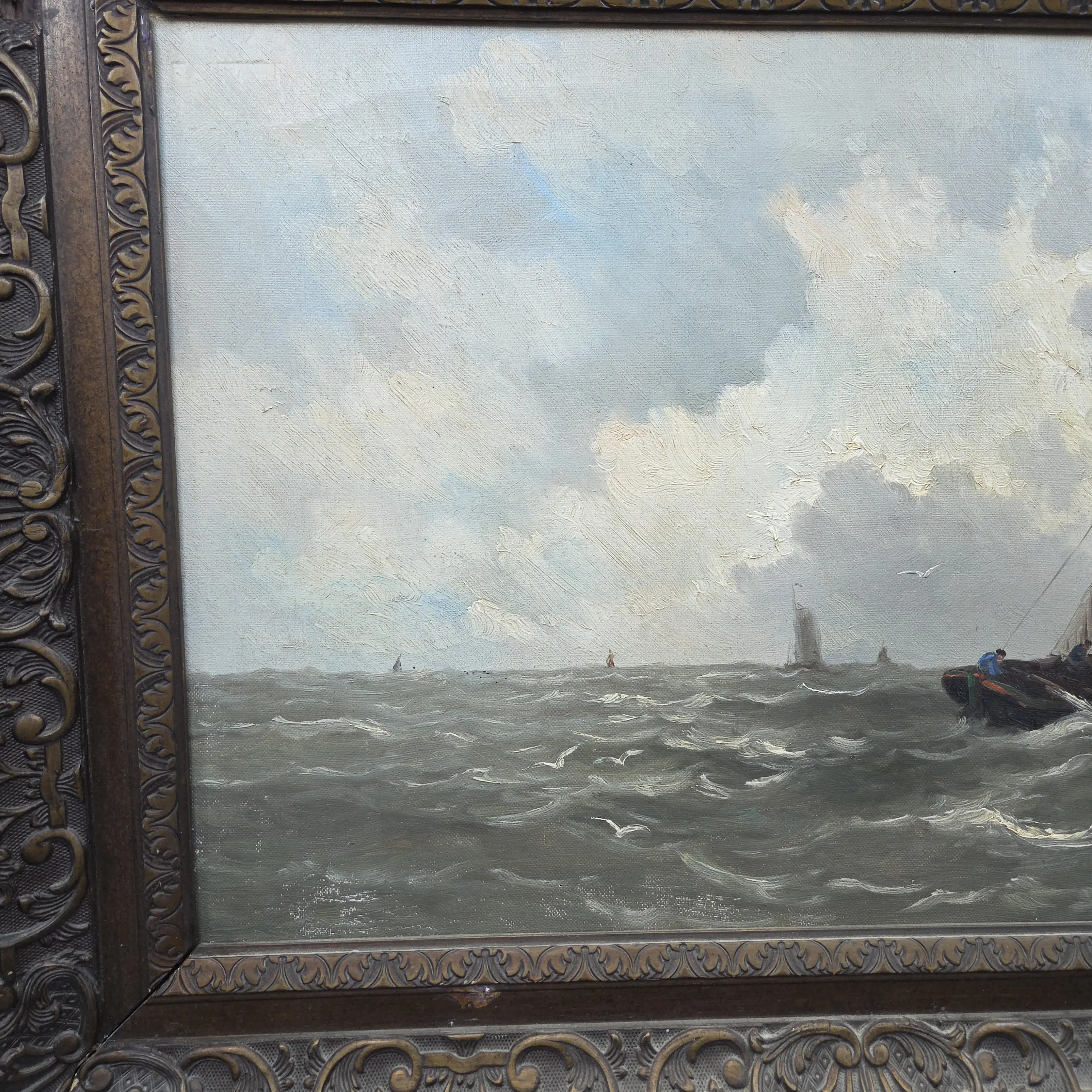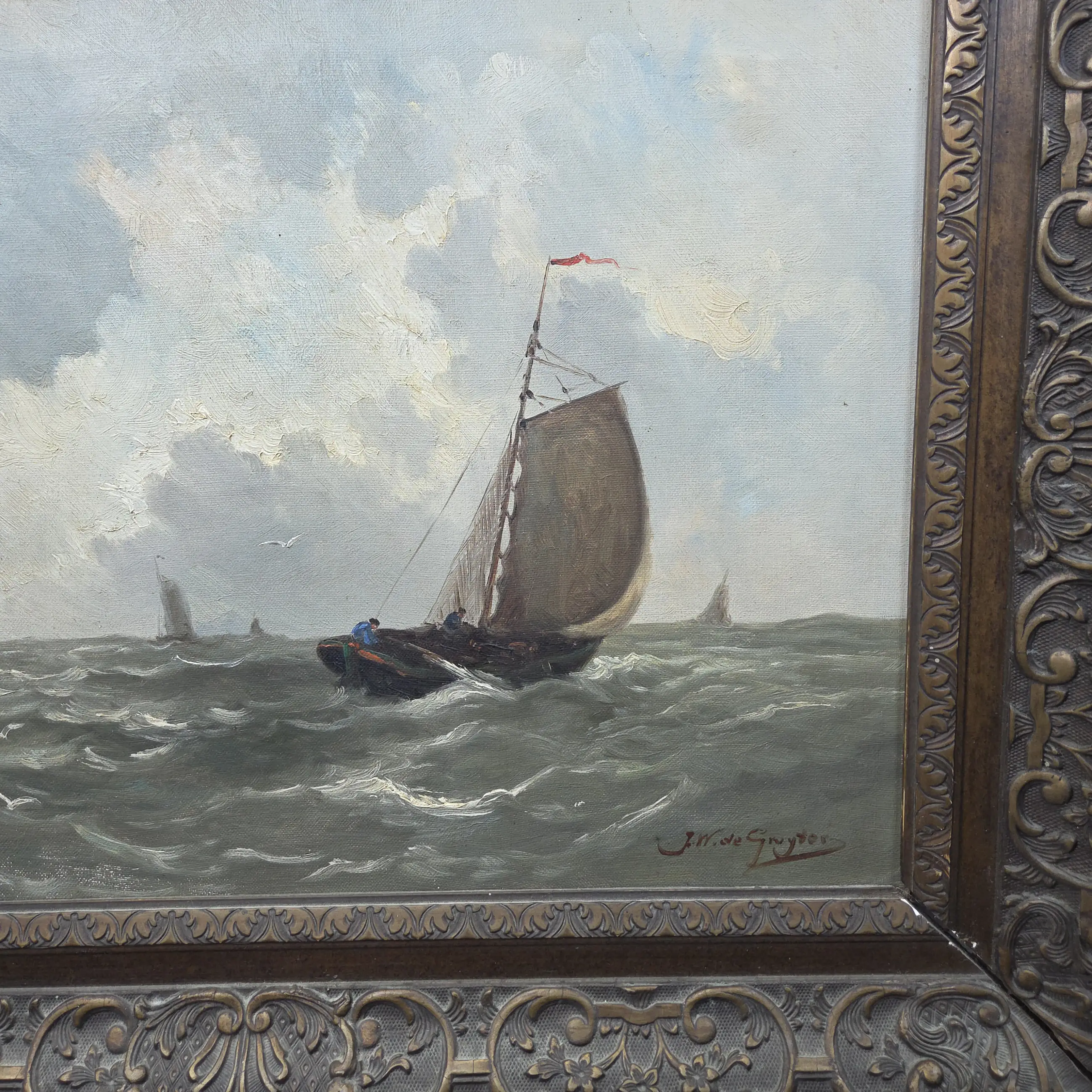 Sfeervol maritiem olieverfschilderij van de bekende Nederlandse kunstenaar Jacob Willem Gruijter (1856–1908). Het werk toont een zeilboot op een licht woelige zee onder een indrukwekkende, bewolkte lucht. Op de achtergrond zijn meerdere zeilschepen zichtbaar, wat het schilderij extra diepte en dynamiek geeft.