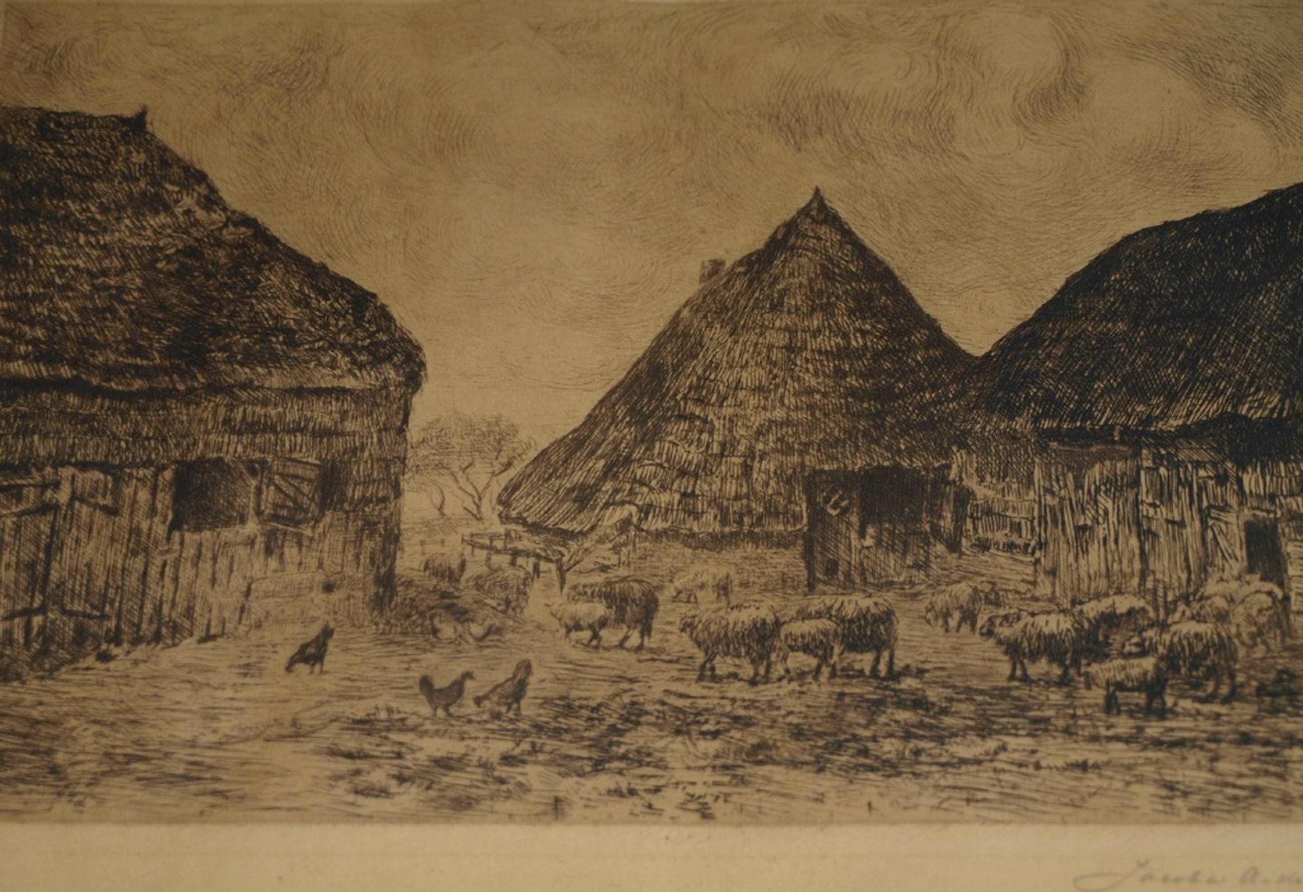 Een ets van de Nederlandse kunstenares Jacoba de Graaff met een voorstelling van een boerenerf.