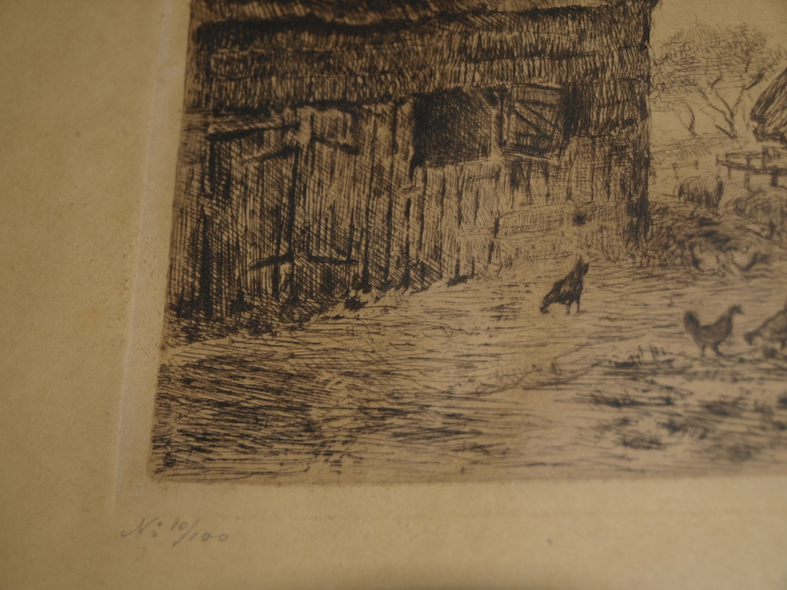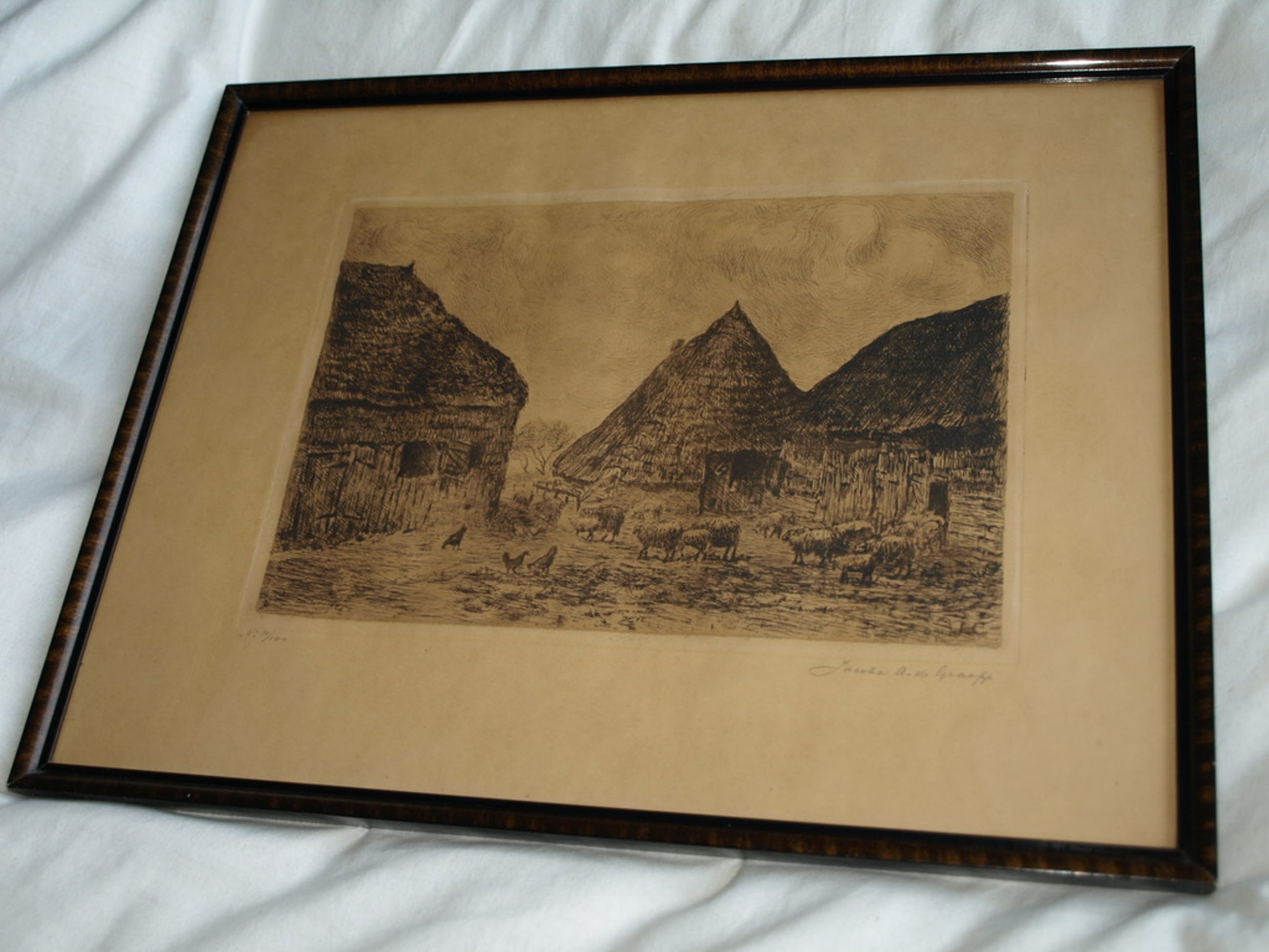 De ets is gesigneerd met potlood en ingelijst in de originele houten lijst met glasplaat.