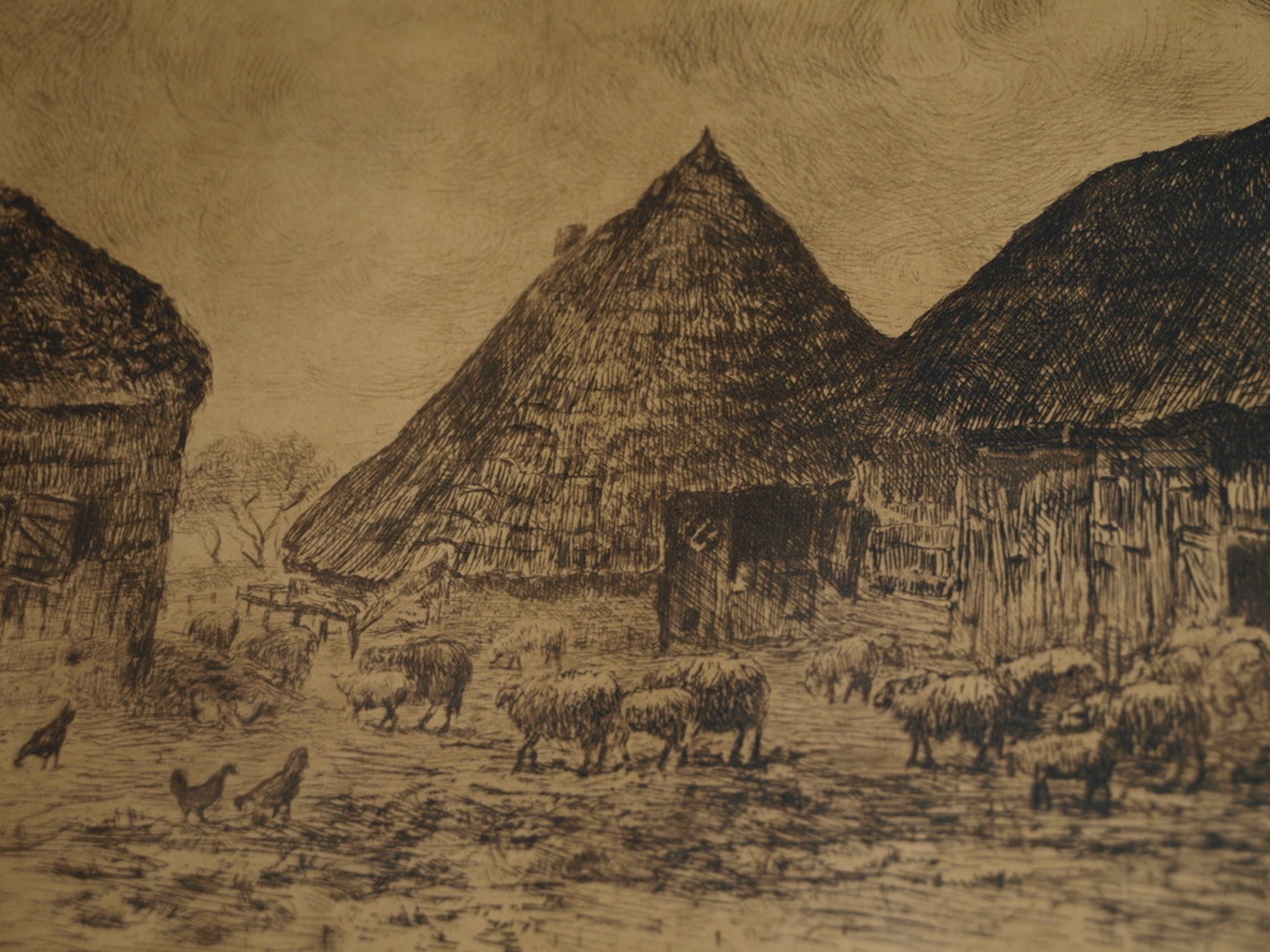 Ingelijst: De ets is ingelijst in de originele houten lijst met glasplaat.