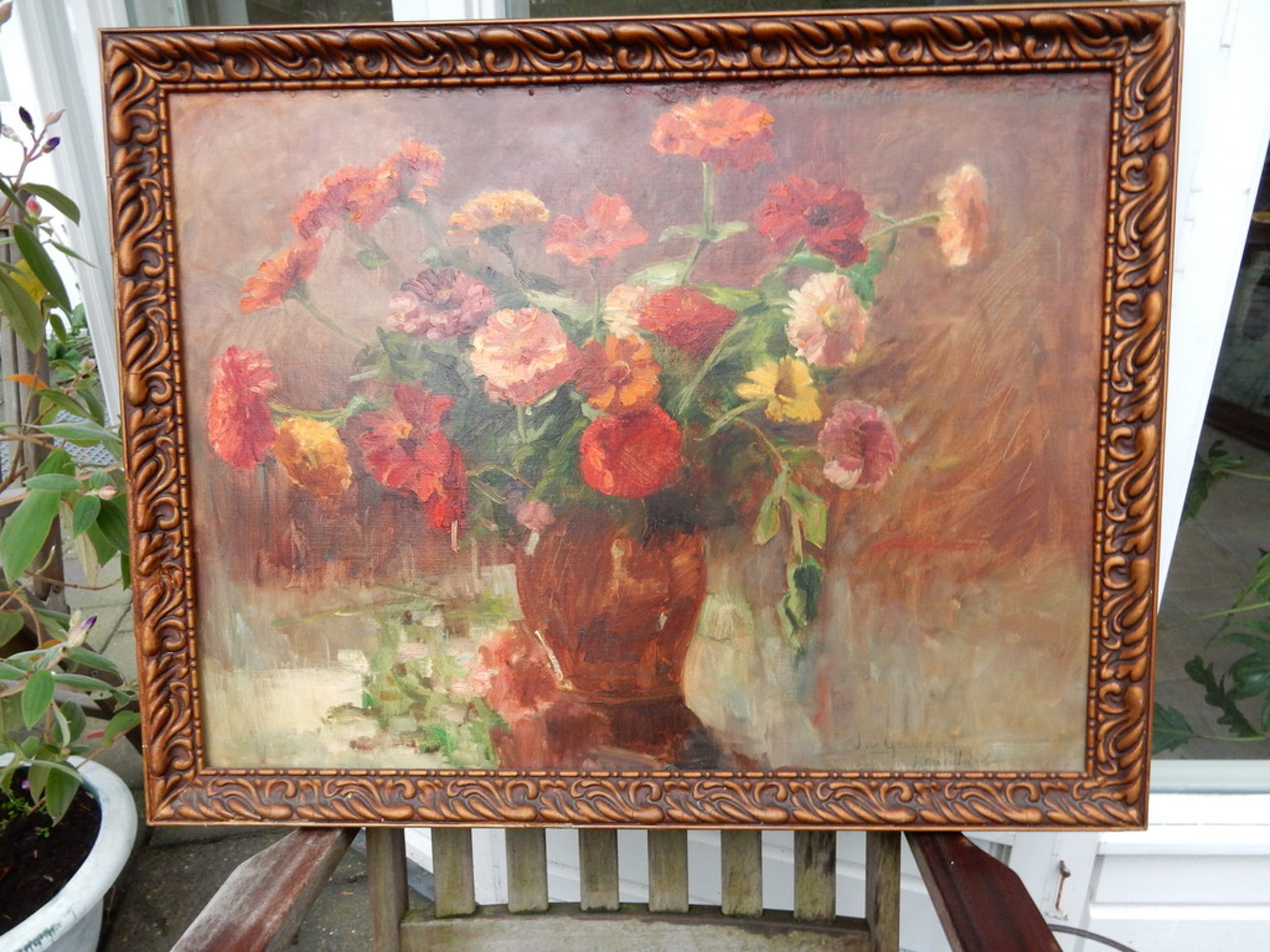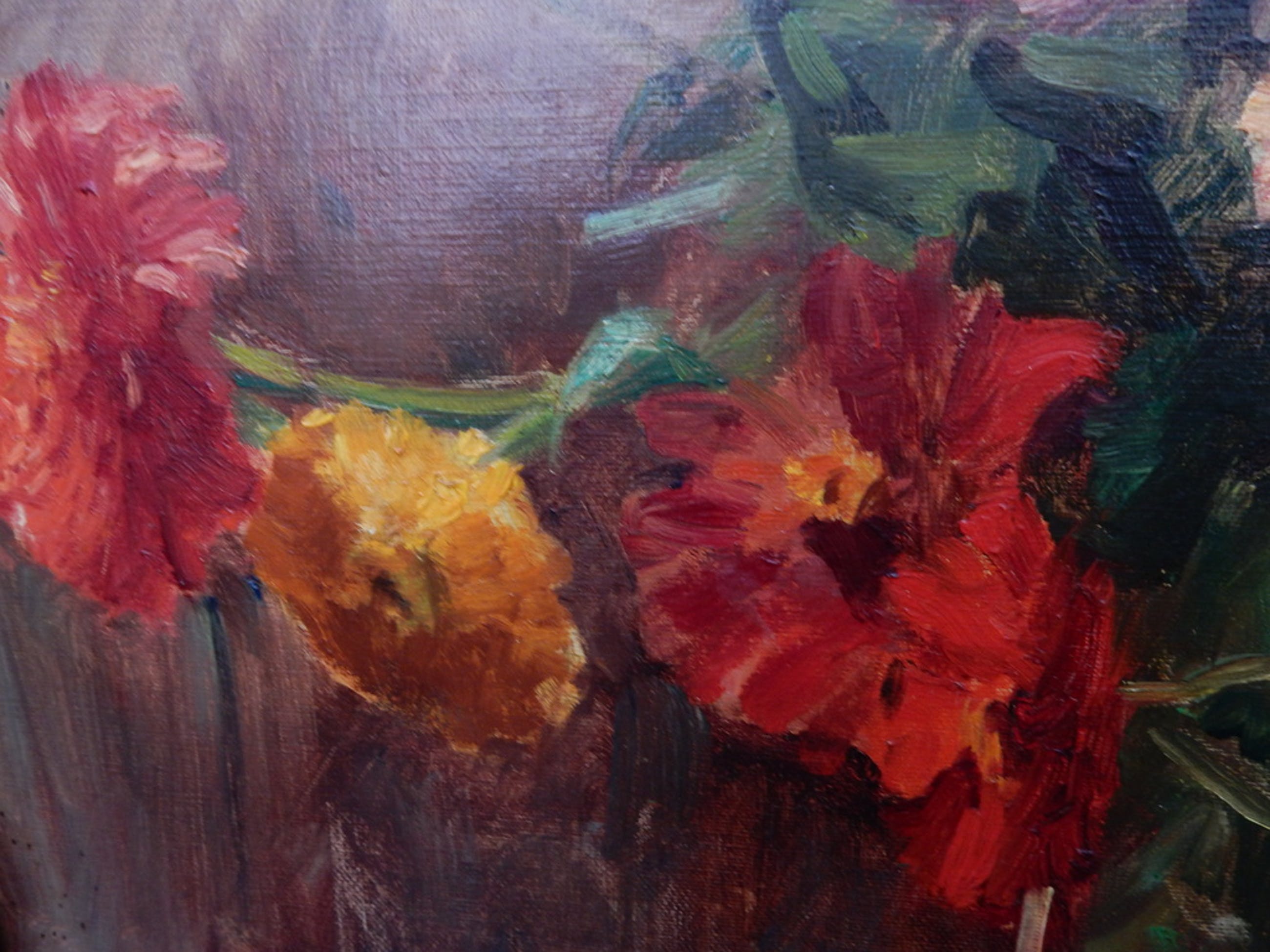 Bloemstilleven, dik olieverf op doek, r.o. gesigneerd, afm. 60x80