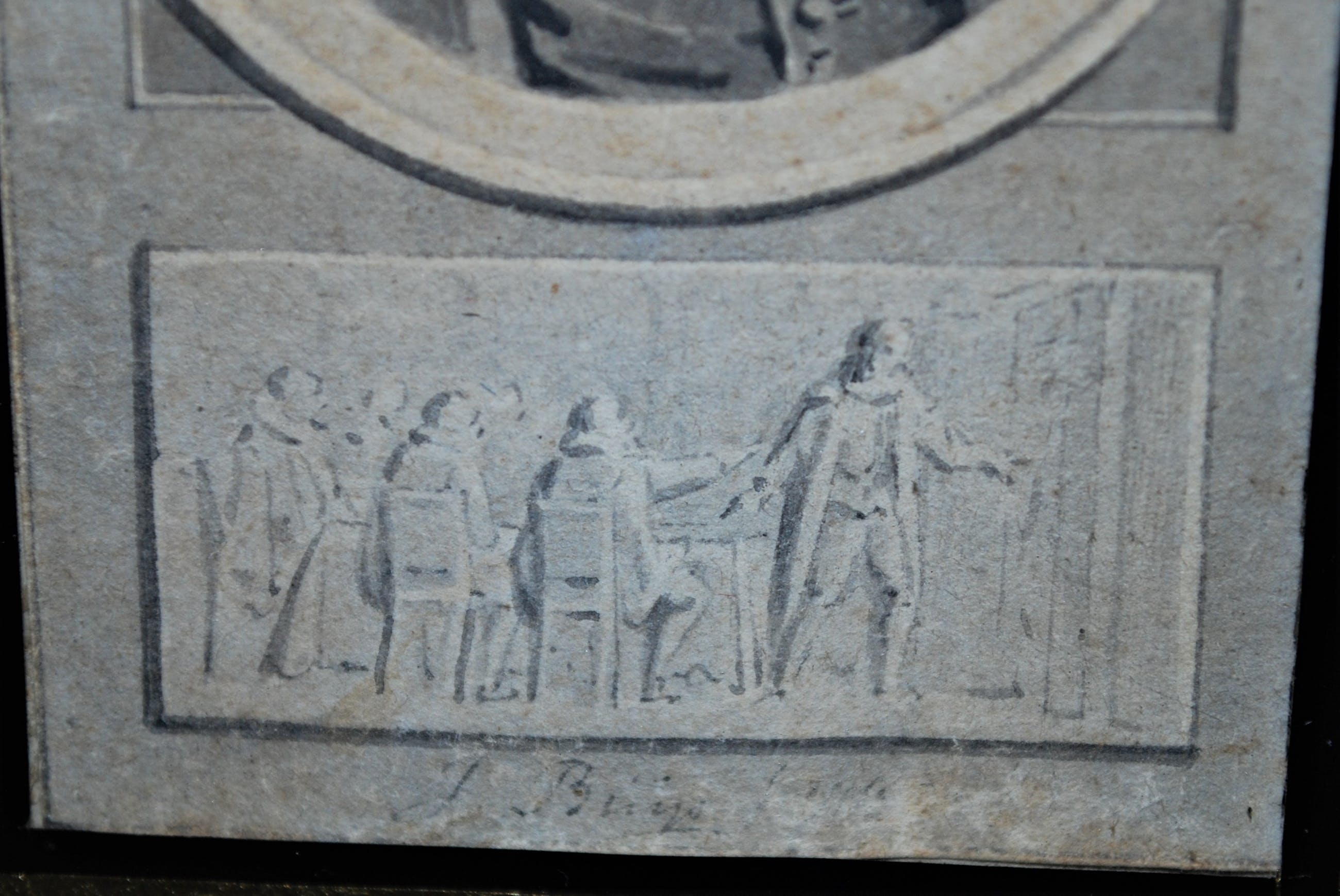Achter glas, in een antieke lijst met enige schade.