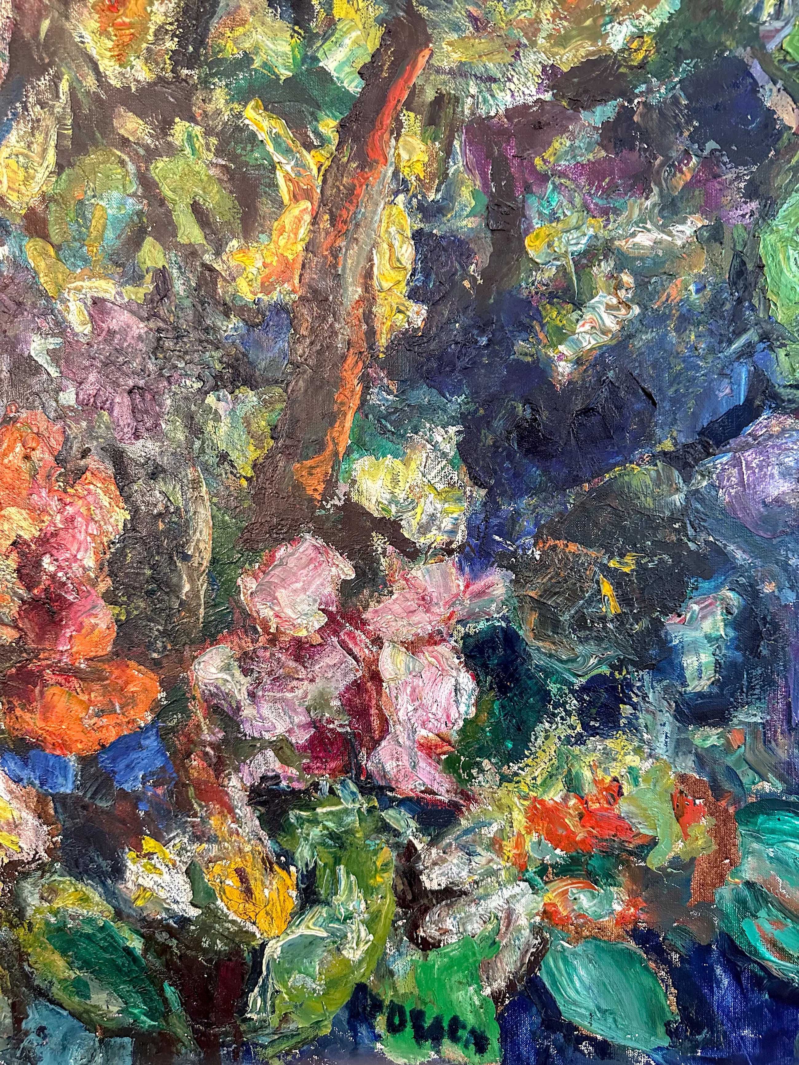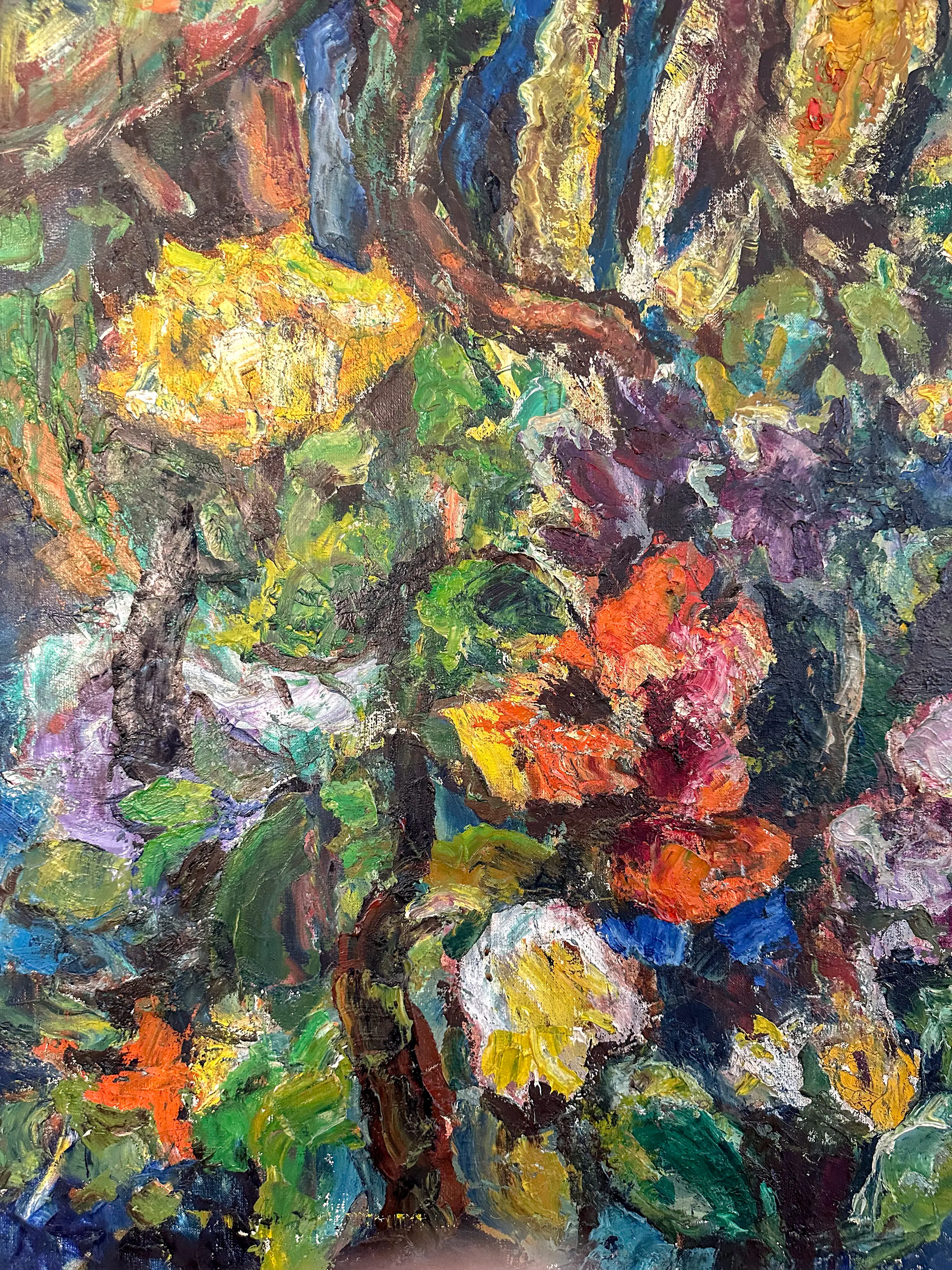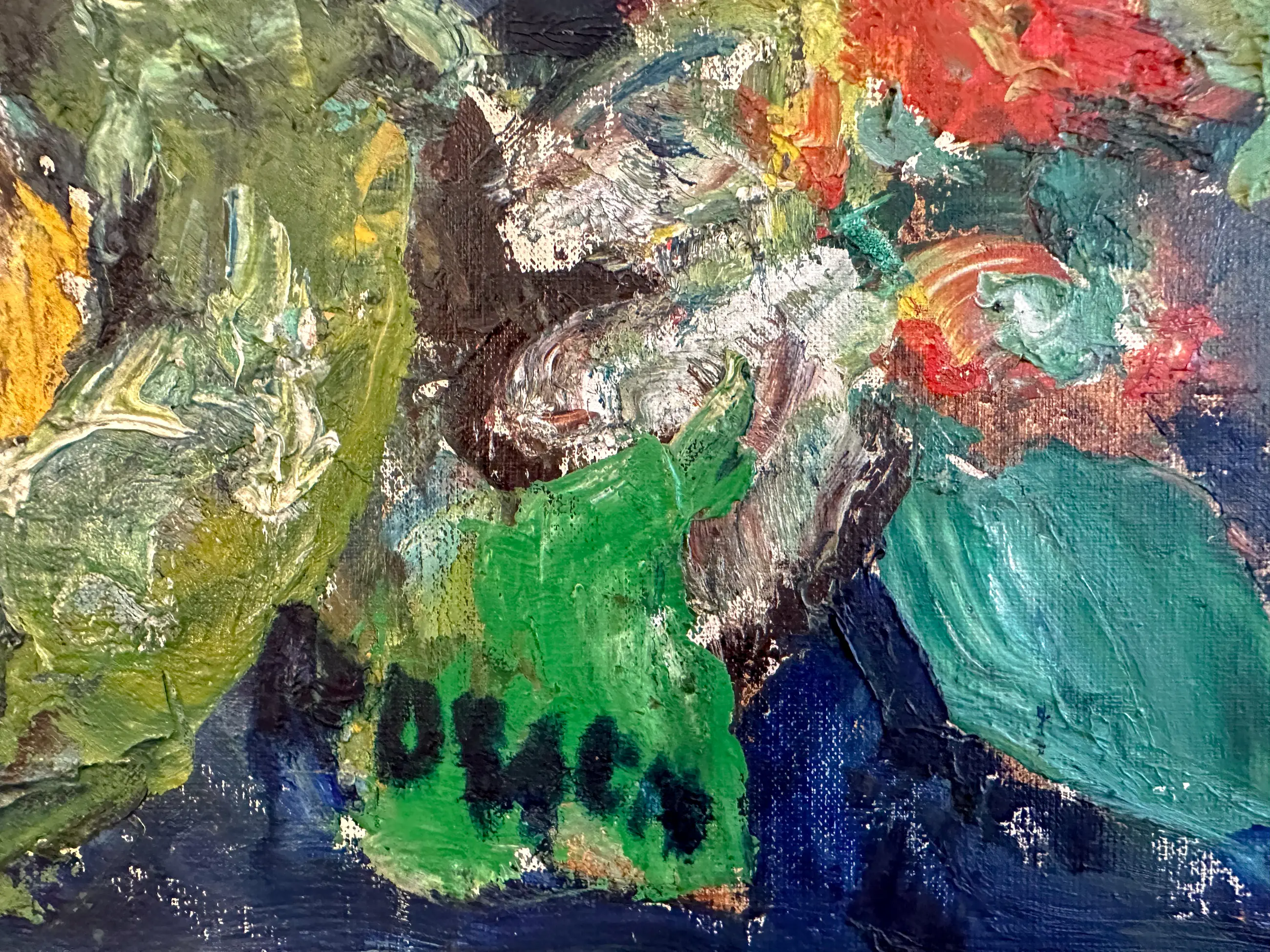Uniek groot expressief bloemstuk. Uitbundige compositie van rode, gele en roze bloemen, afgewisseld met groene bladeren, spat los tegen een donkere blauwgroene achtergrond. Gesigneerd rechtsonder, uit Doesers naoorlogse periode.