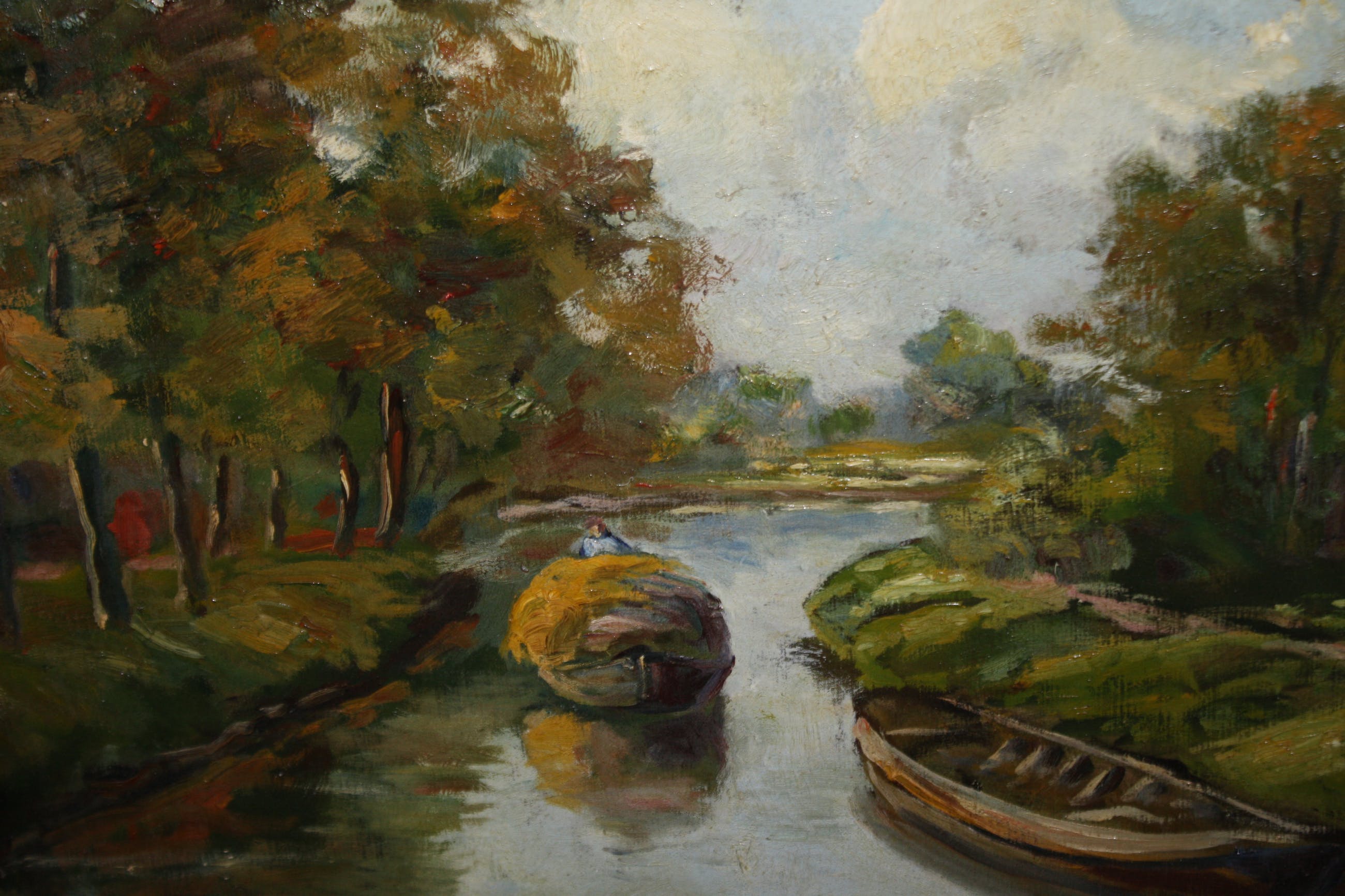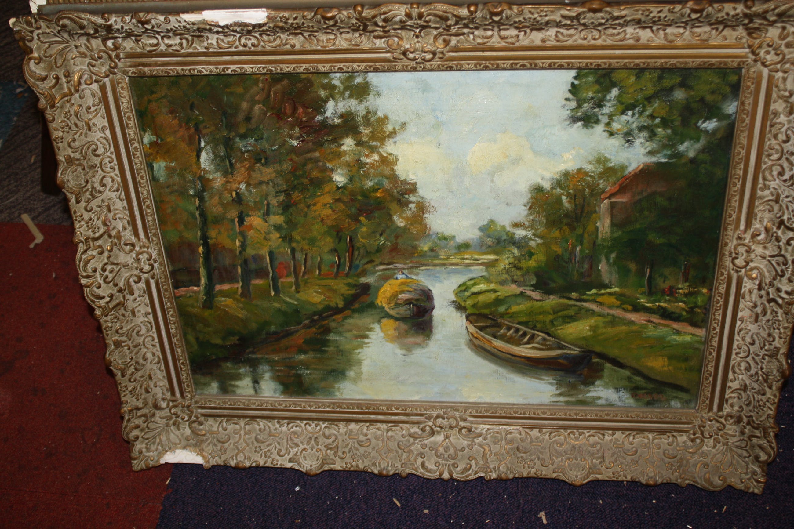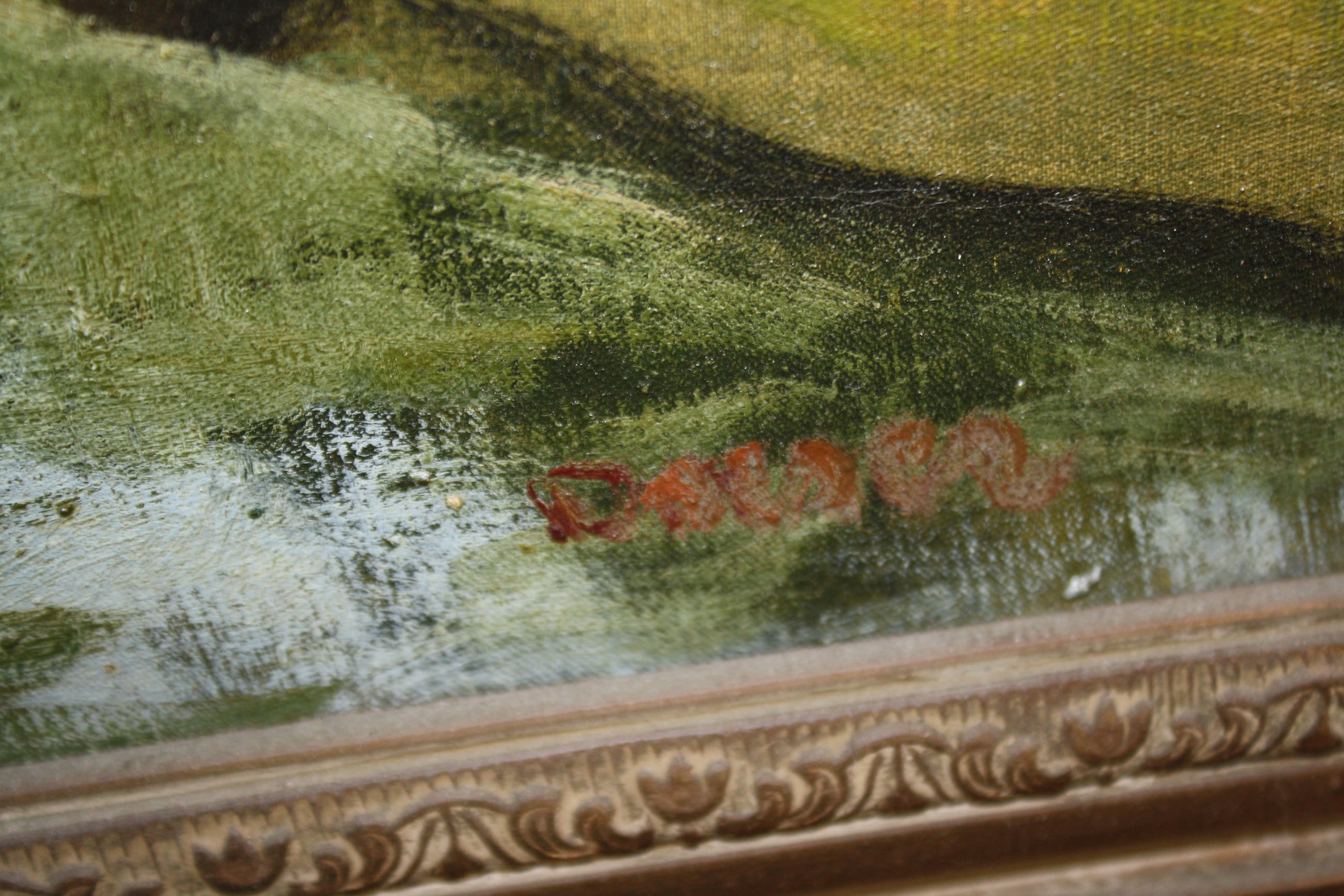 J J Doeserlandschap met hooischuitolieverf op linnen in de maat 50 x 70 cmgesigneerd onder Doesergekaderd in oude lijst met gipsranden in de maat 68 x 86 cmschilderij zonder schadelijst heeft enkele randschade en wordt er gratis bijgeleverdophalen gewenstverzenden aangetekend 15 e
