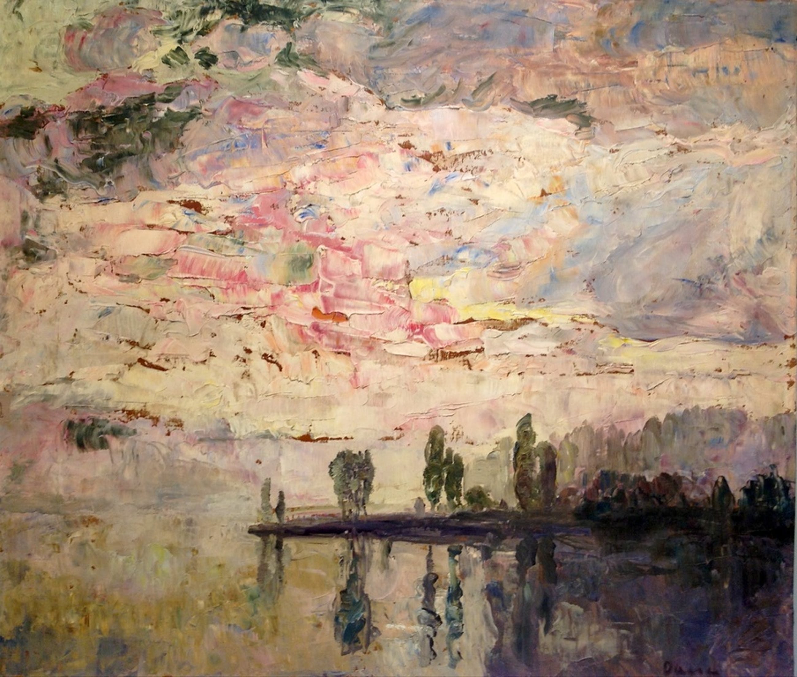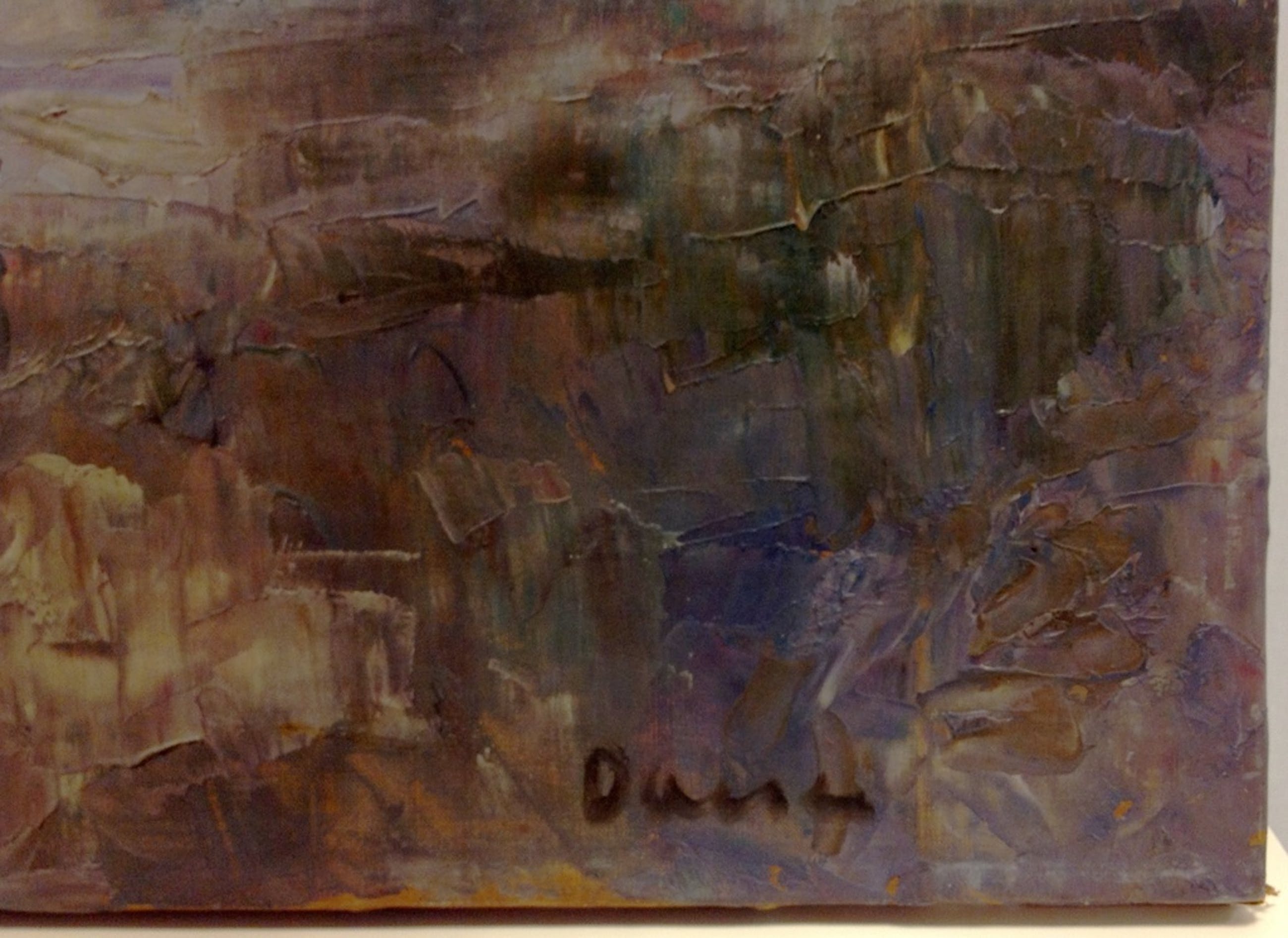 Het werk is niet gelijst, verdient een schoonmaak en dient te worden herspannen. Er is een klein stukje doek los.