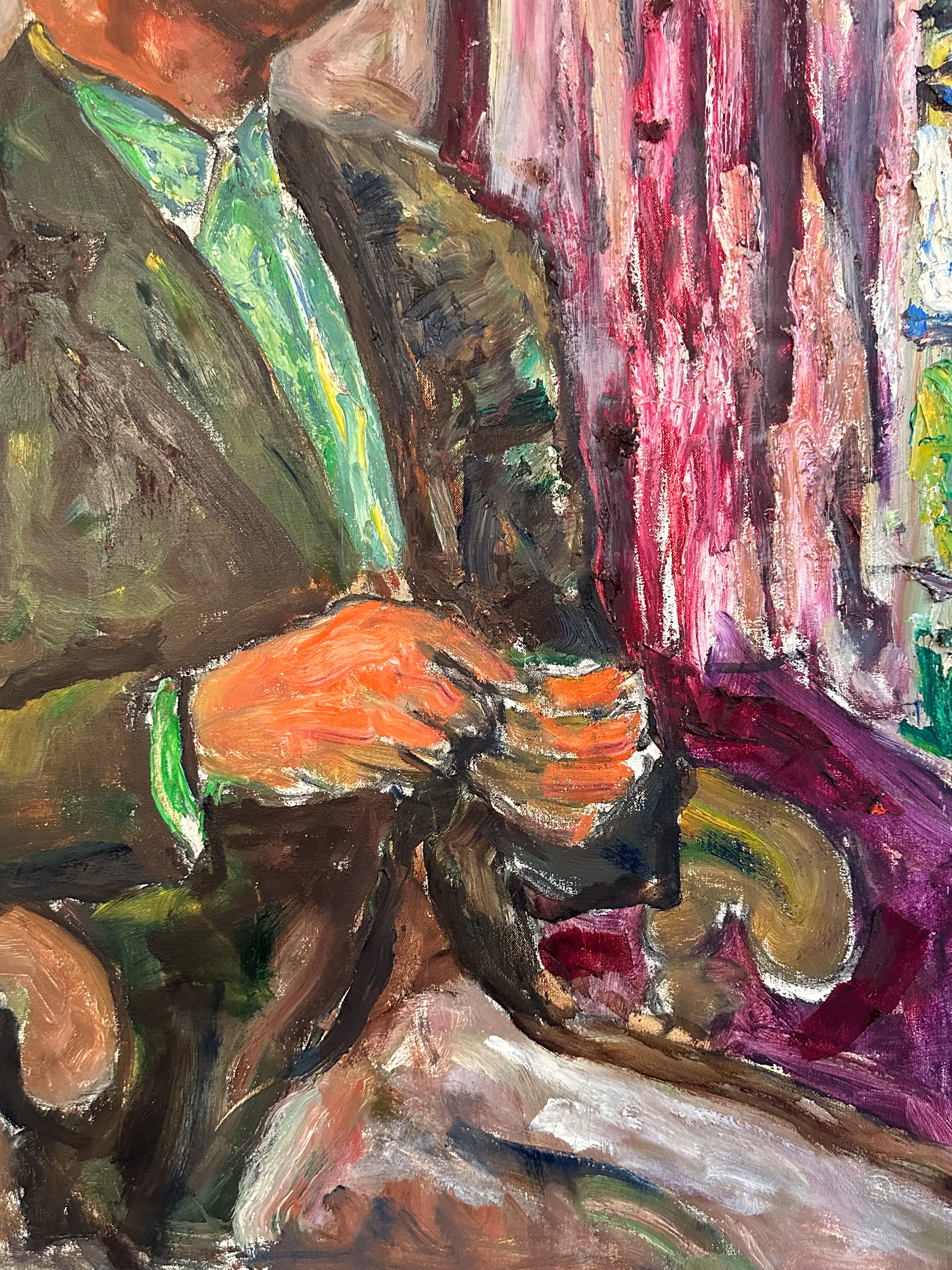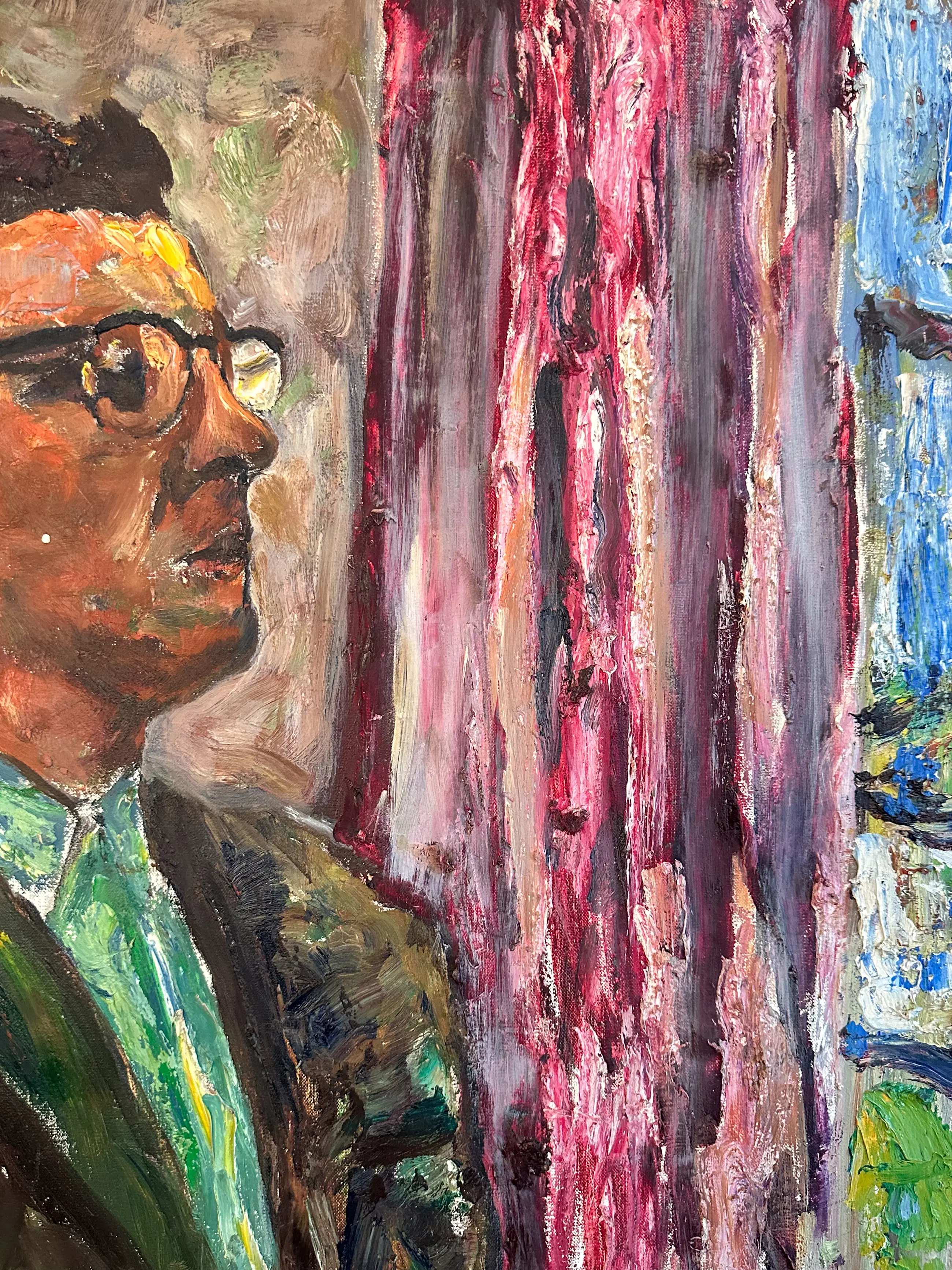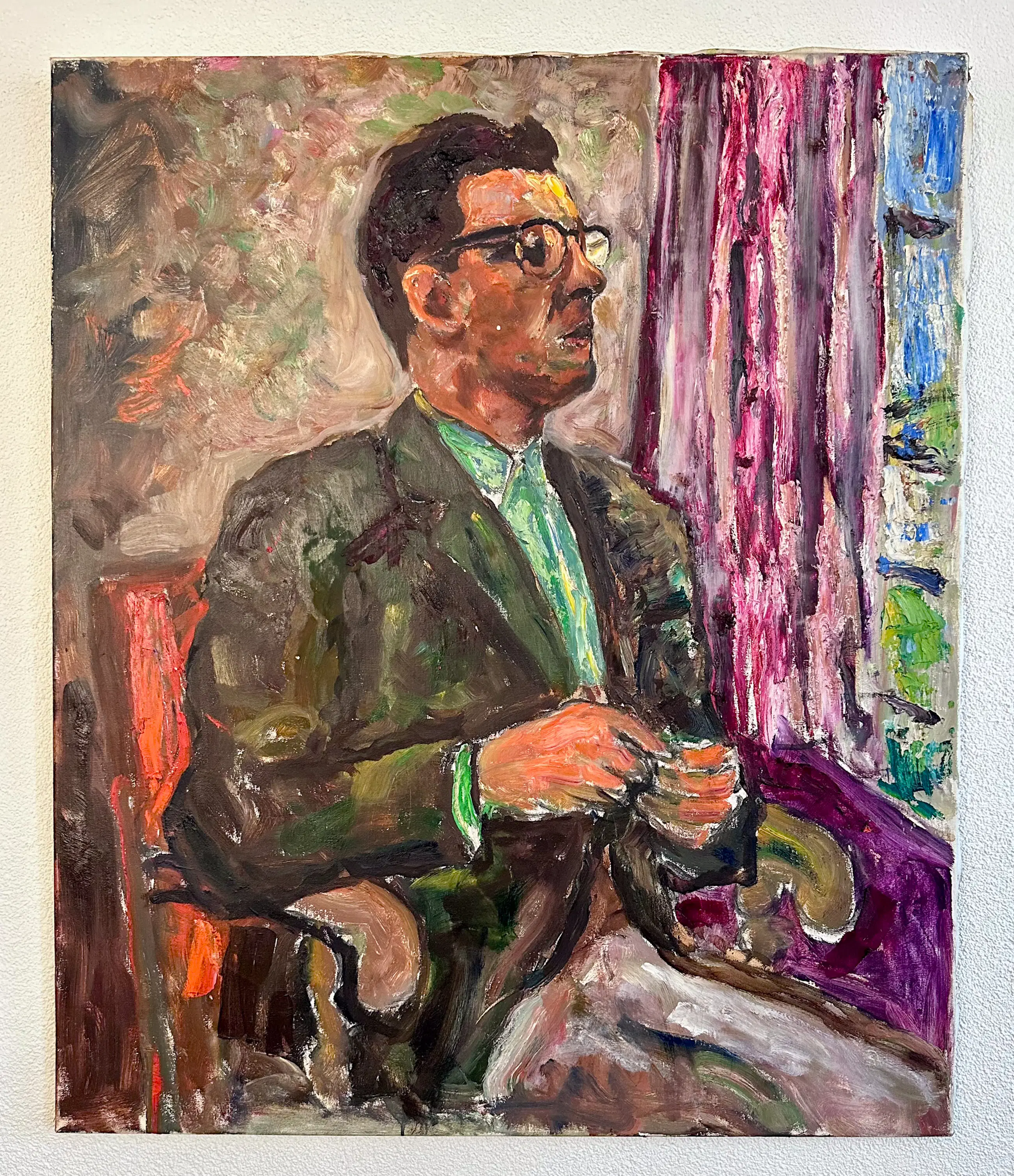 Groot expressief portret van een zittende man bij een raam. Het schilderij heeft een levendige, losse schilderstijl met opvallende kleuren zoals groen, roze en paars. De dikke verfstreken en het rijke kleurgebruik geven het werk een energieke uitstraling.