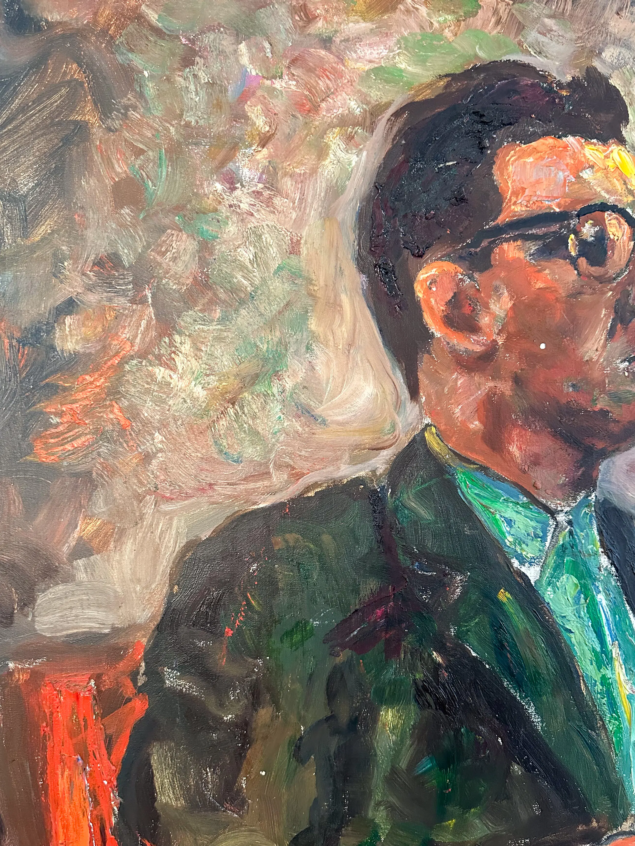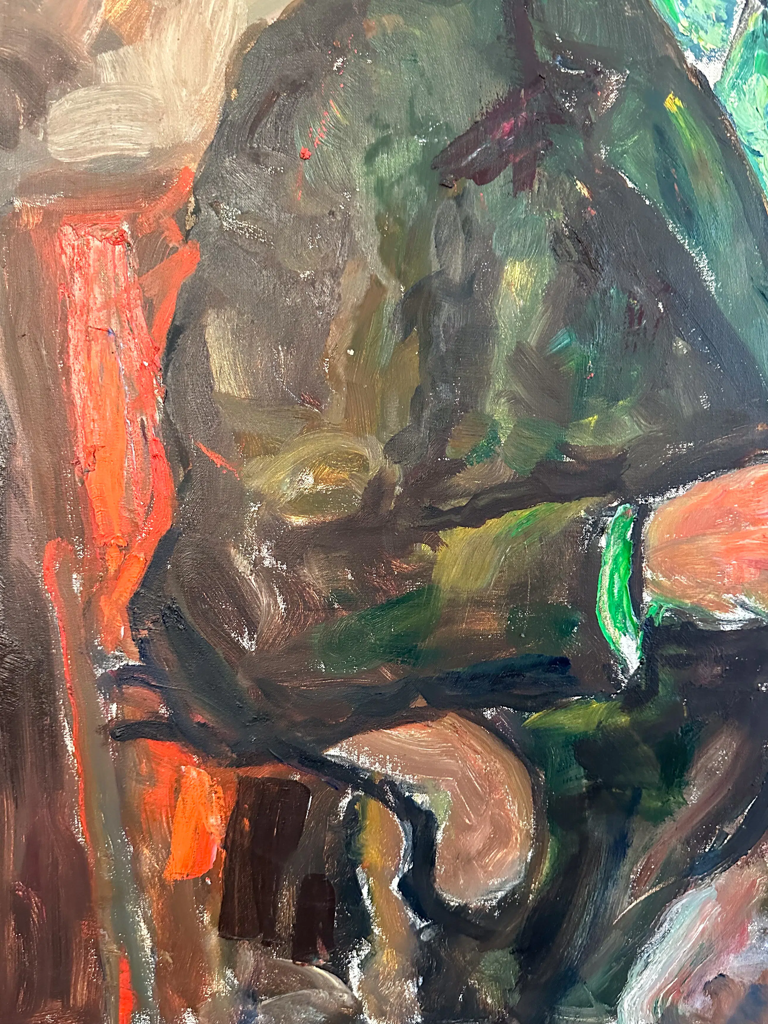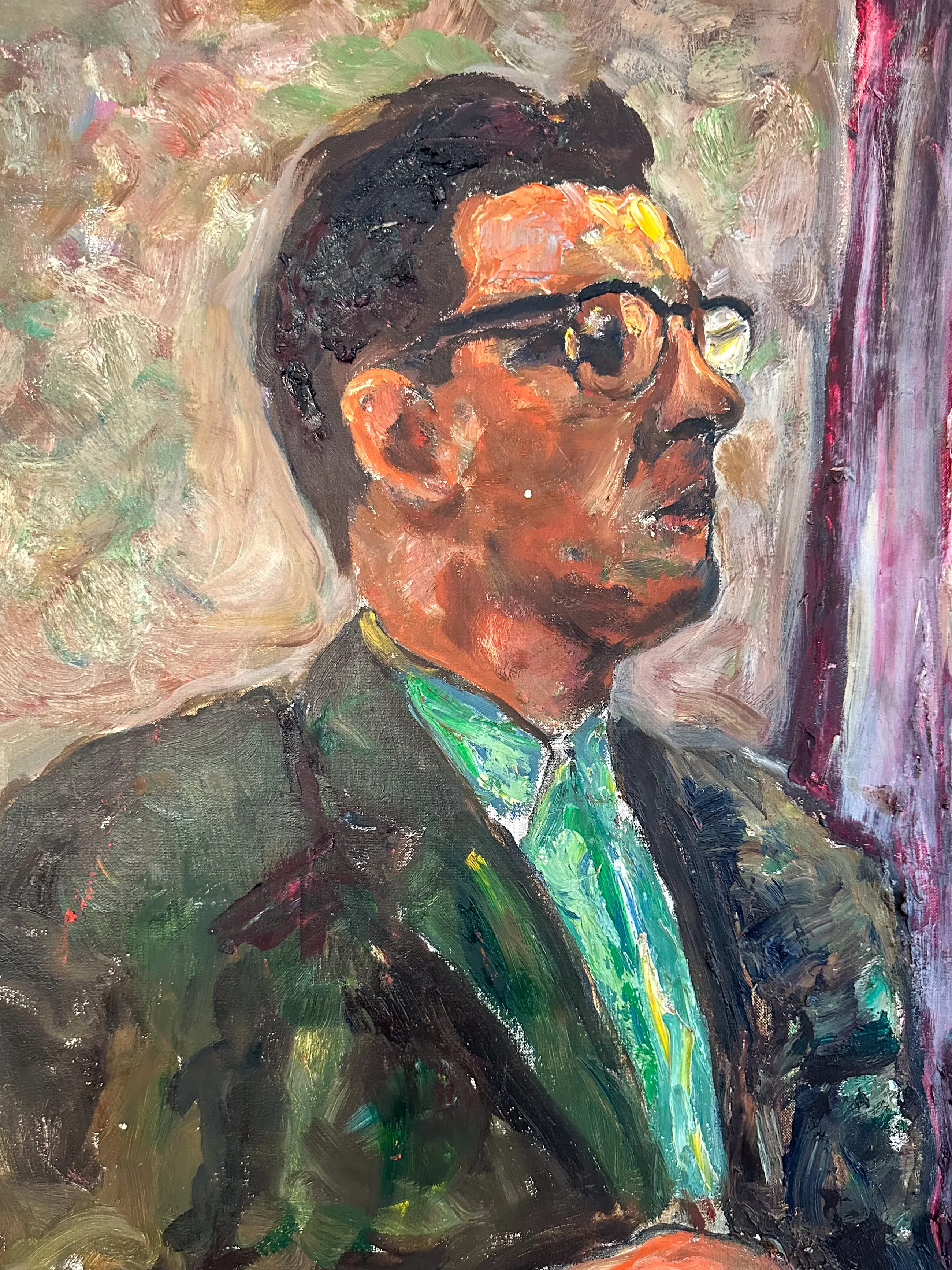 Groot expressief portret van een zittende man bij een raam. Het schilderij heeft een levendige, losse schilderstijl met opvallende kleuren zoals groen, roze en paars. De dikke verfstreken en het rijke kleurgebruik geven het werk een energieke uitstraling.