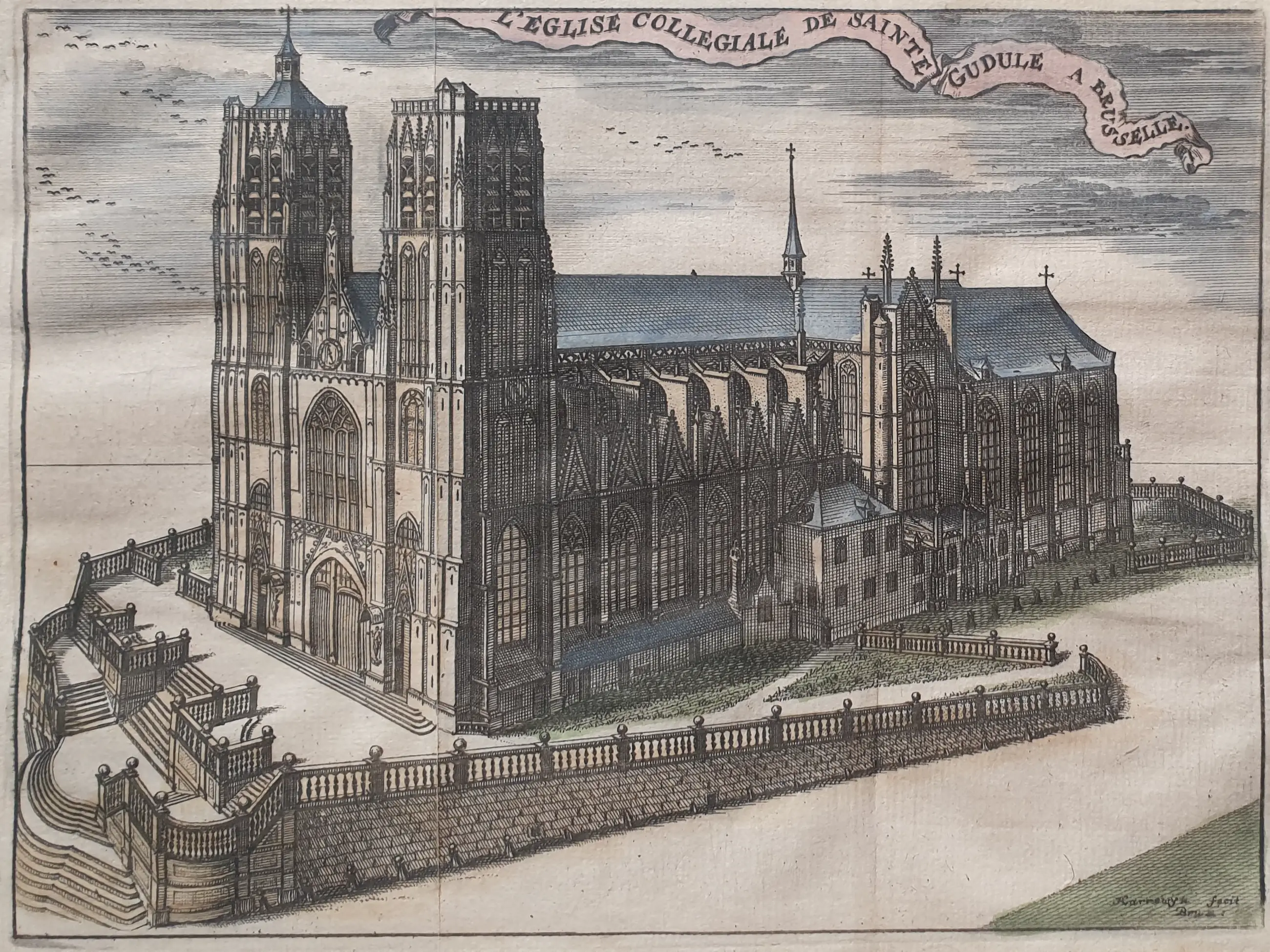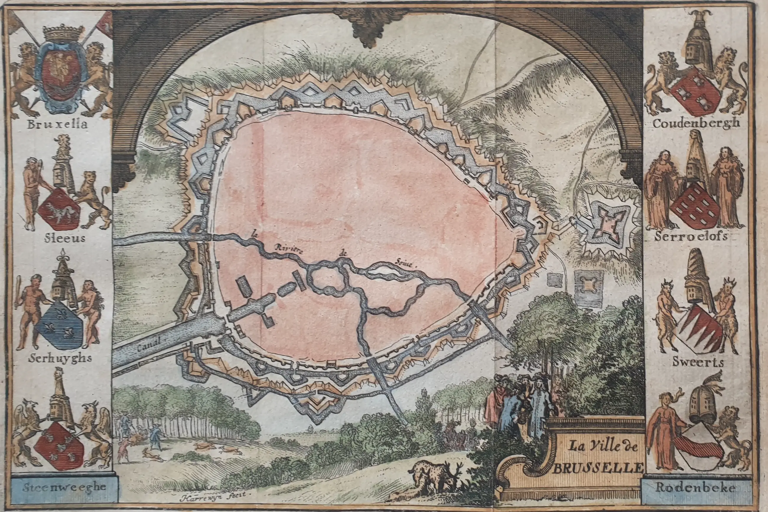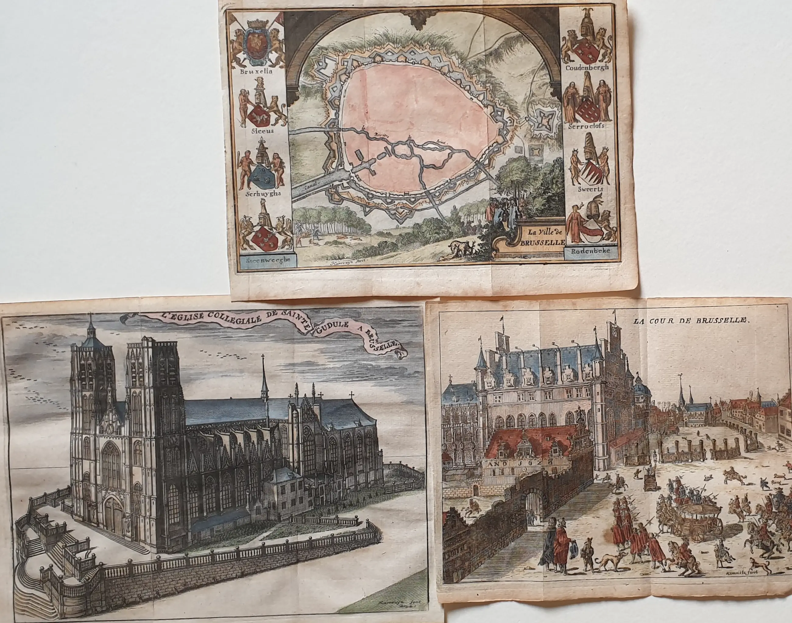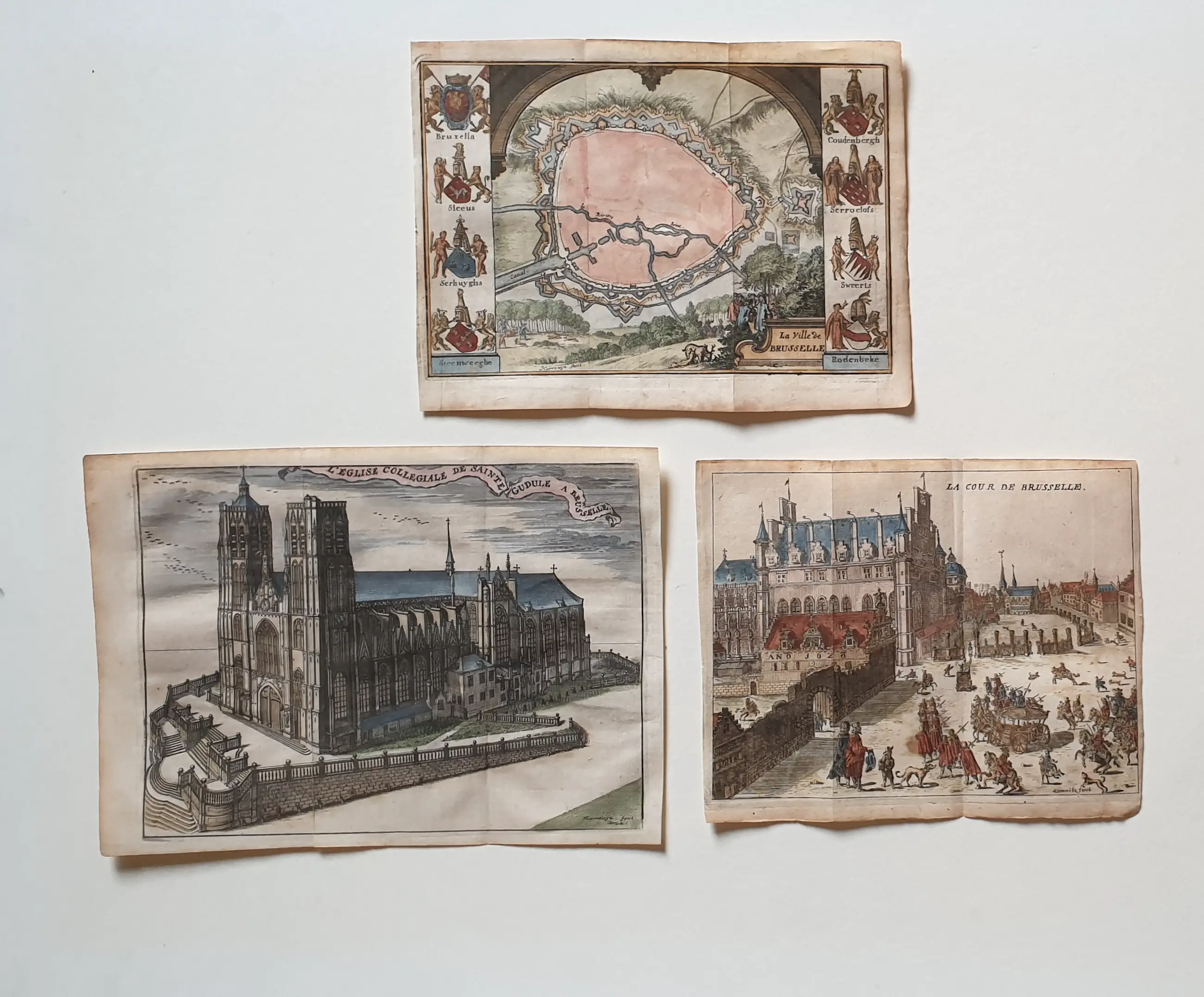 3 prachtige handgekleurde kopergravures. La ville de Brusselle met wapens van de zeven geslachten en Brussel aan de zijkant.
