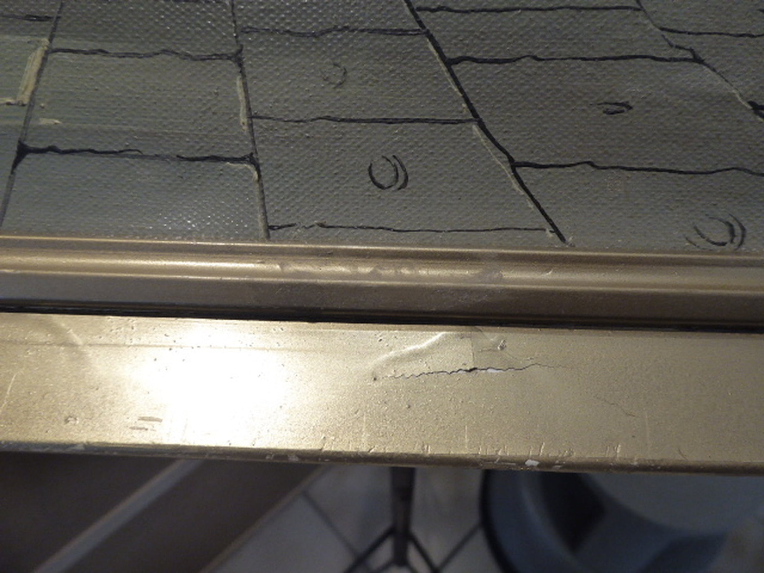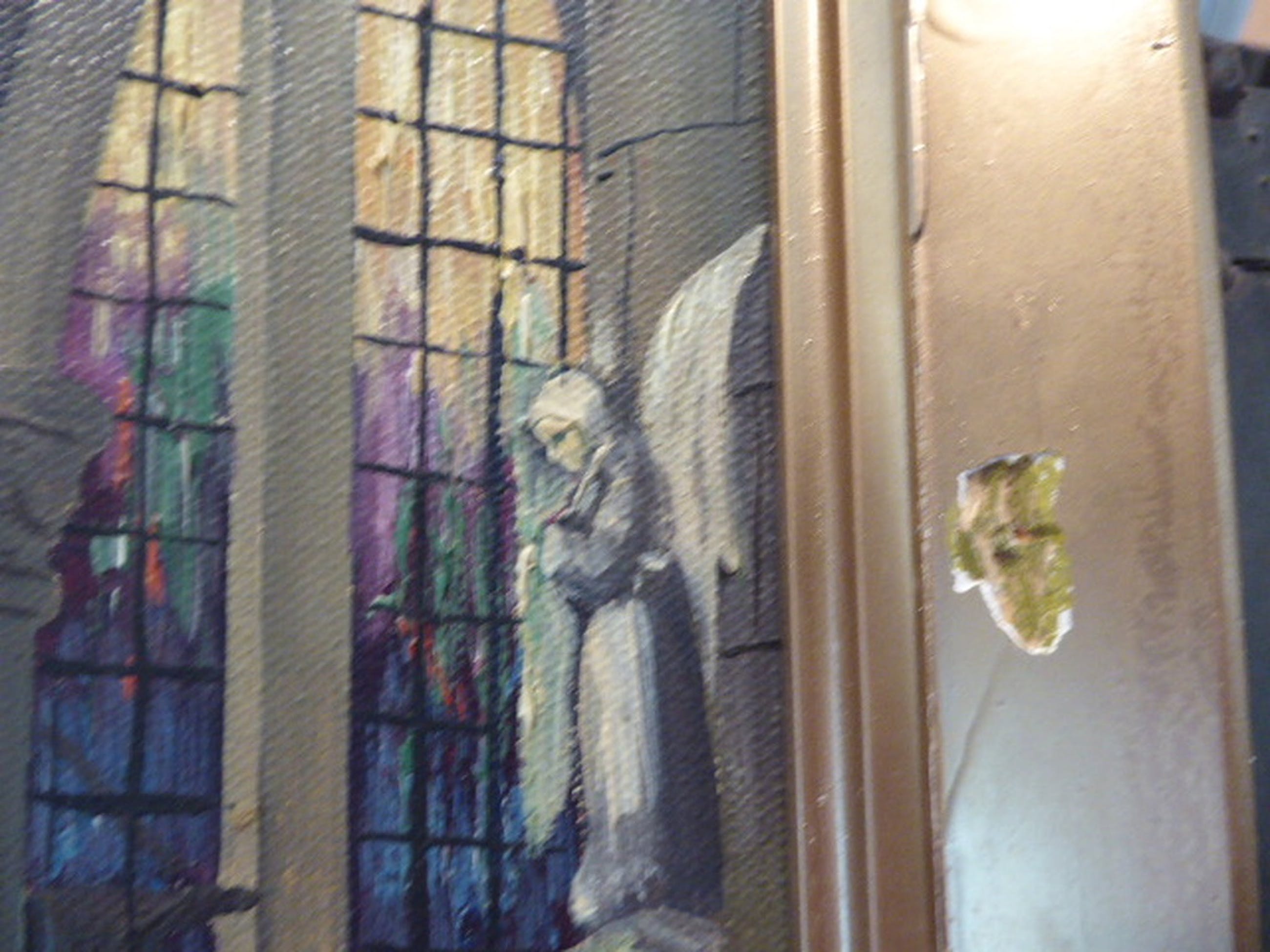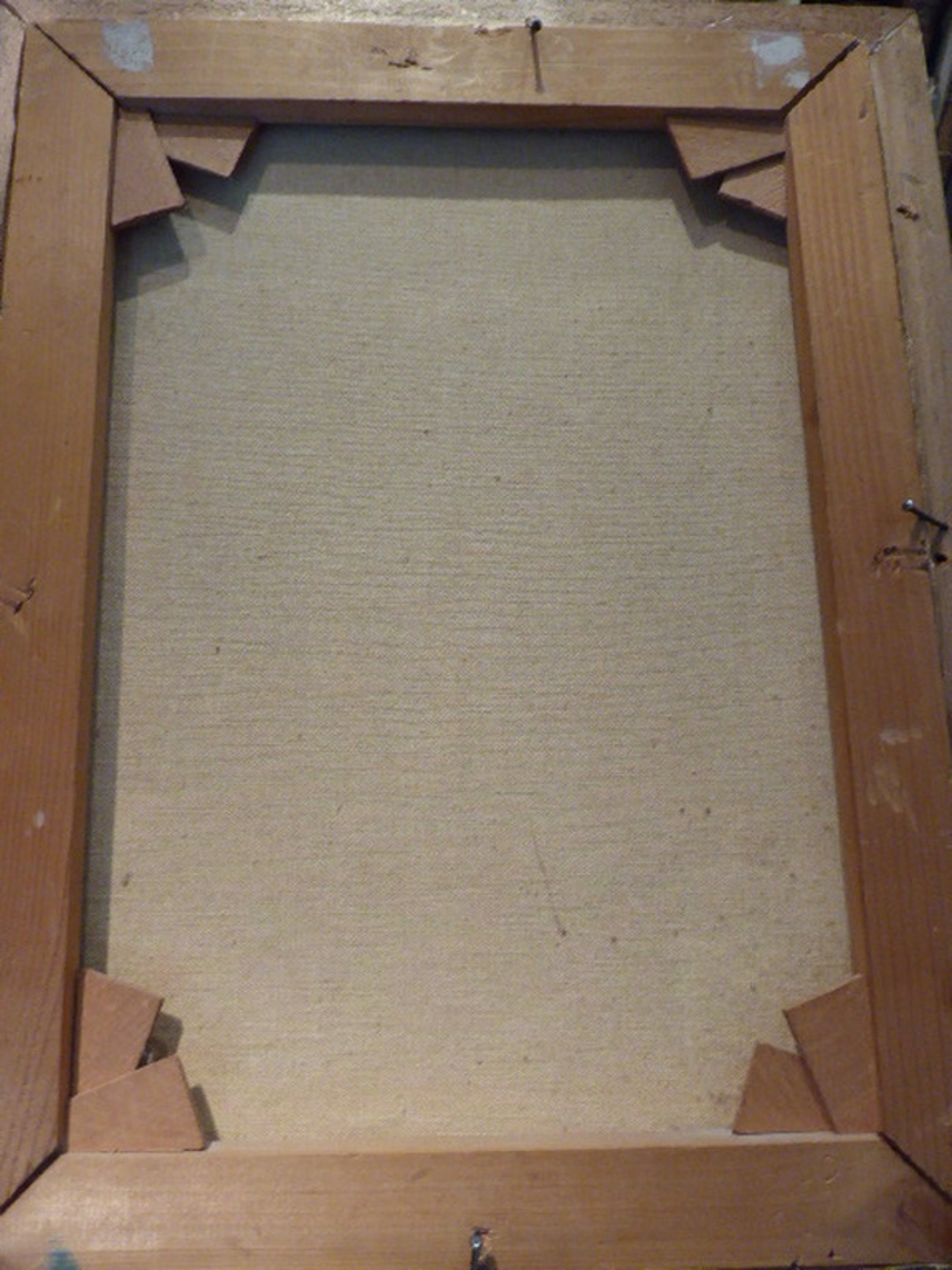 De lijst is in slechte staat (butsen, gaatjes, scheuren etc.) en moet worden vervangen (zie foto's). Het schilderij is losjes ingeklemd met vier spijkers.