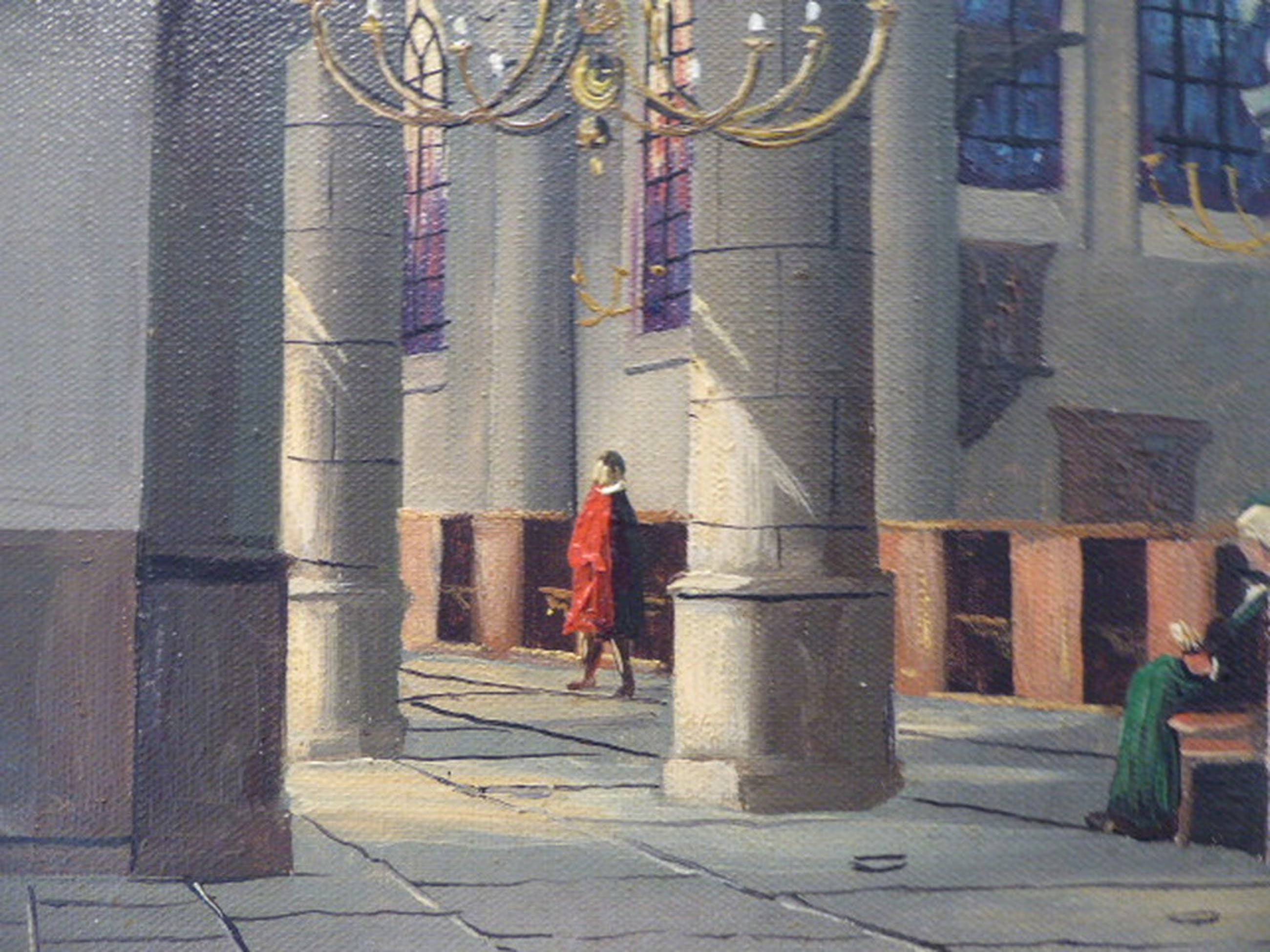Fraai kerinterieur van J.L. Dispo (1890-1964). Olieverf op doek. Jaartal onbekend. Gesigneerd linksonder met 'Dispo'.. Afm. 29x39 cm.van schilderij zonder lijst.