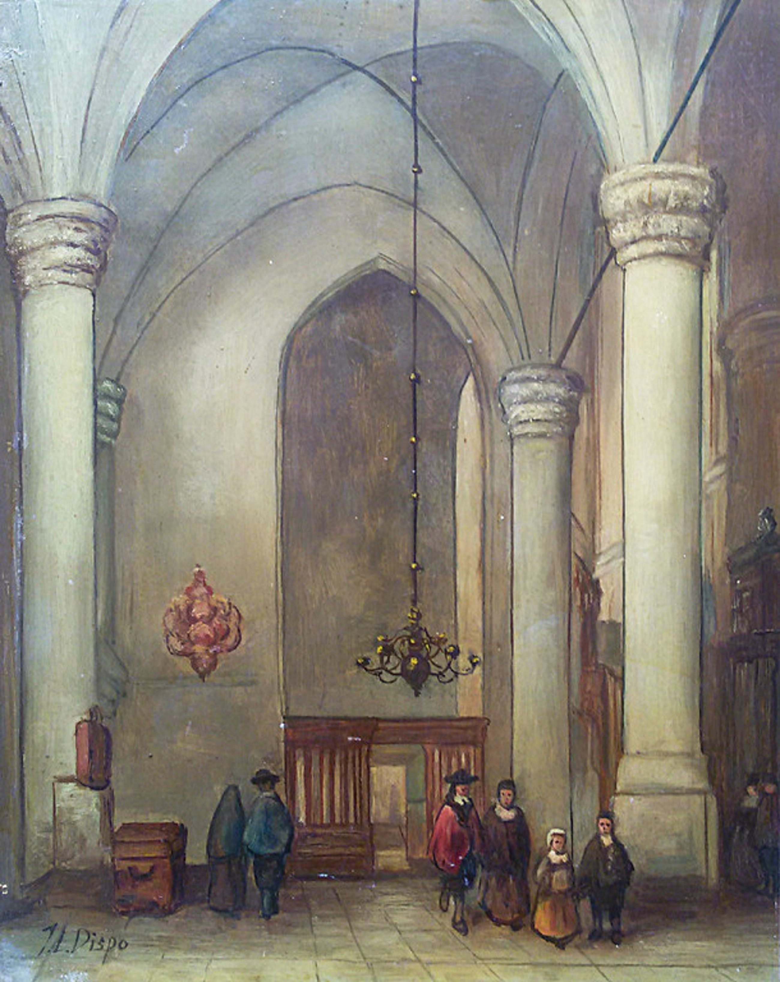 Karakteristiek kerkinterieur van J.L. Dispo. Gesigneerd linksonder. In redelijk goede staat; aan de randen te zien heeft het werk ingelijst gezeten. Weer ingelijst een prima werkje met de specialiteit van Dispo Sr.