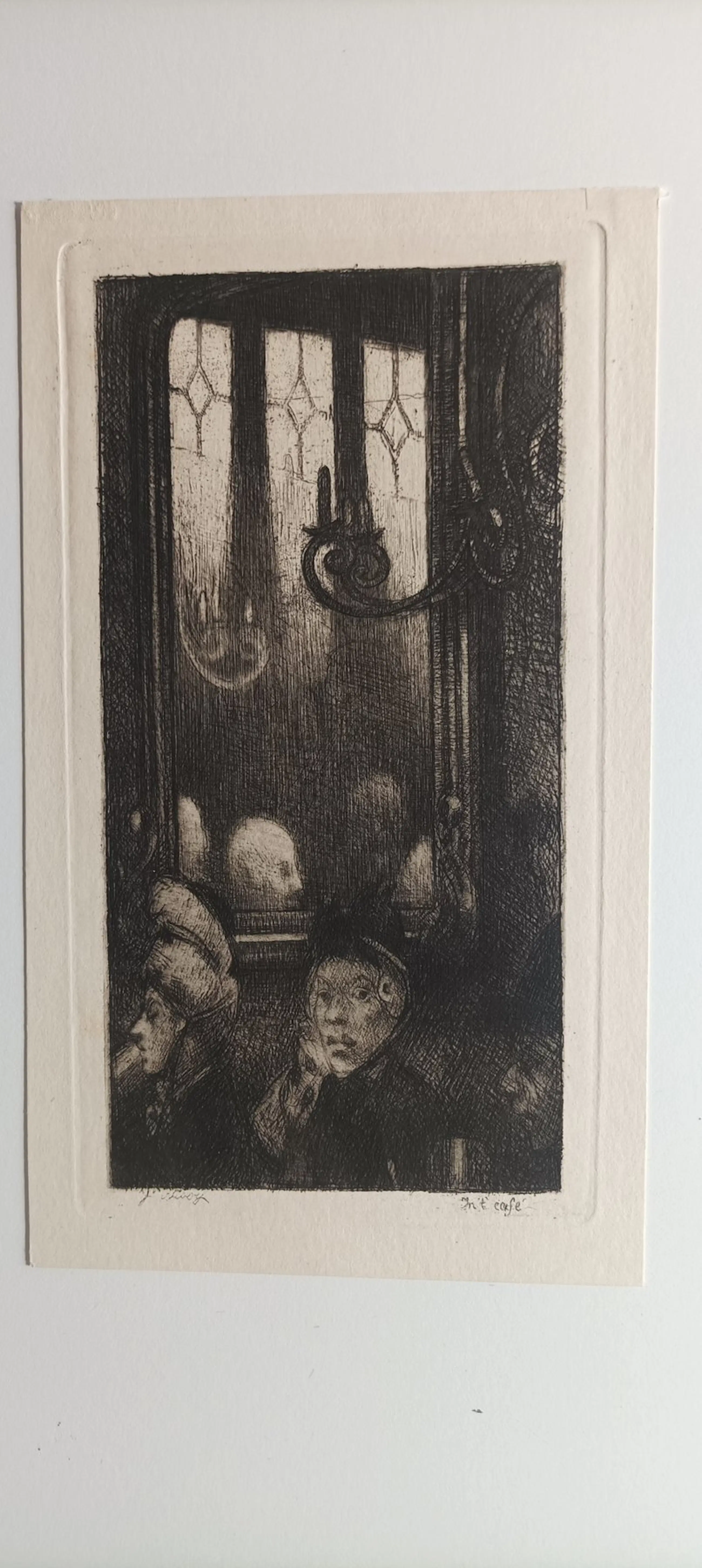 Jac. van Looy - In 't cafe - Ets, 1888. Gesigneerd en getiteld in de plaat in onderste marge. Onduidelijk signatuur/monogram verso rechtsonder in pen (Van Looy?) - 17 x 9 cm.
