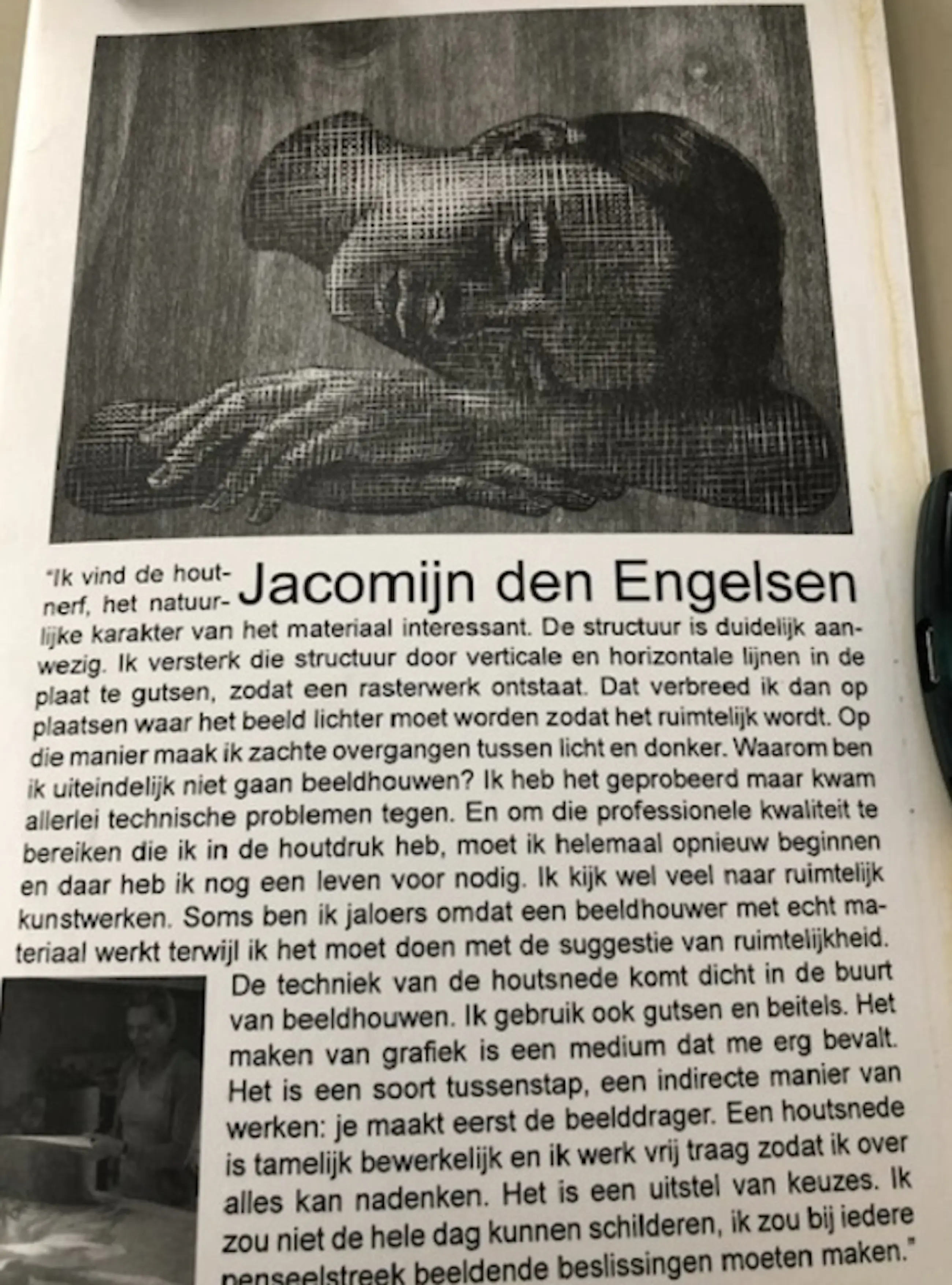 Prachtig ingelijst werk van Jacomijn den Engelsen in blankhouten lijst. Nieuwstraat.