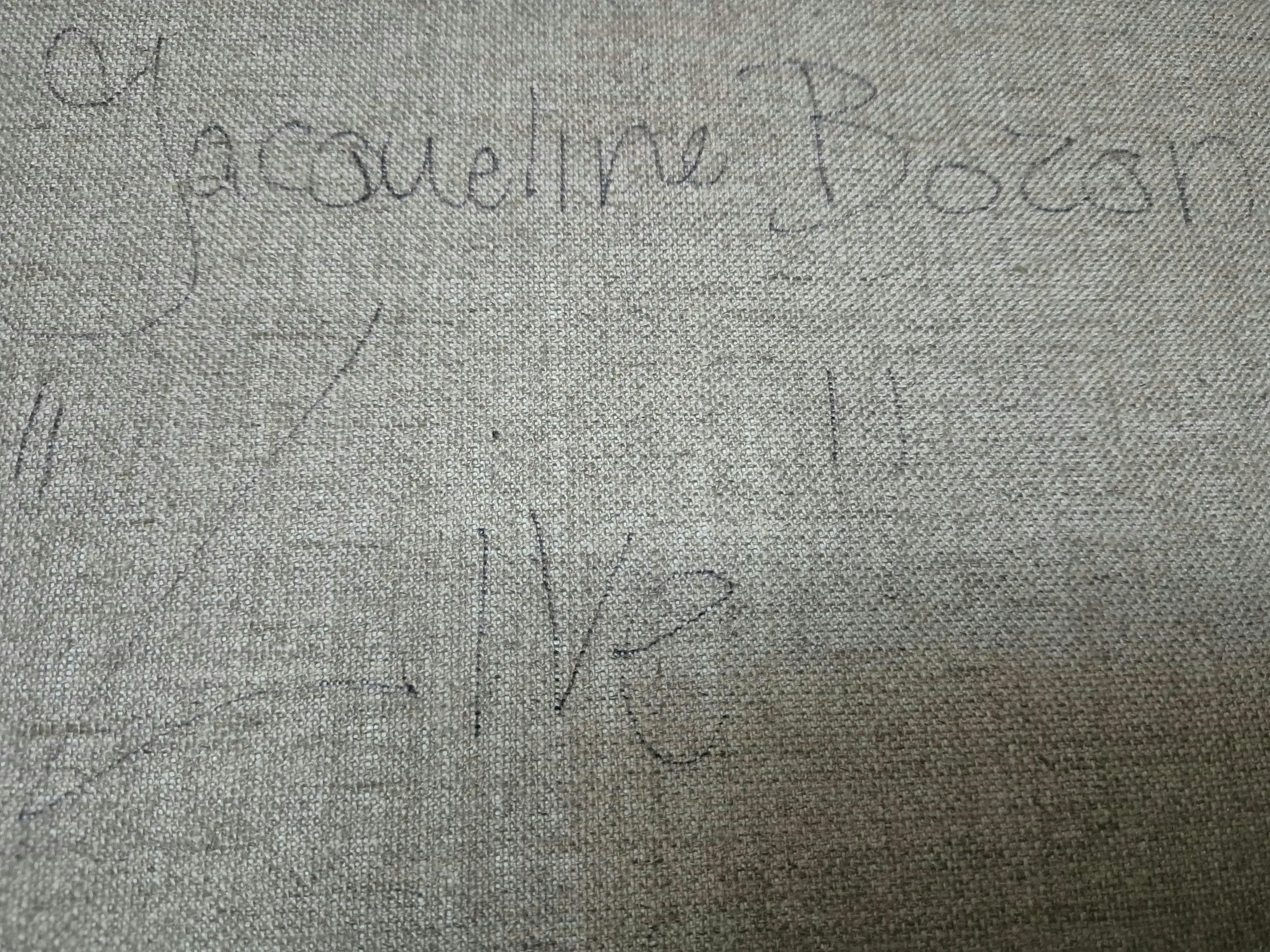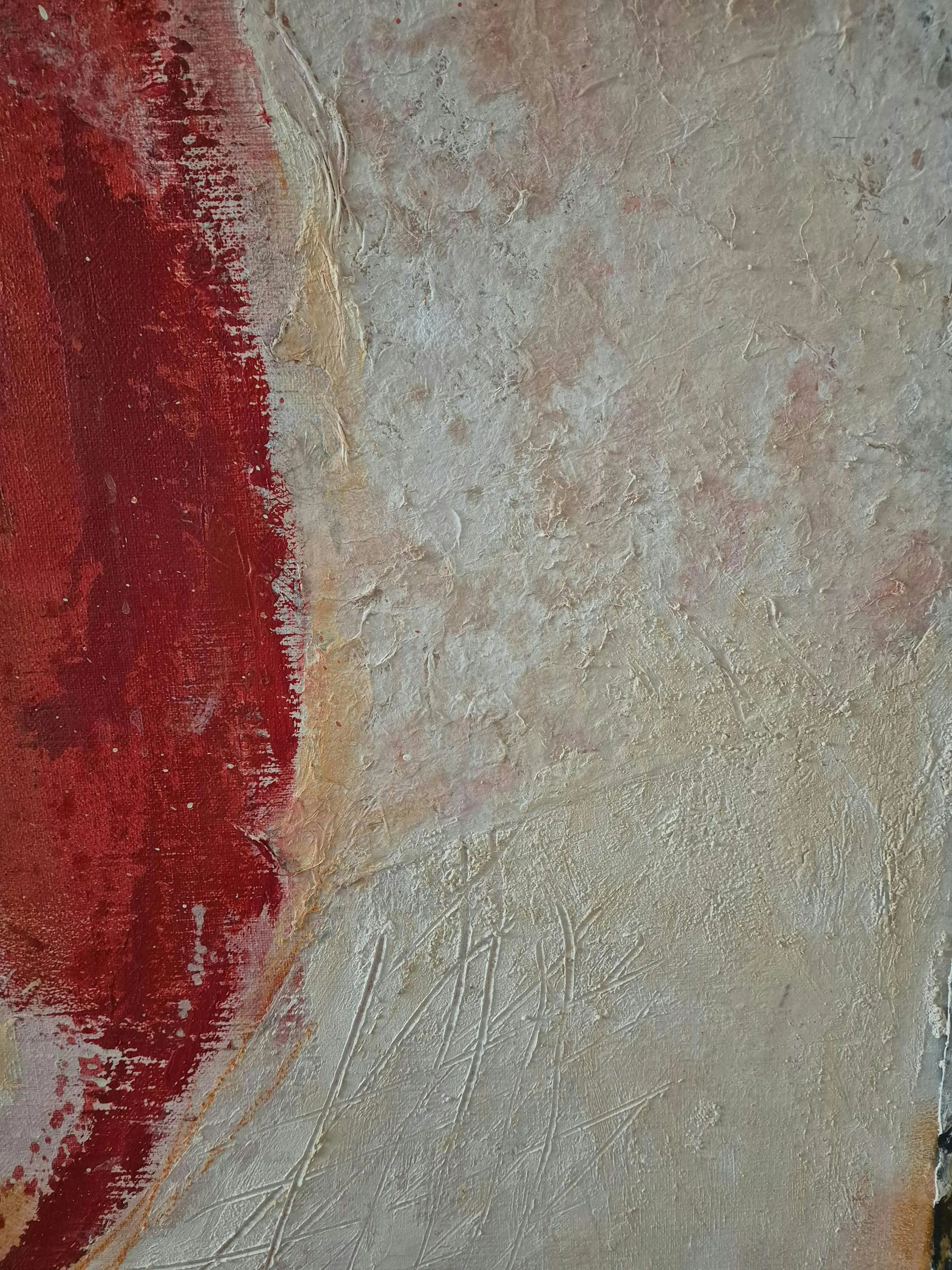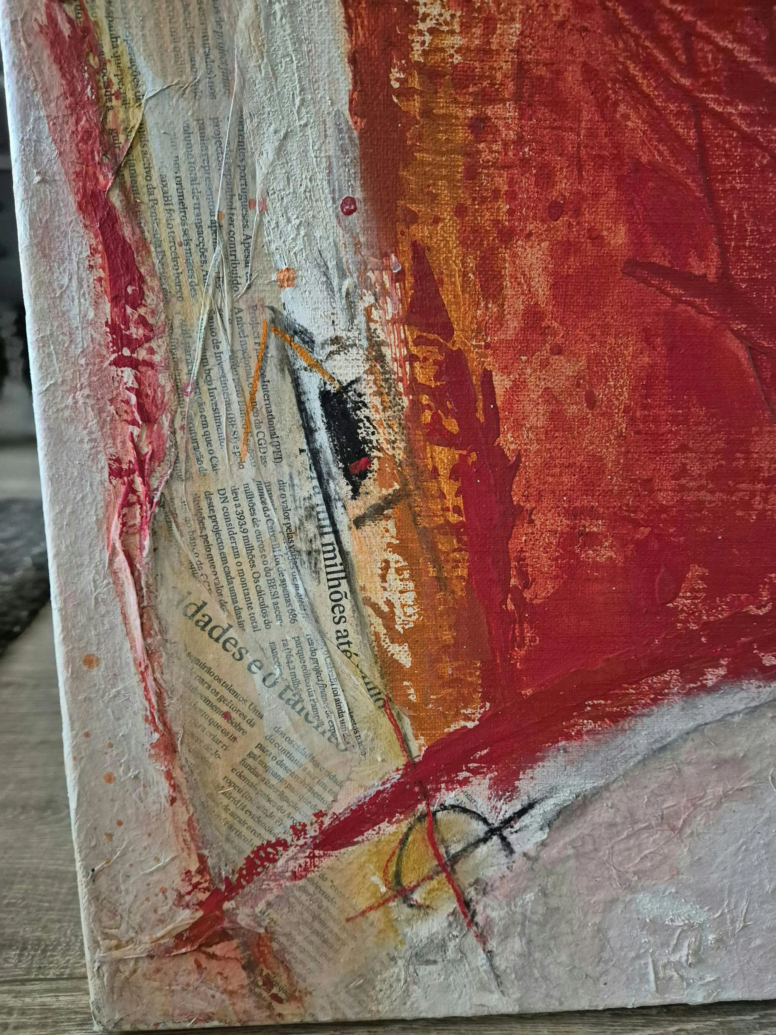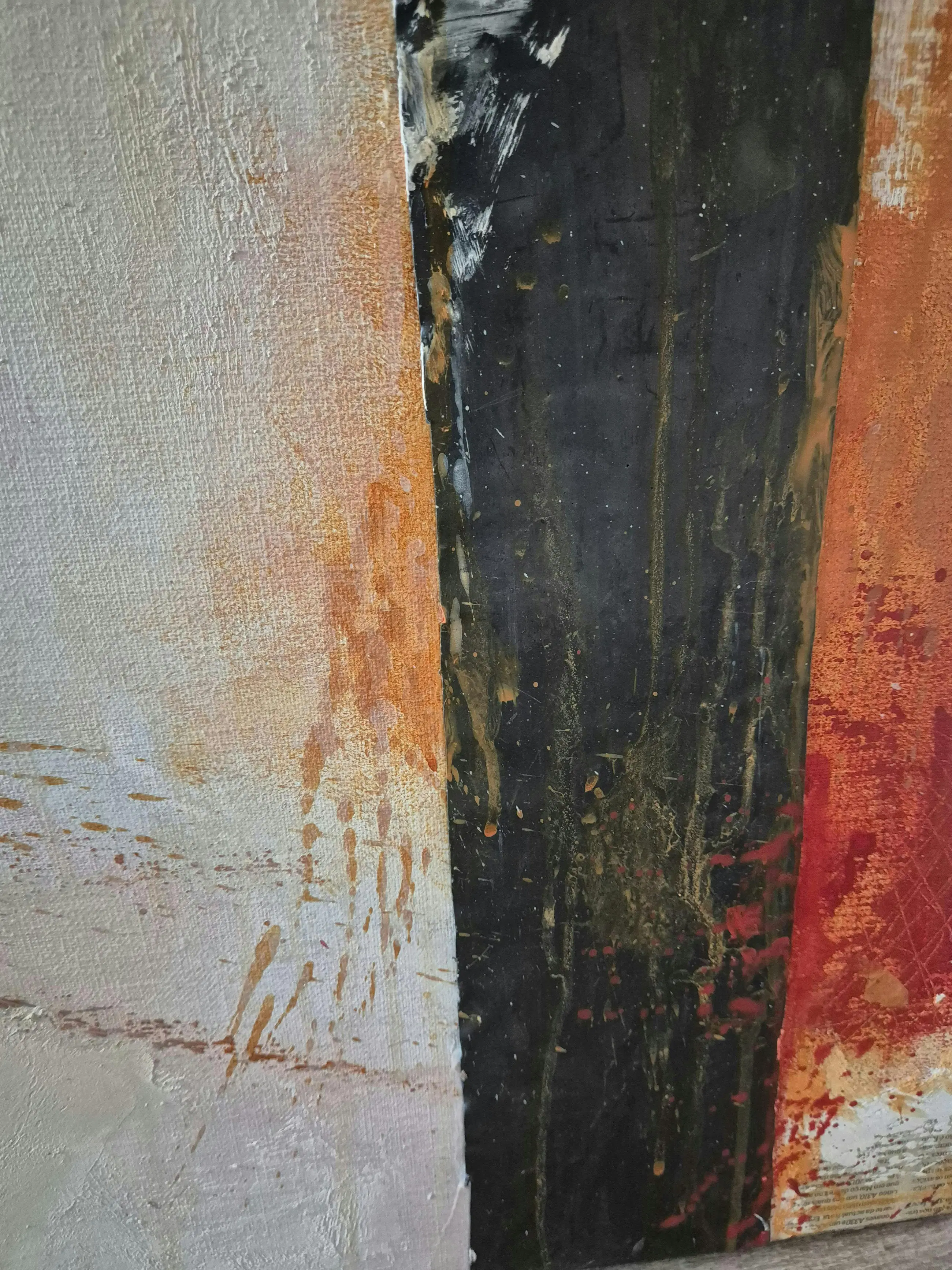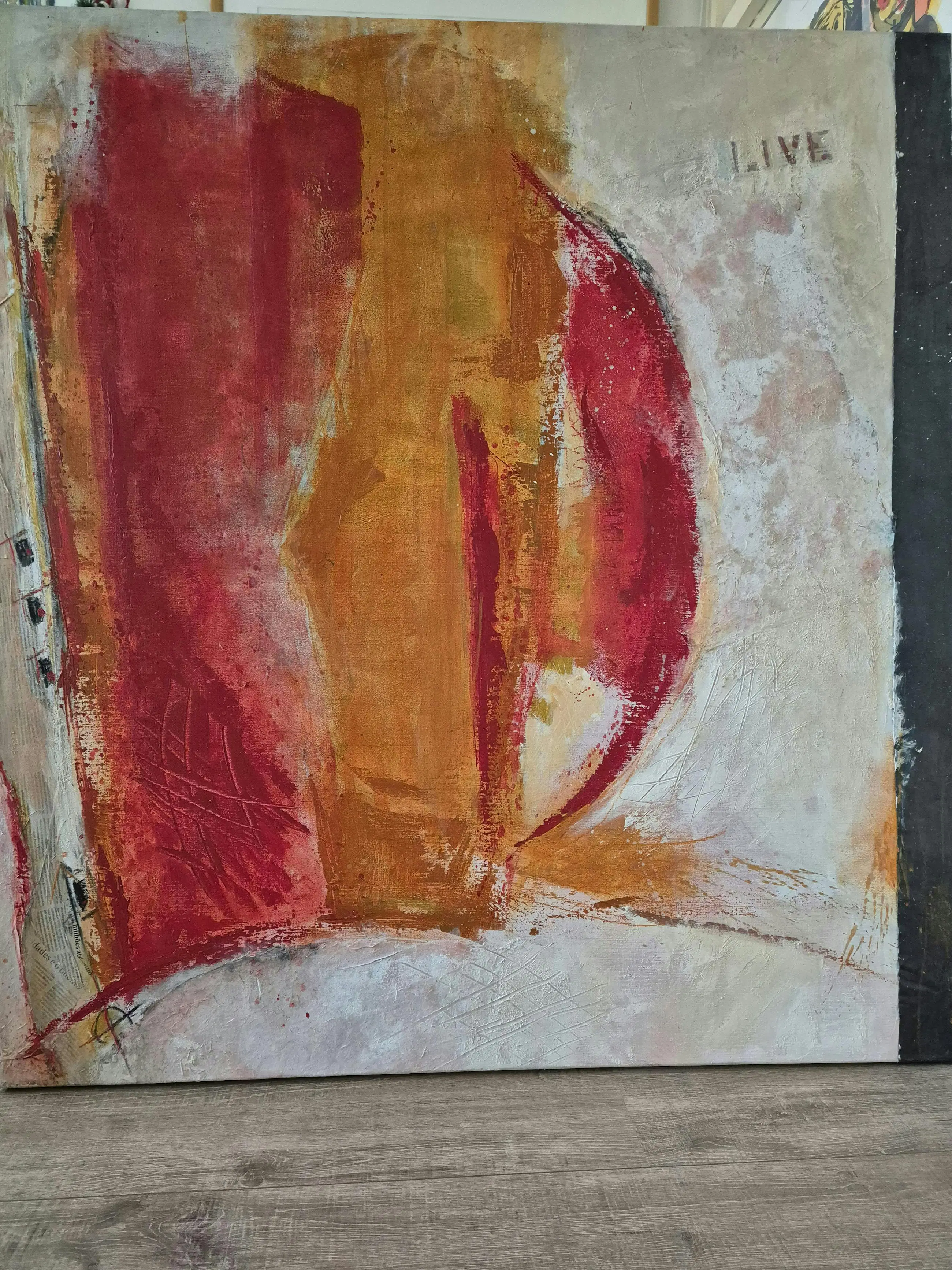 Mooi groot werk van Jacqueline Bozon getiteld LIVE. Het is een gemengde techniek van acrylverf, krantenknipsels zand en bladlood op haar eigen fraaie manier. Het werk is gespannen op een stevig aluminium frame. (120×120×4,5) en getekend op de achterzijde. Kan niet verstuurd worden vanwege maat en fragiliteit. Wel ophalen of brengen.