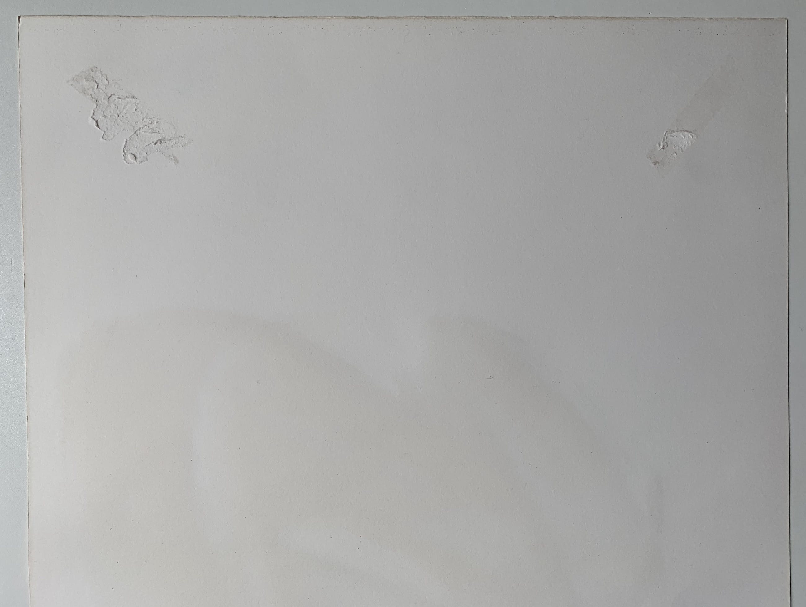 | Door een eerdere inlijsting is er papierschade aan de achterzijde van het werk. Daardoor is het papier op twee plekken redelijk dun geworden. Aan de voorzijde is dit nauwelijks zichtbaar (zie laatste foto). Wanneer het werk weer wordt ingelijst, met een wit karton erachter, zal het wegvallen. | |||||||||||