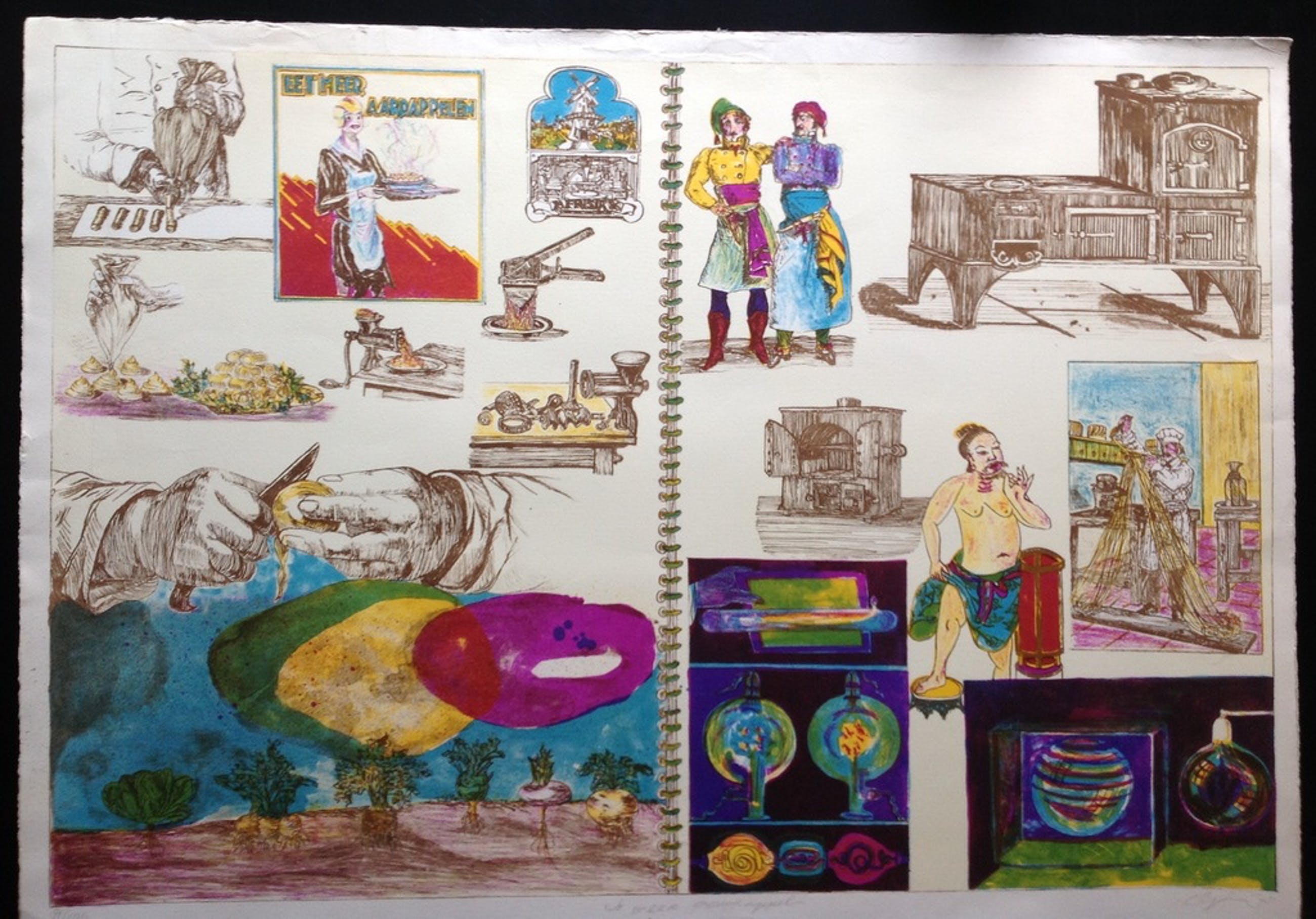 Zeefdruk van Jacqueline de Jong, '75, 'eet meer aardappels', een uit de door 'Prent 190' uitgegeven series. 81/190, gesigneerd. Papier/beeldmaat 77 x 57. Wat kreukels aan de randen.