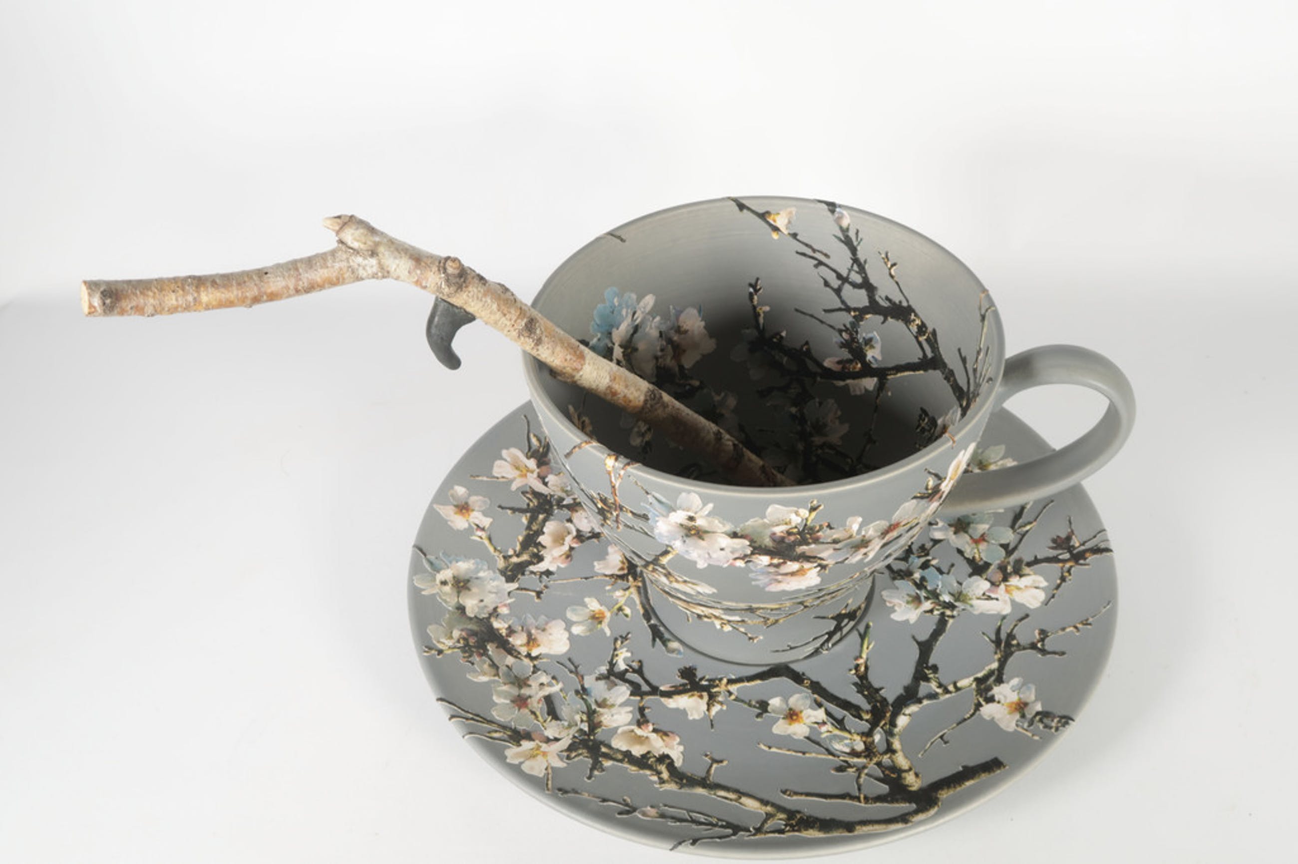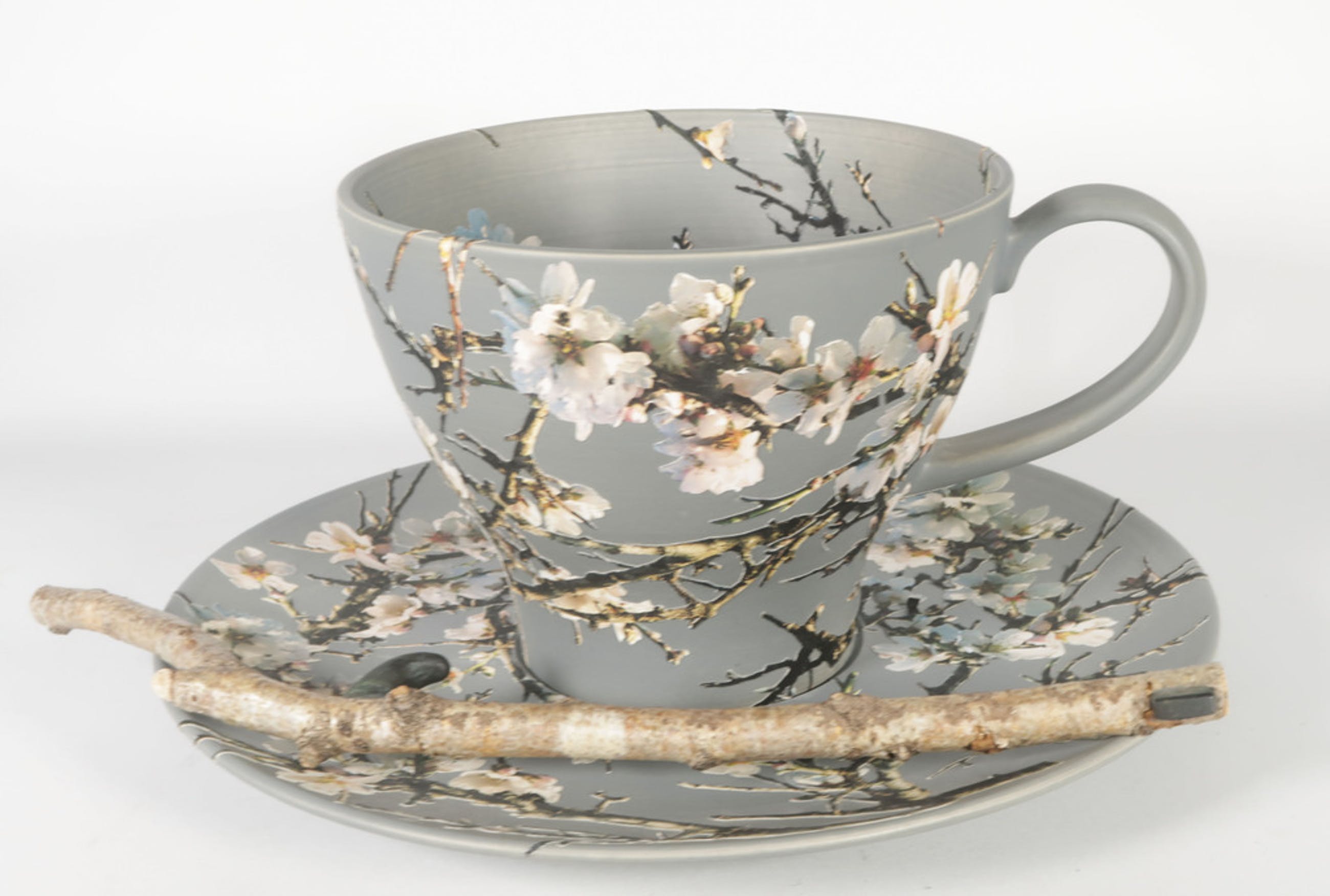 Materiaal: Keramiek: kop en schotel beplakt met uitgeknipte bloemenpatronen + roerstok