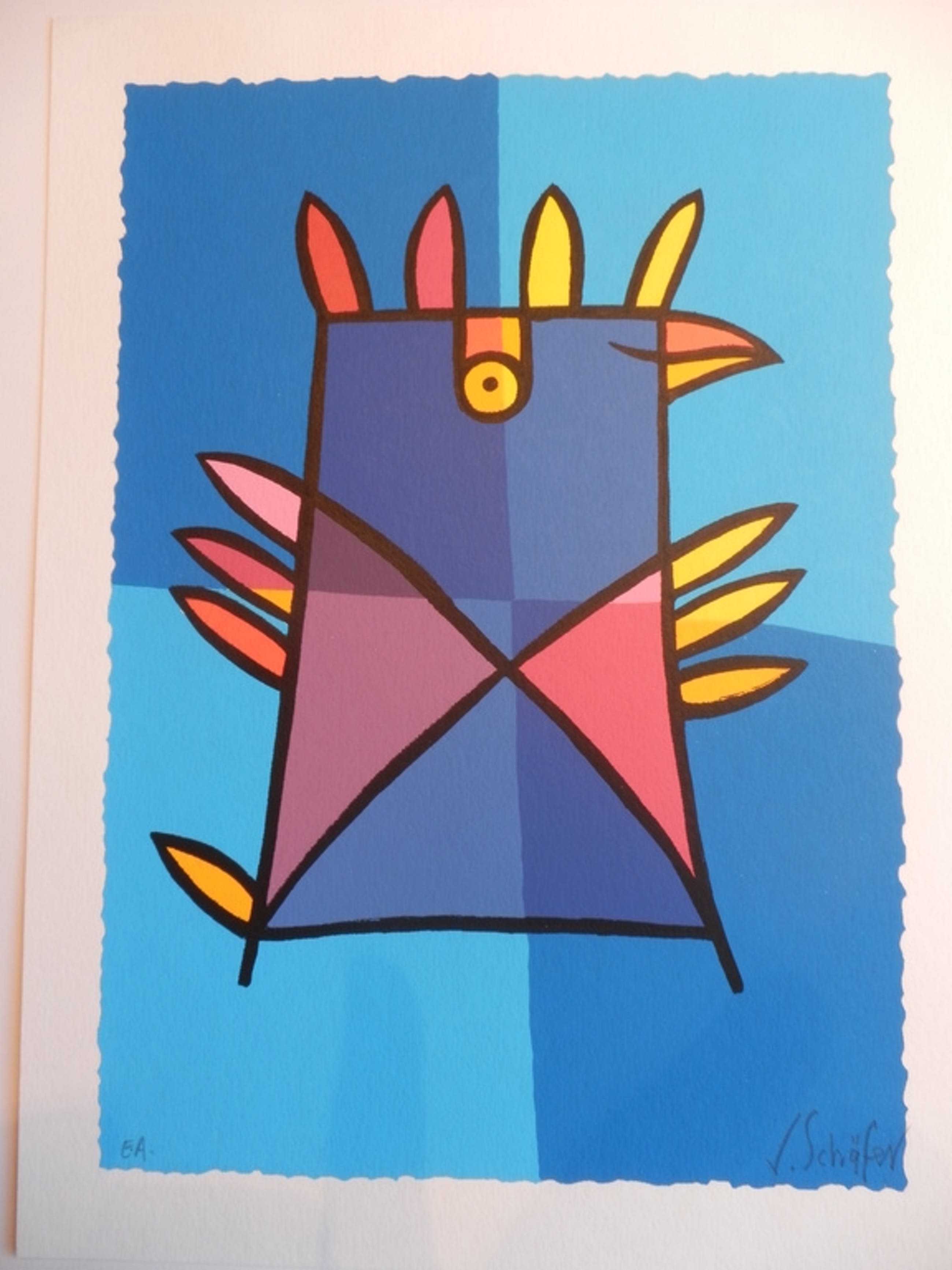 Kleurenzeefdruk Titel:Blauwe Vogel