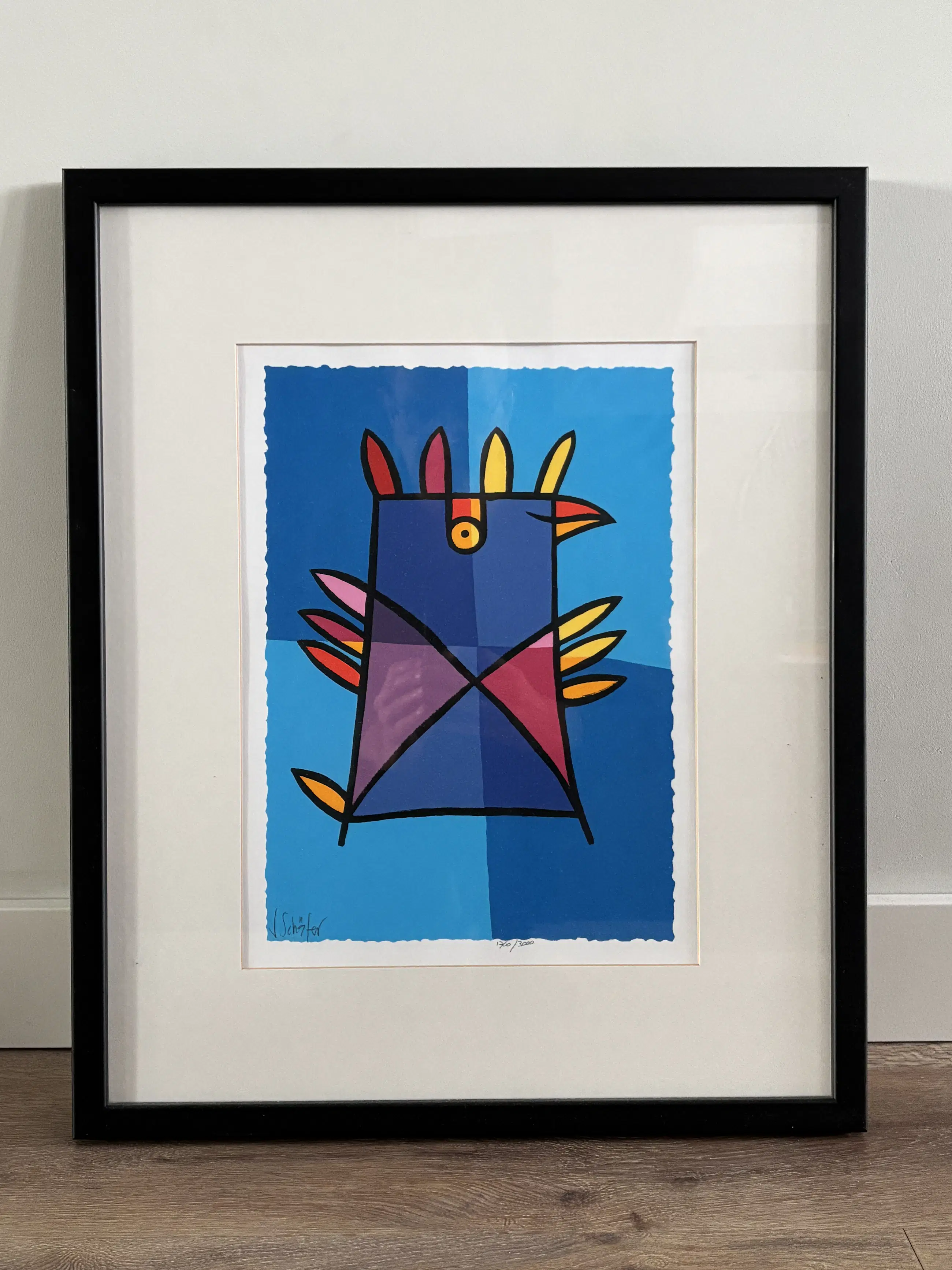 Zeer fraaie kleurenzeefdruk van Jacqueline Schafer Vrolijk, grappig werk van Jacqueline Schäfer uit haar 'vreemde vogel' serie. Jacqueline Schäfer woont en werkt in Amsterdam. Tijdens haar studie ging ze op zoek naar een vormentaal die bij haar paste. Ze vond er haar eigen stijl en ontwikkelde die door de jaren heen. Door het spel van duidelijke vormen, heldere kleuren en sterk gedefinieerde, zwarte contouren onderverdeeld in harmonieuze kleurvlakken is haar werk nu zeer herkenbaar. Sinds 2004 maakt de kunstenares ook beeldjes van o.a. de Vreemde Vogels. Voor haar is dit een nieuwe artistieke uitdaging. Uit al haar werk spreekt duidelijk Schäfers heldere en positieve liefde voor het leven in een complexe moderne maatschappij.