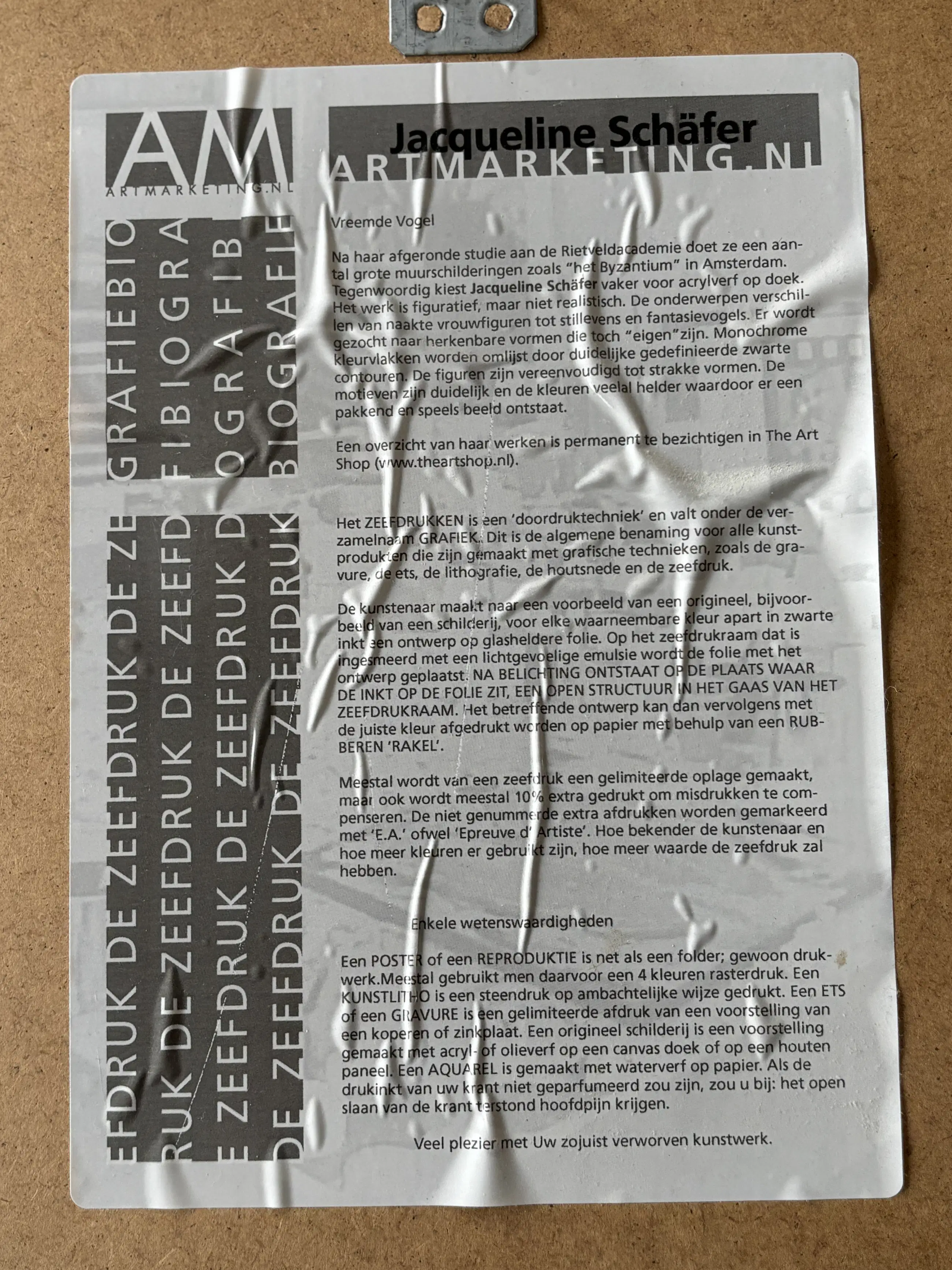 Het werk is af te halen op locatie. Als koper dient u zelf verpakkingsmateriaal mee te nemen. De locatie is: Emmen, Nederland